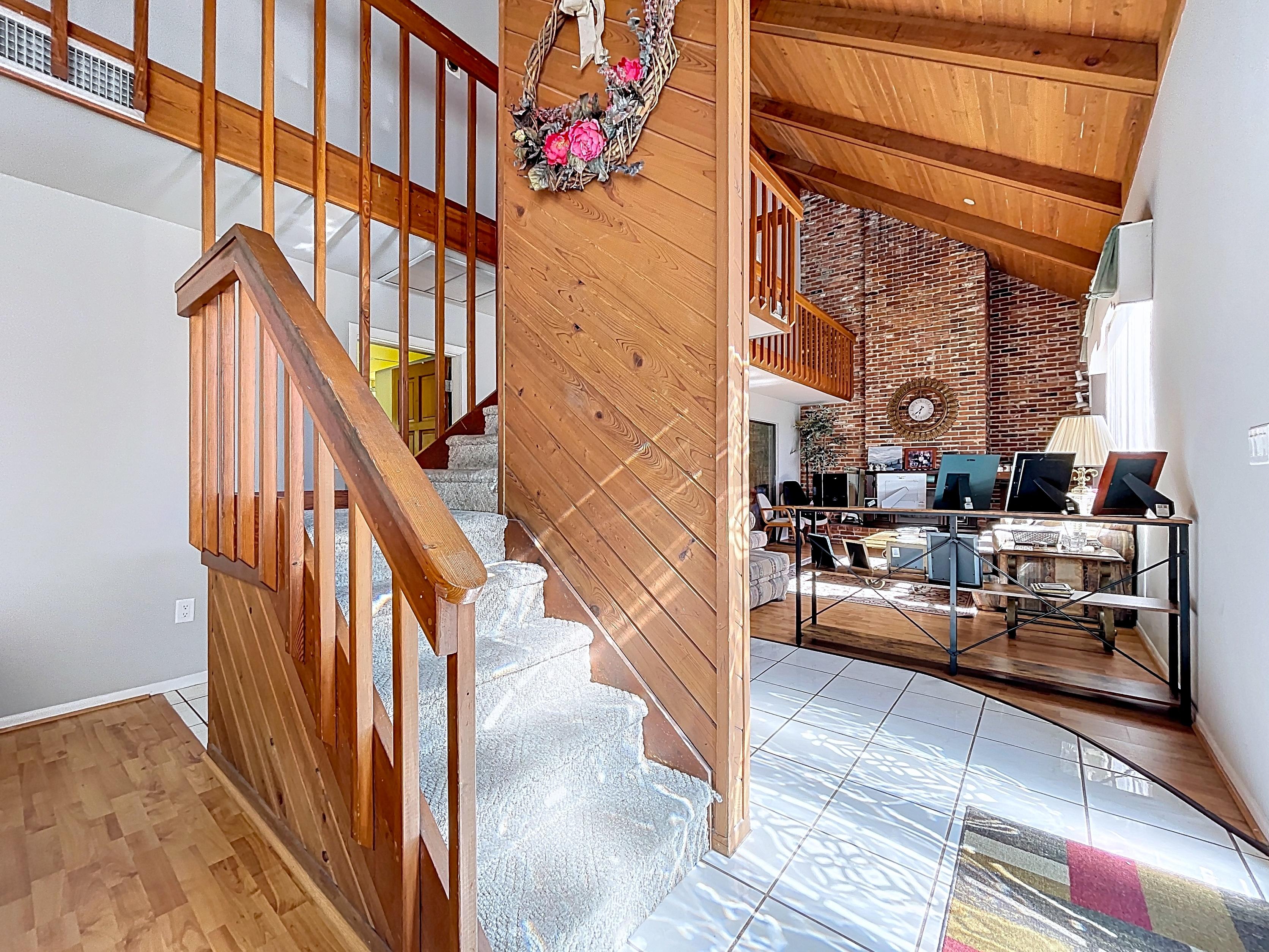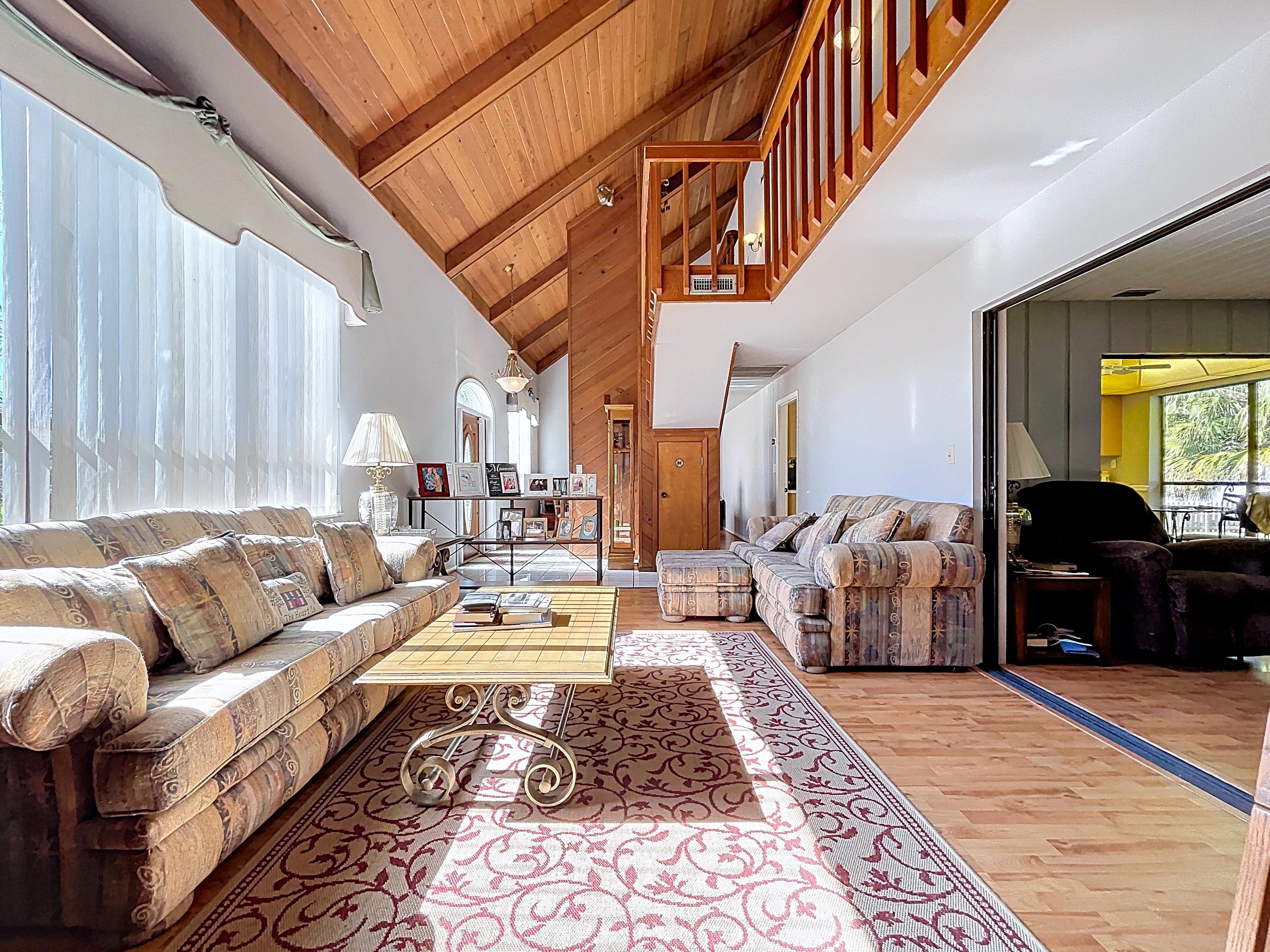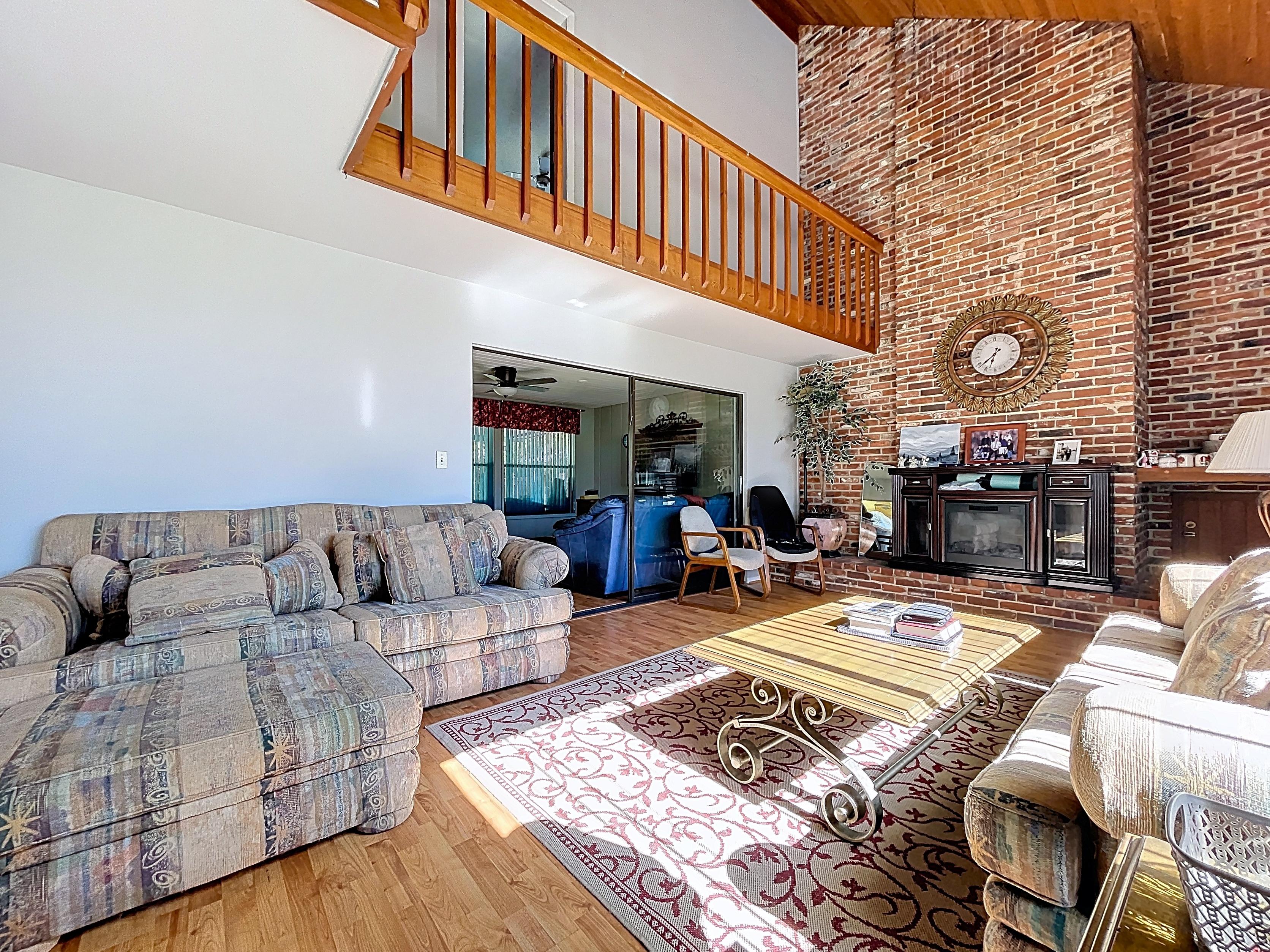 The current home features 3,540 square feet under roof, highlighted by a spacious living room with vaulted ceilings and a towering brick fireplace. The layout includes three bedrooms and two full bathrooms on the second level, along with a versatile fourth room that can serve as an office, playroom, or additional bedroom. The main floor provides functional living space, including a kitchen, an adjacent half bath, a laundry room, and a family room that opens to a lanai, as well as a large two-car garage.