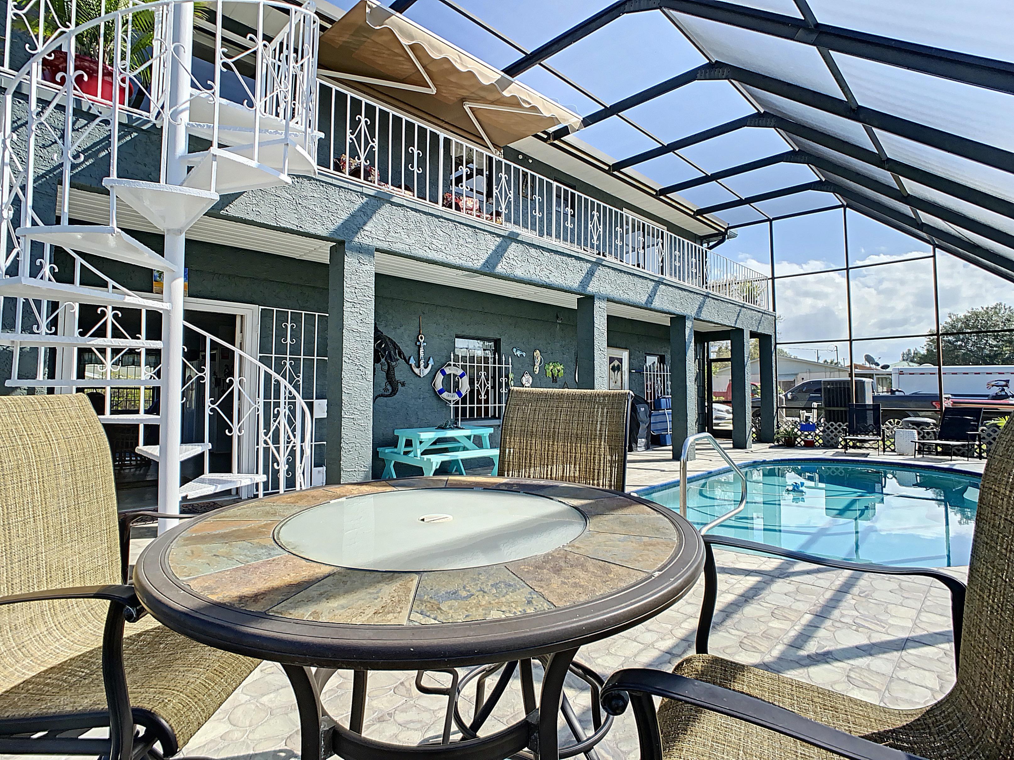 French doors to the screened-in lanai and pool. There is a high and dry dock with a walk-around deck, floating dock, davits.