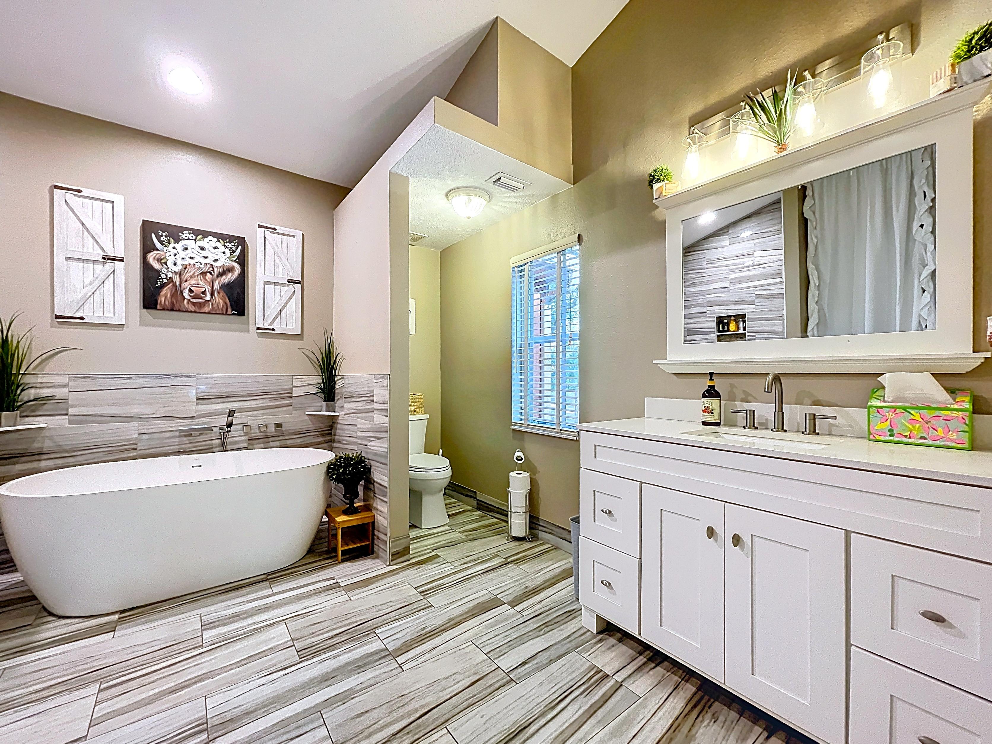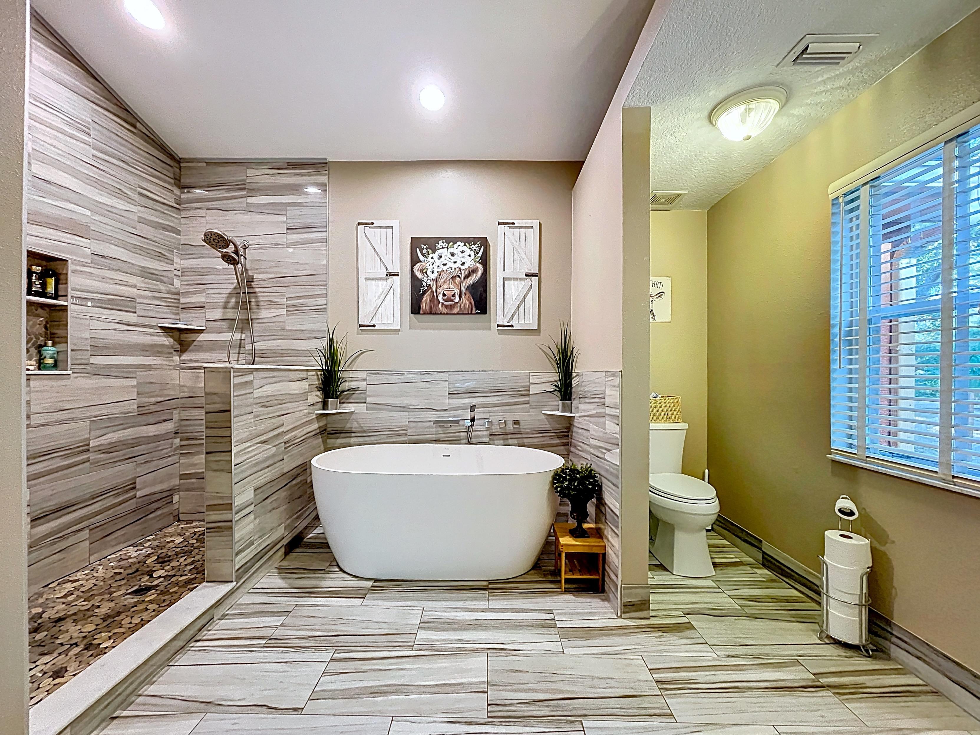 β Primary suite with updated spa-style bath including soaking tub and separate walk-in shower