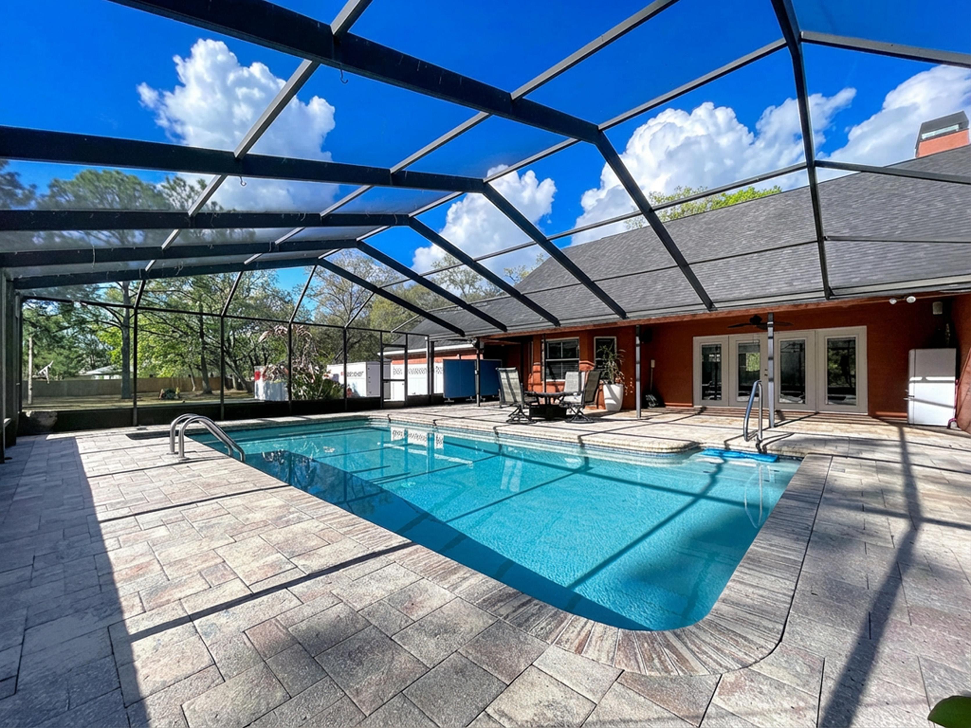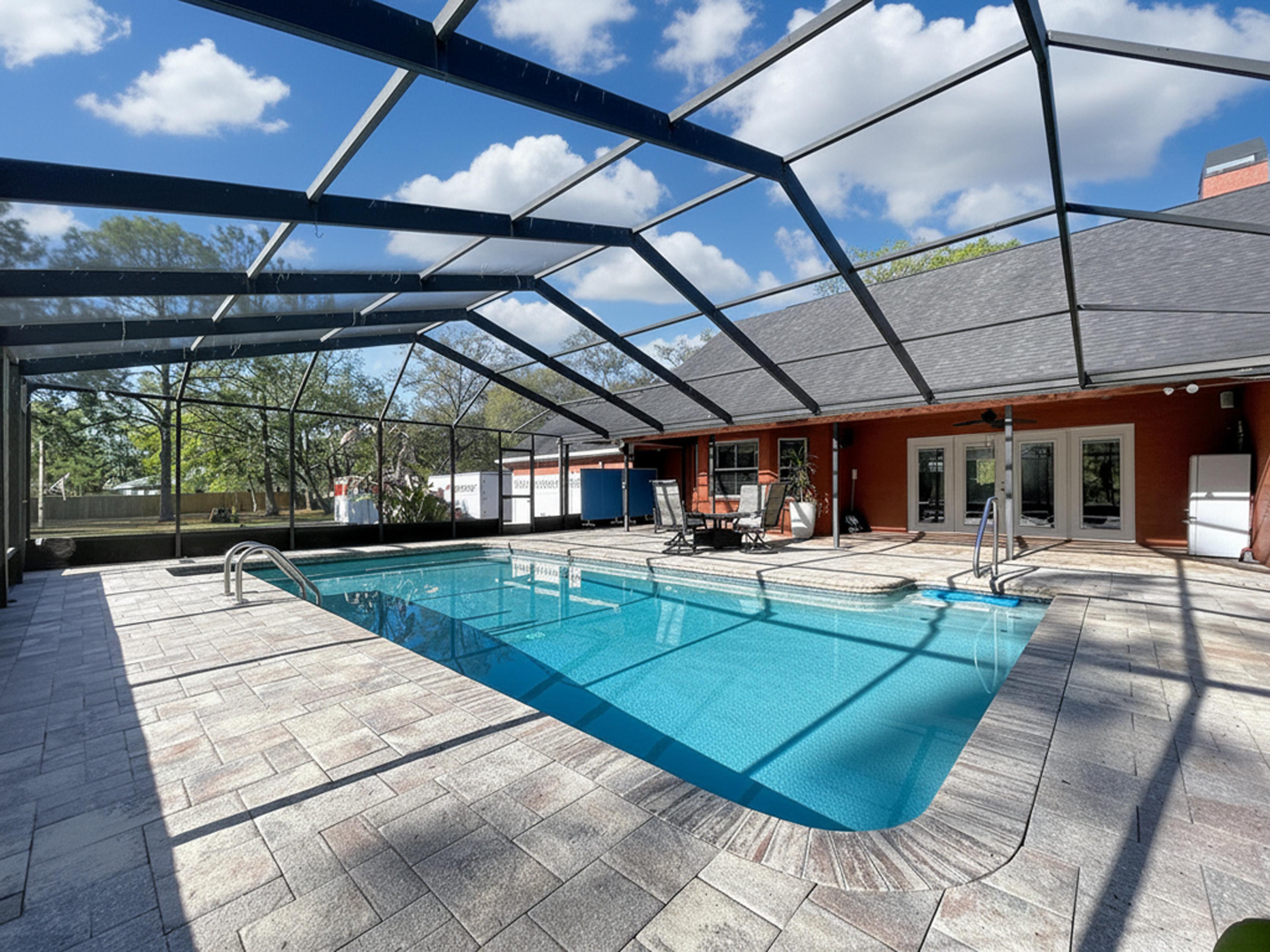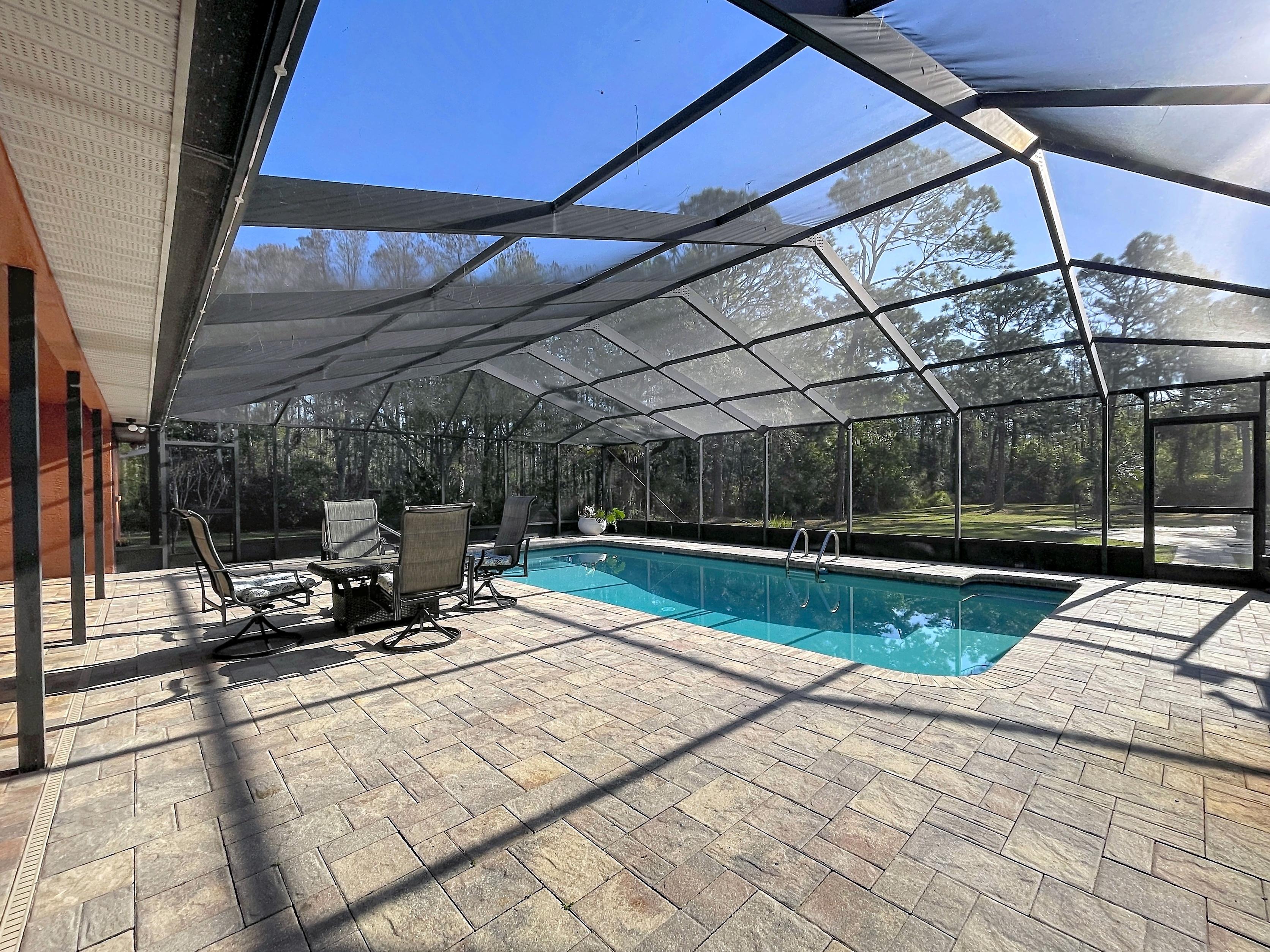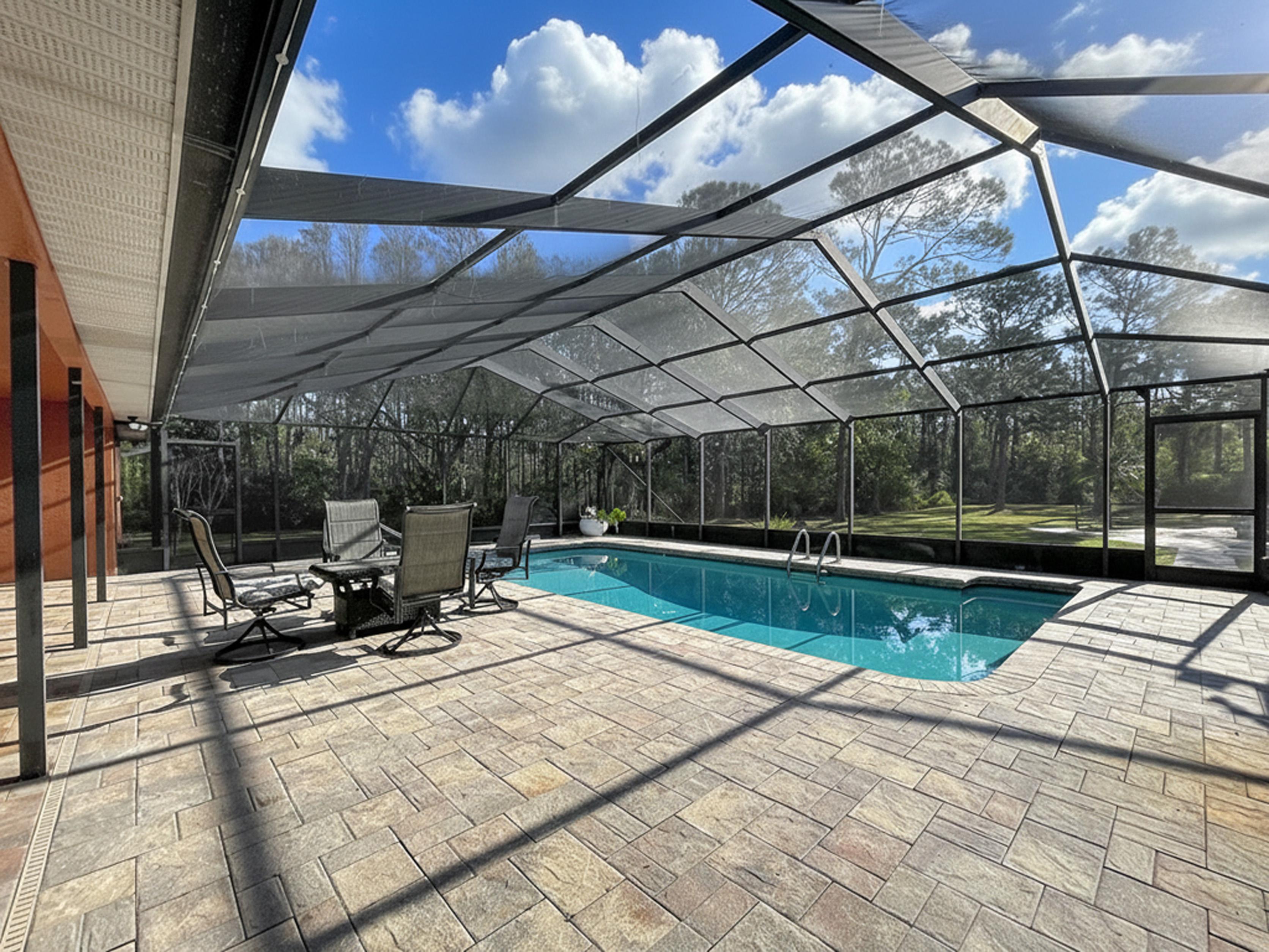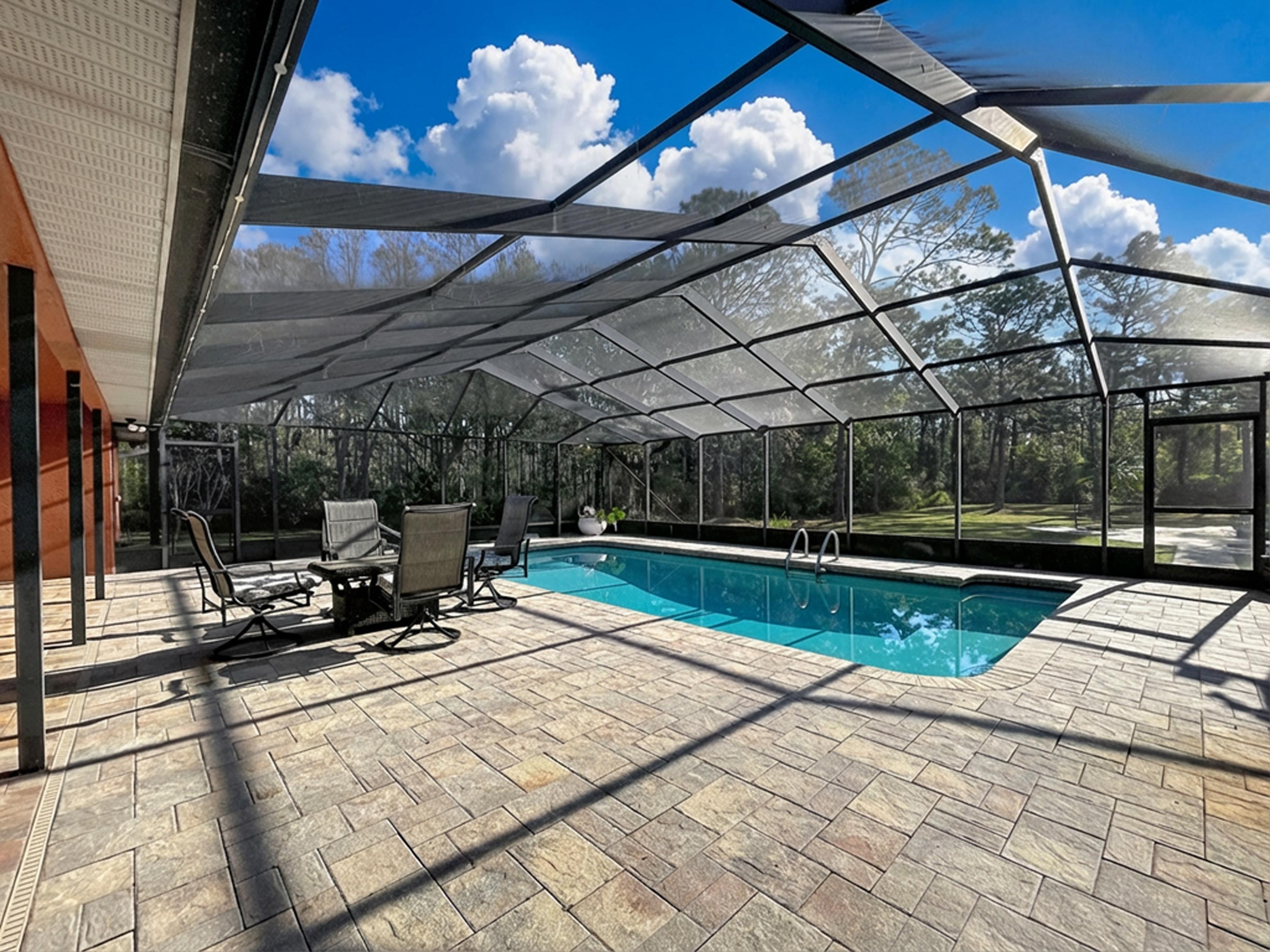 β Screened caged pool with paver patio creating a private outdoor entertaining area