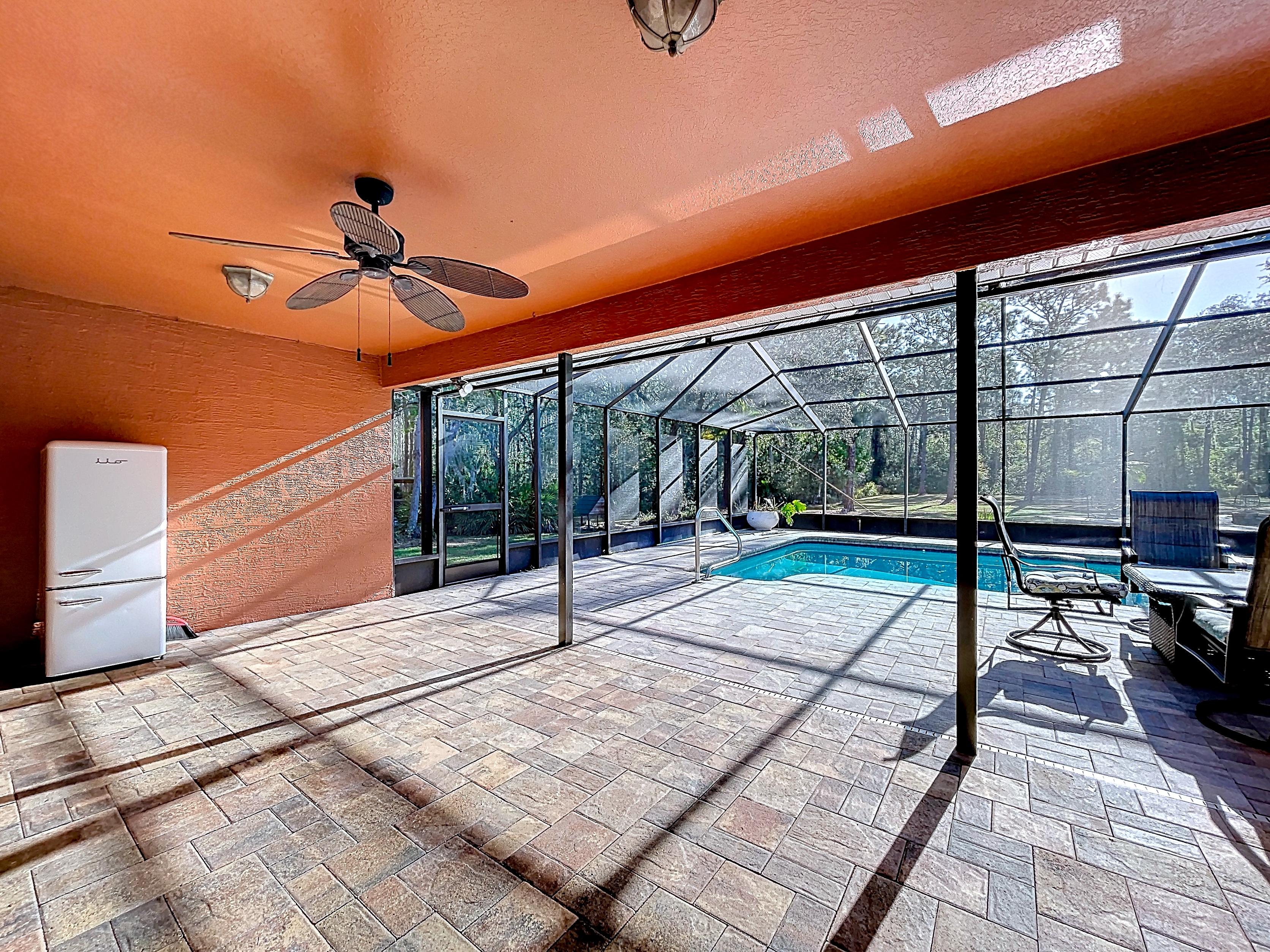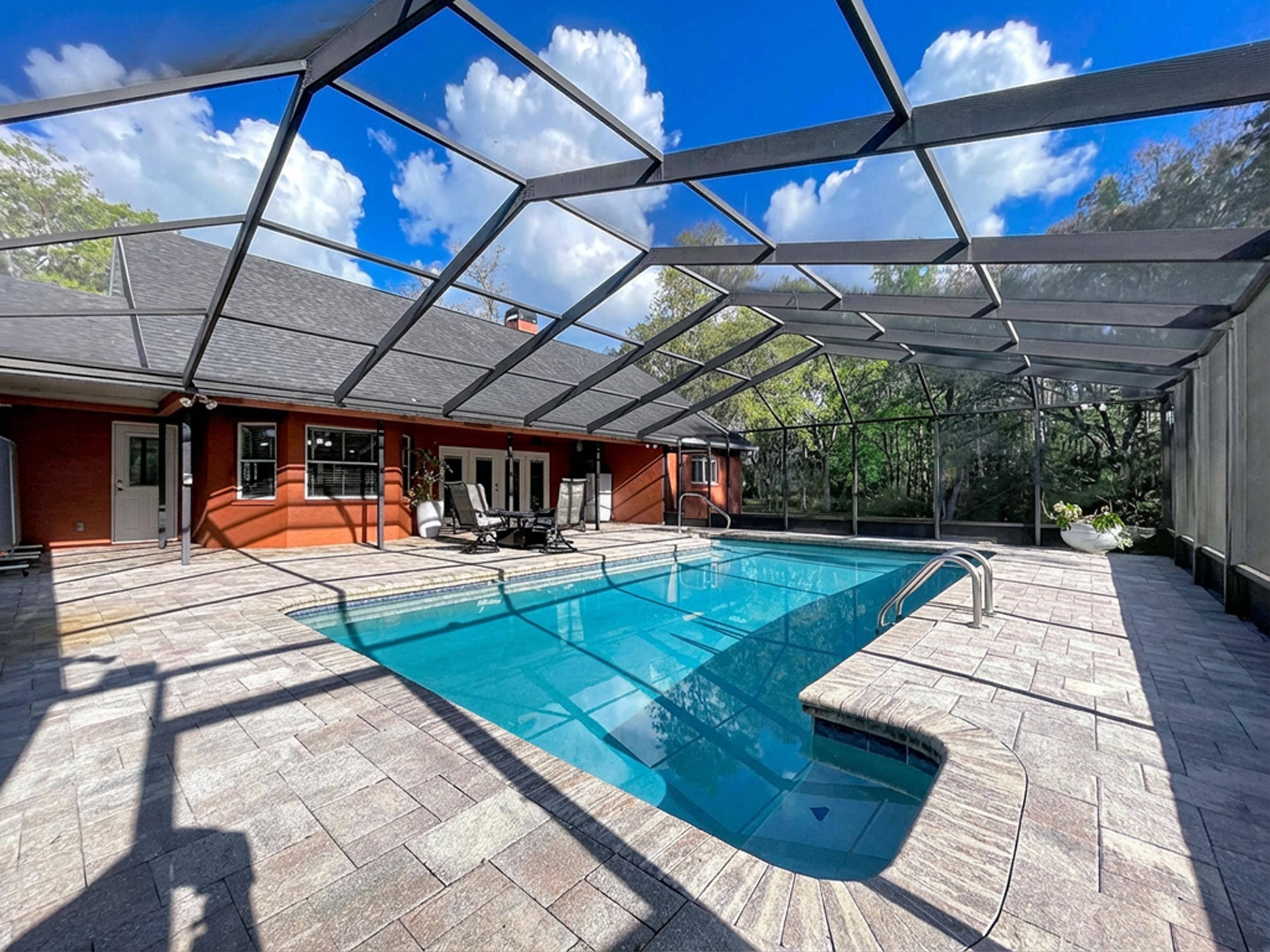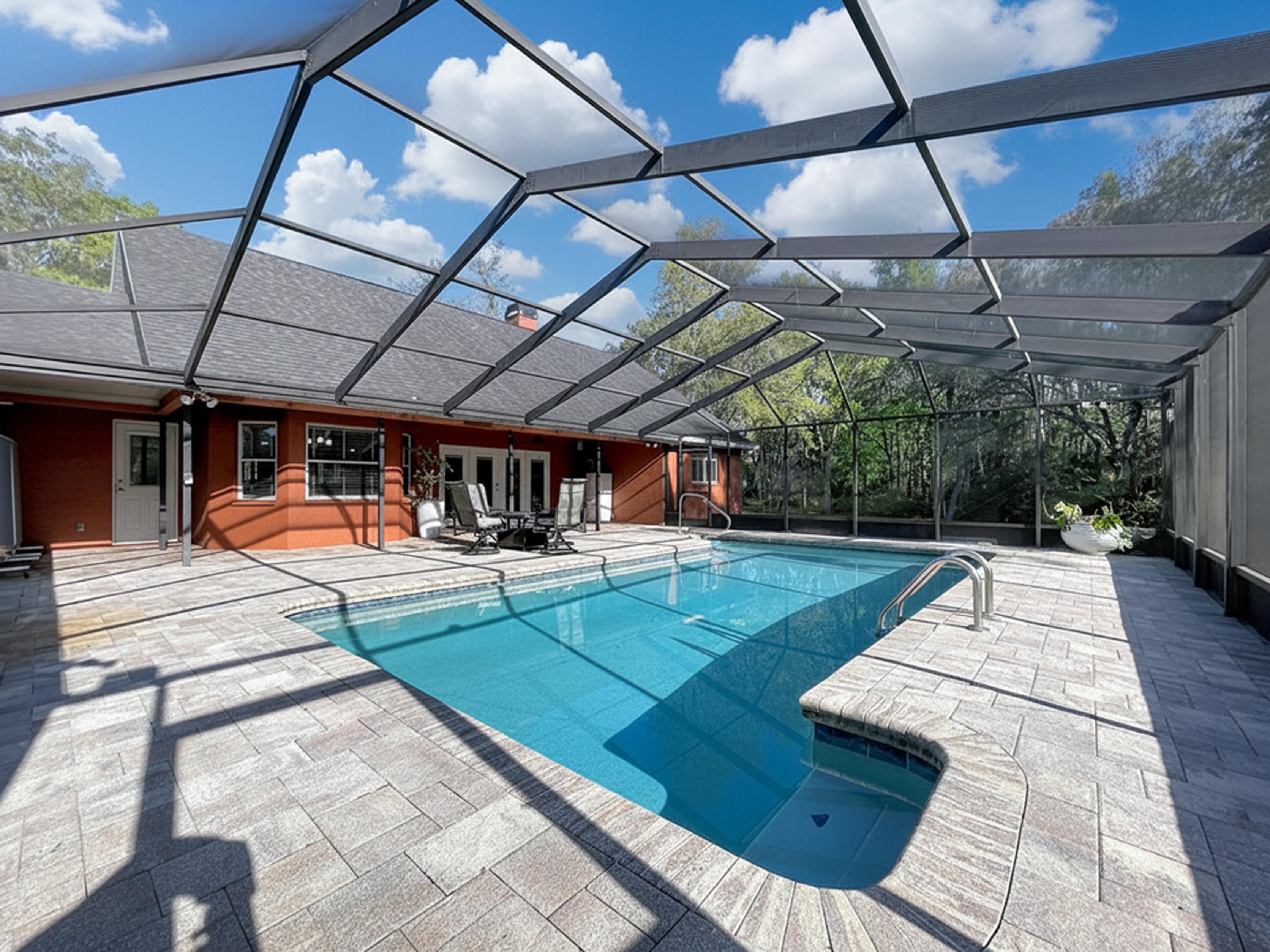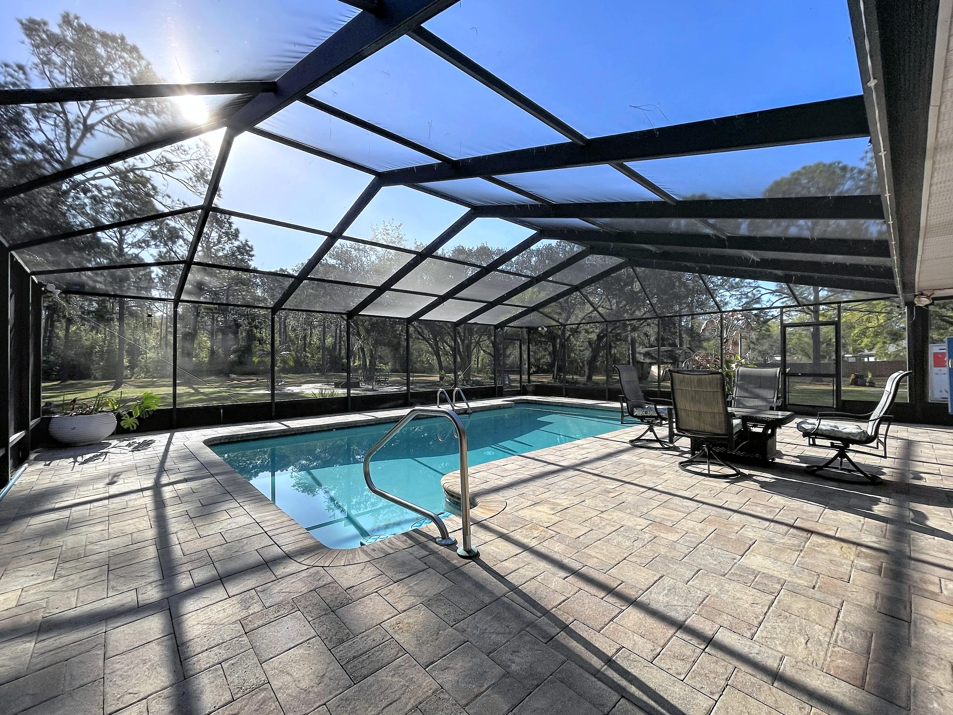 β Screened caged pool with paver patio creating a private outdoor entertaining area