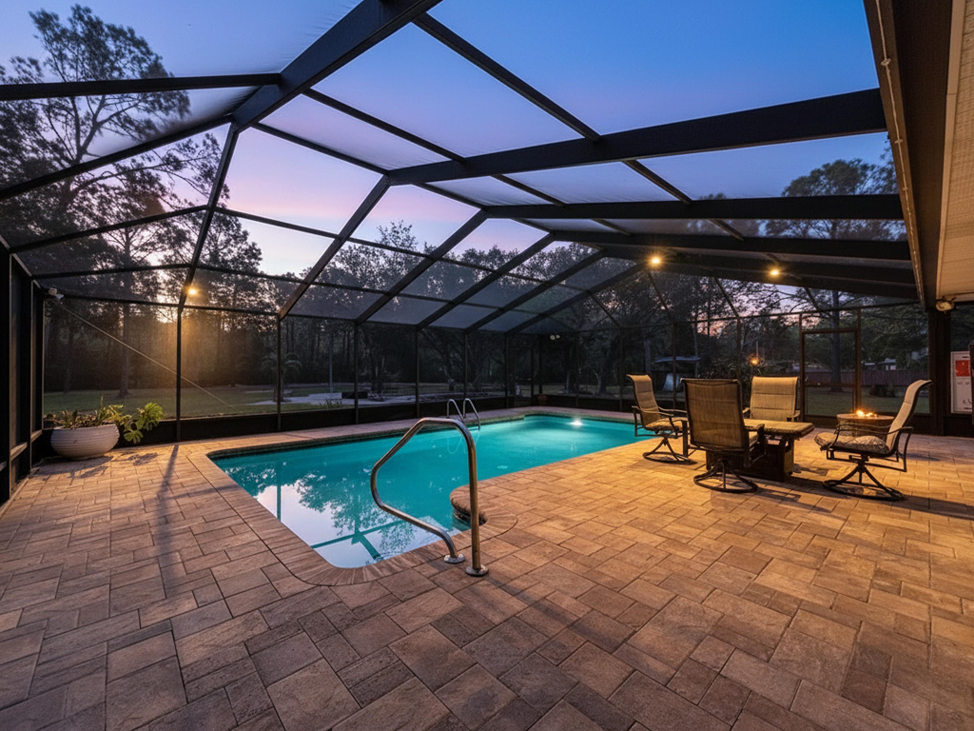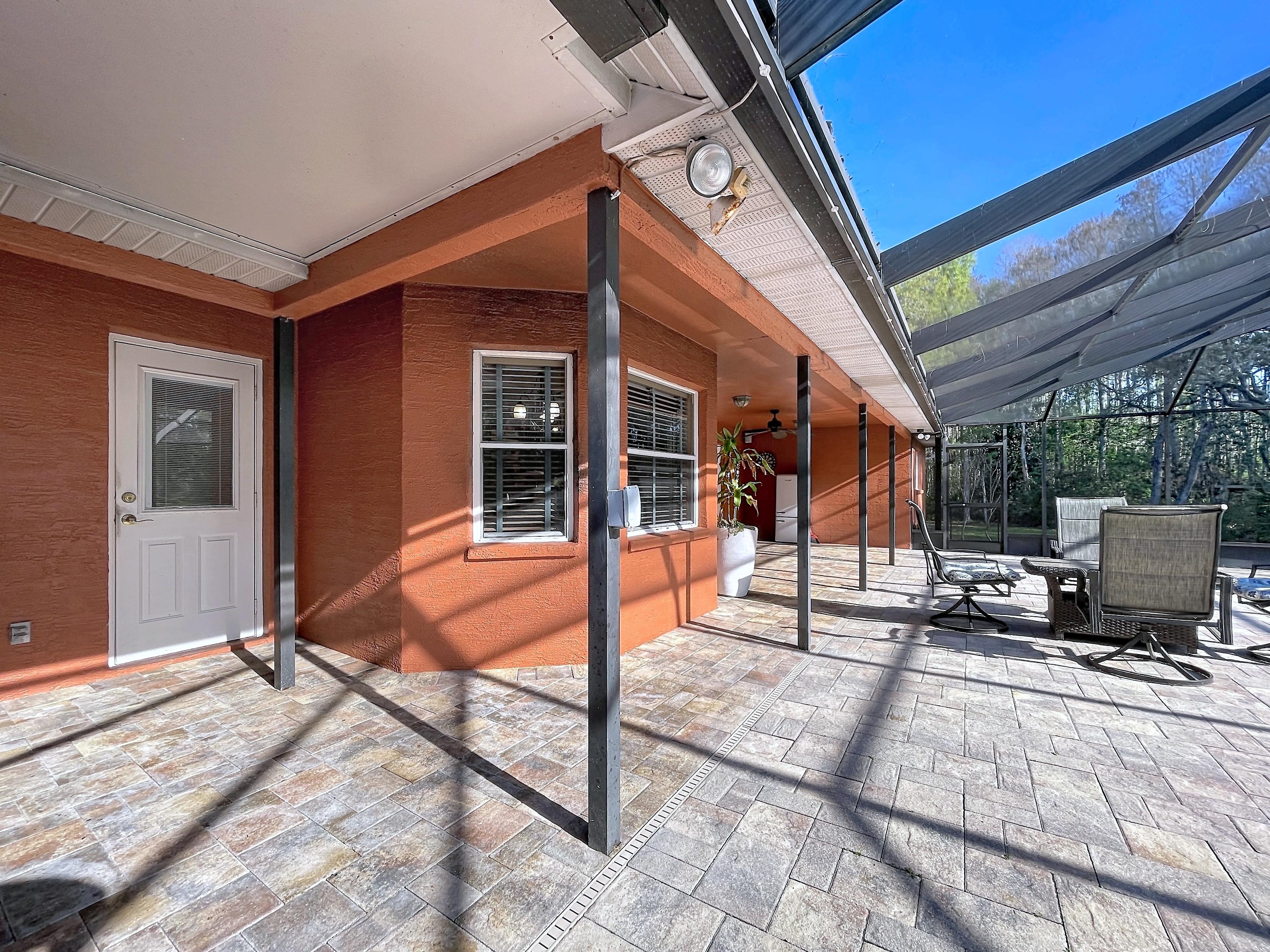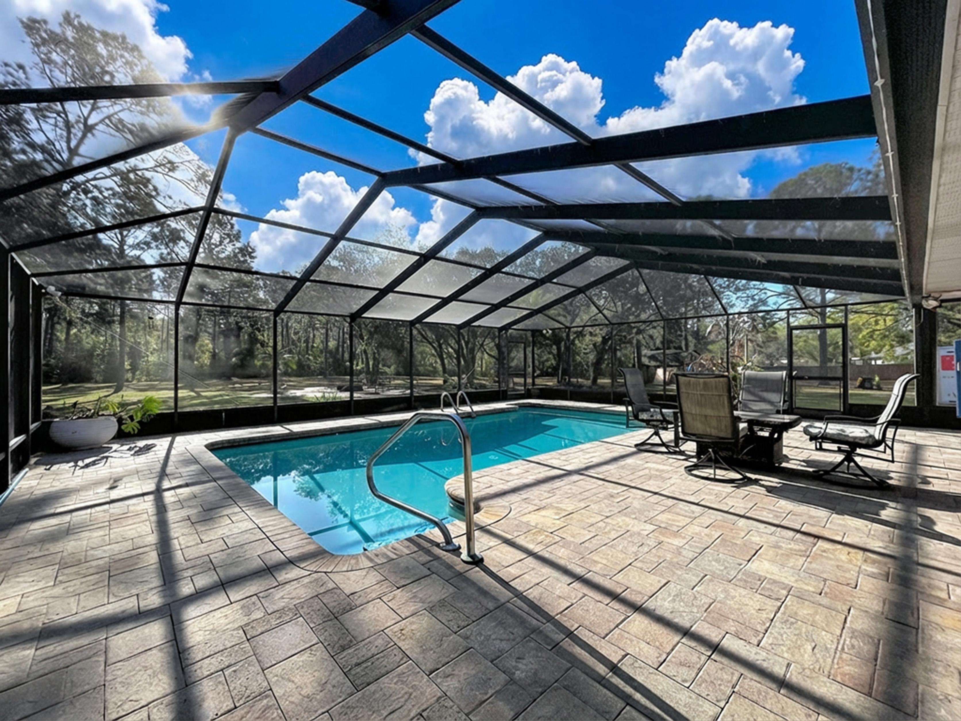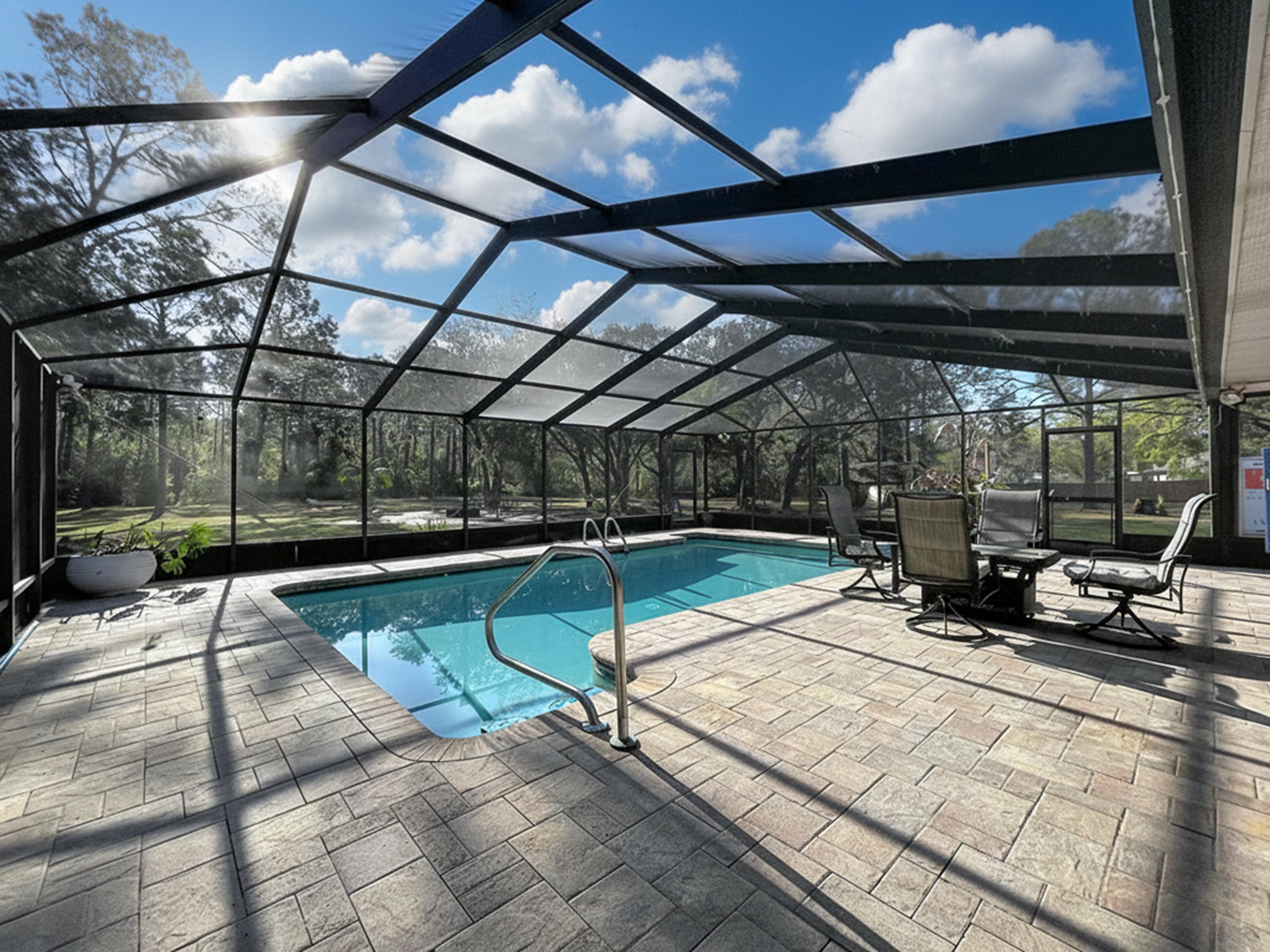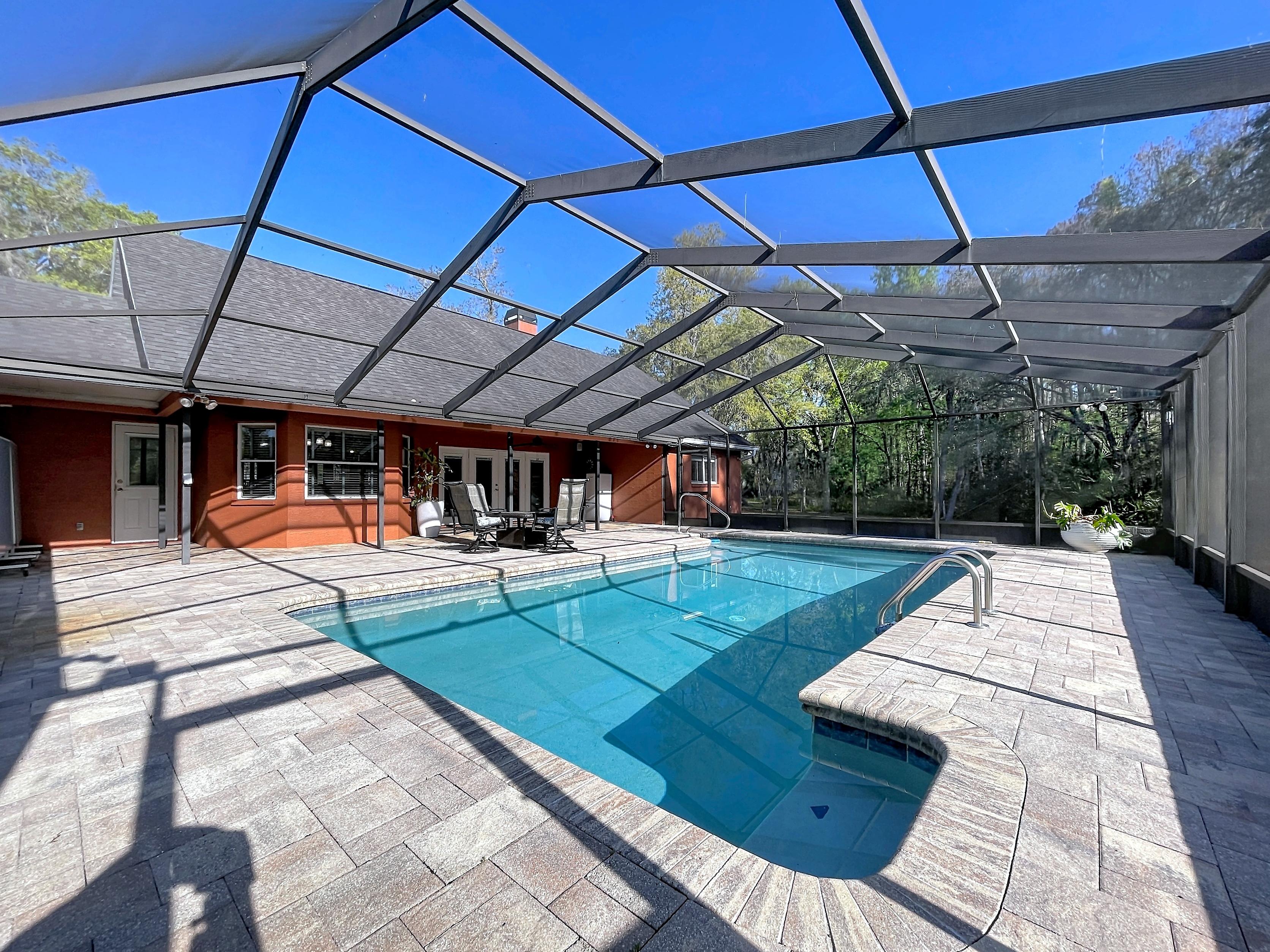 β Screened caged pool with paver patio creating a private outdoor entertaining area