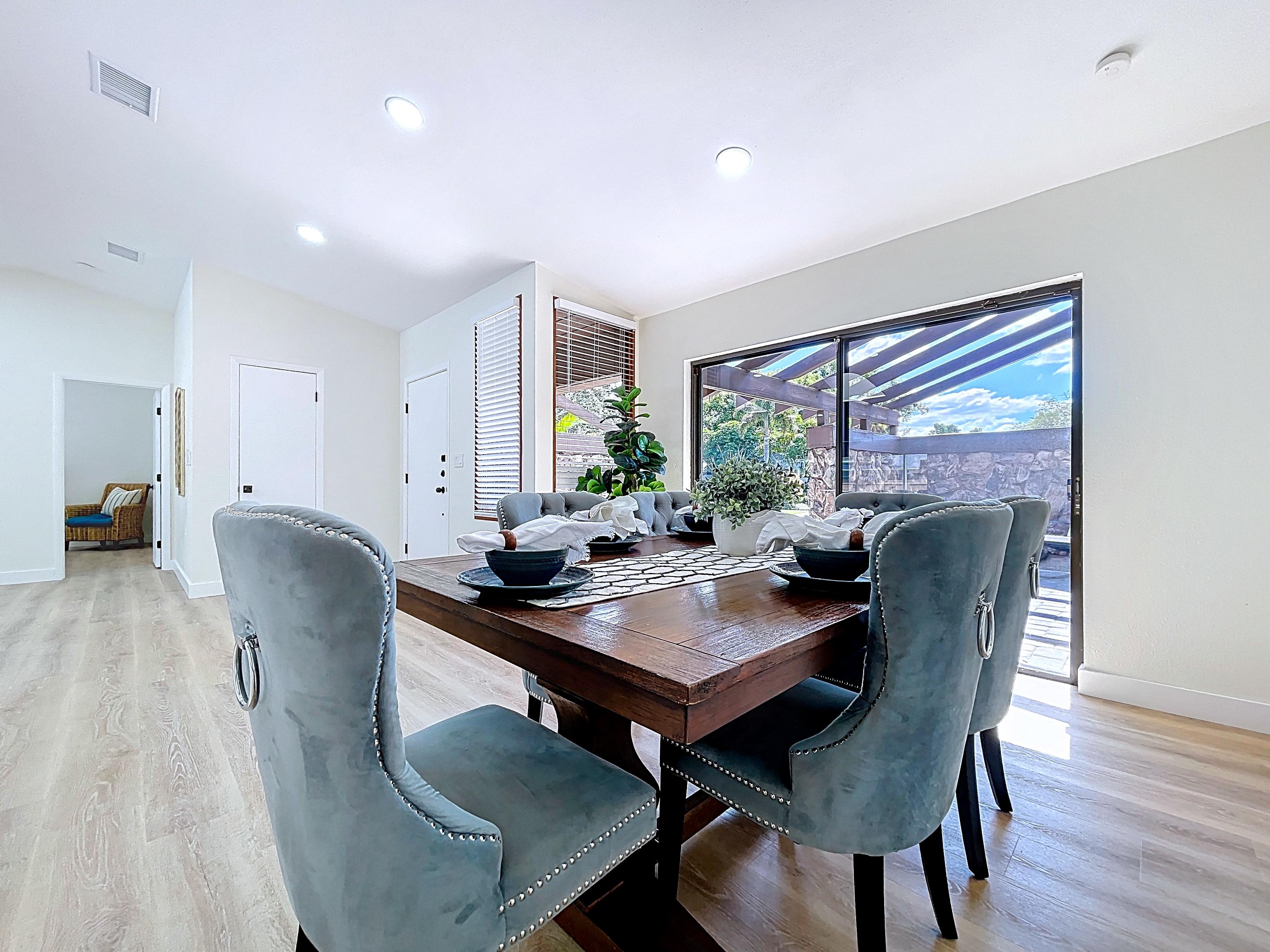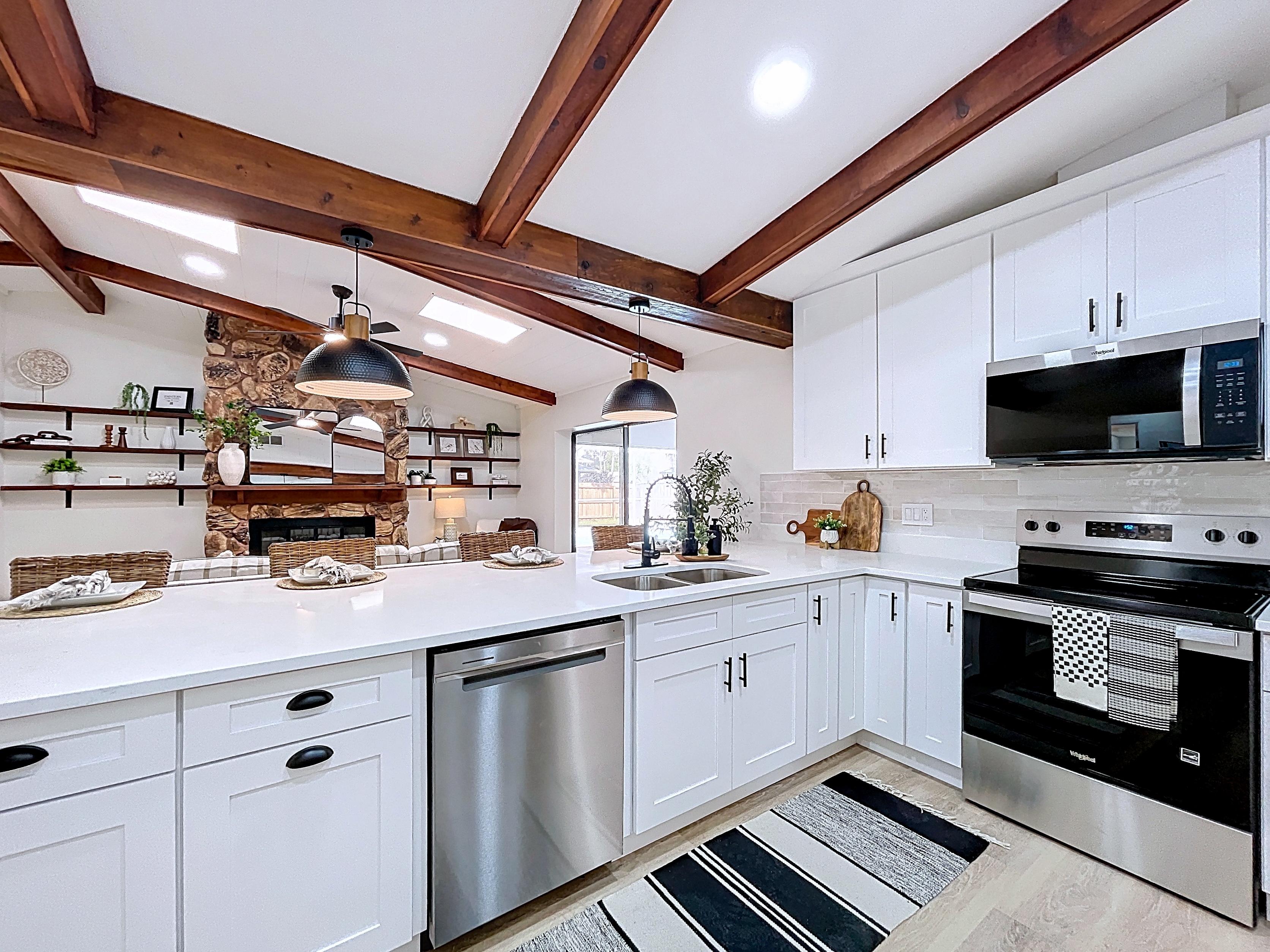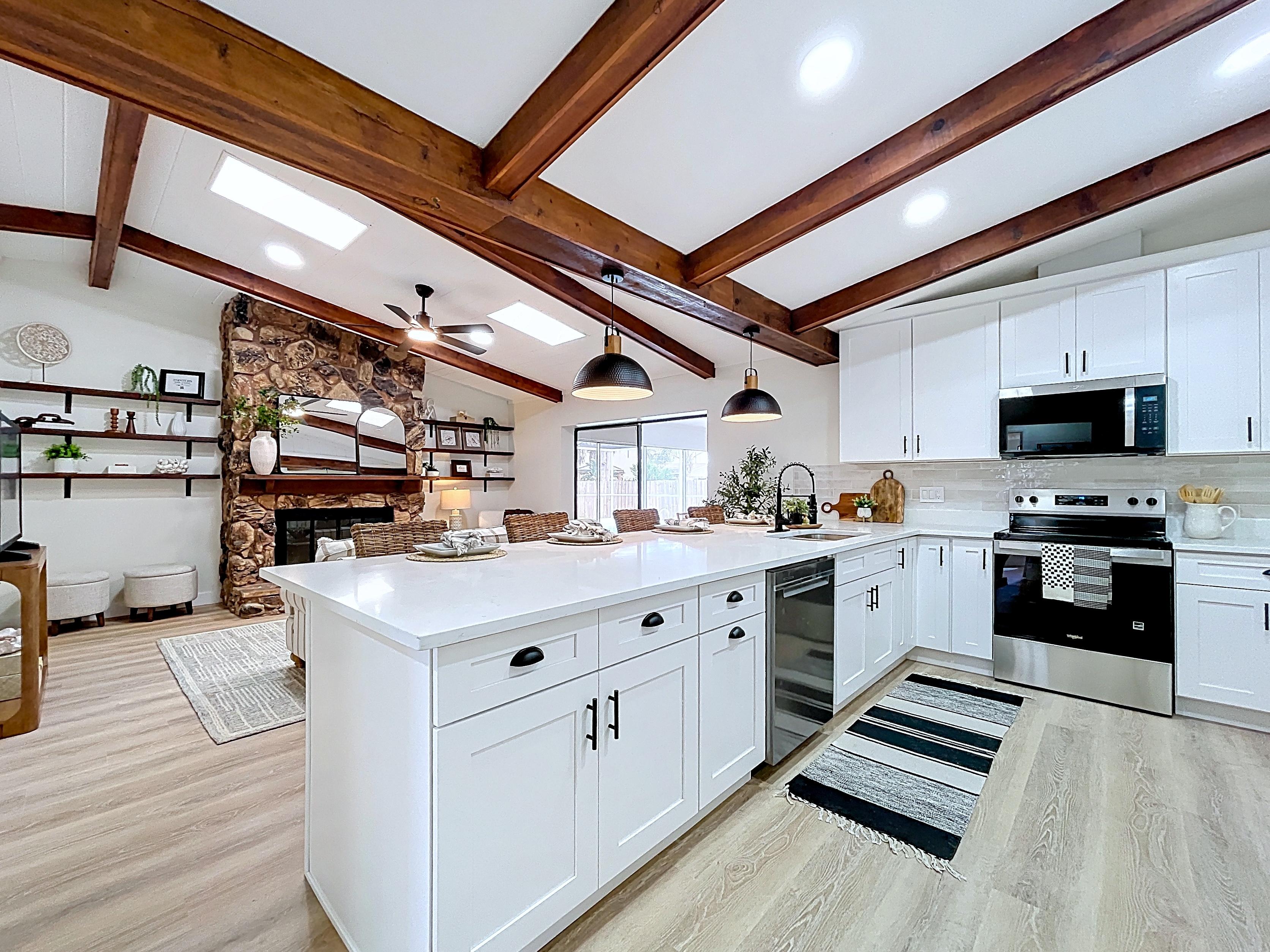 β Spacious open living and dining areas with vaulted ceilings and natural light