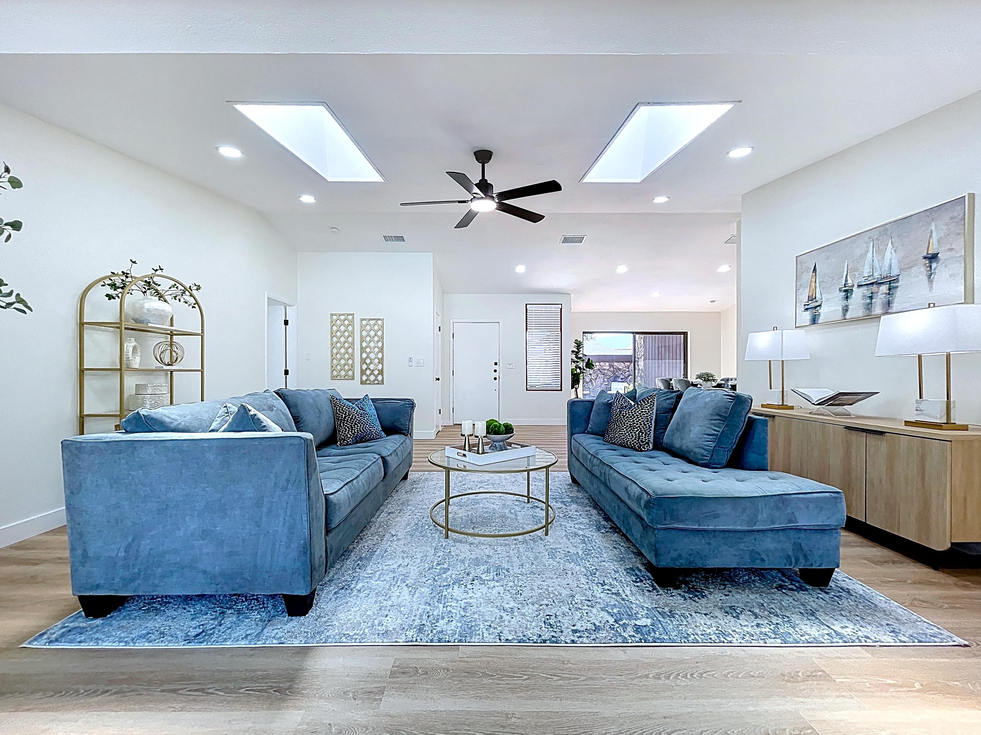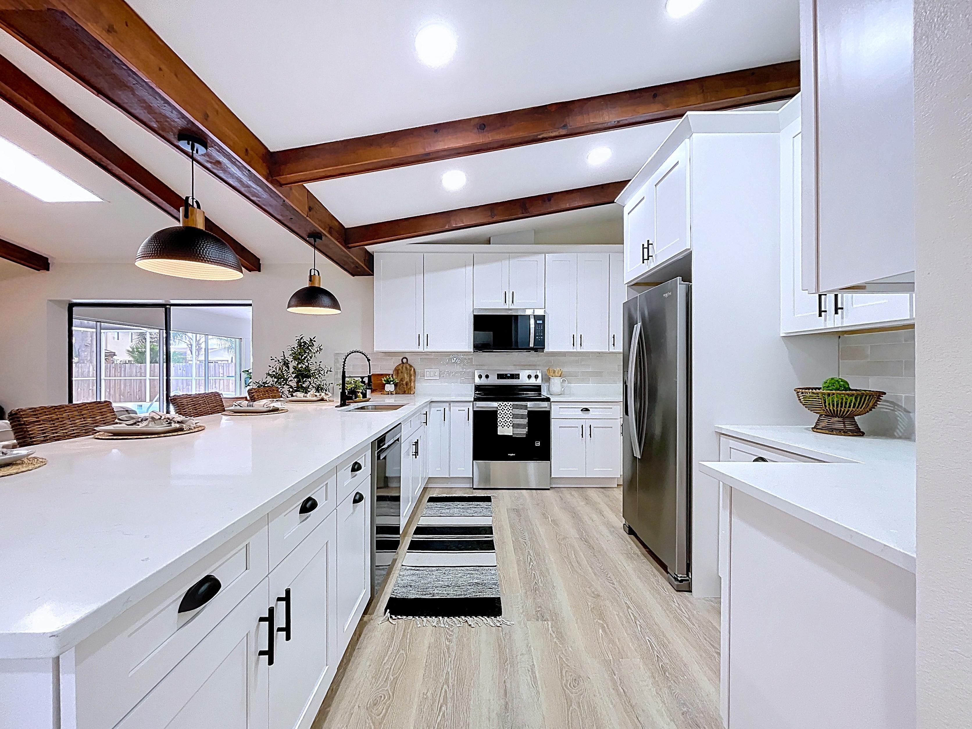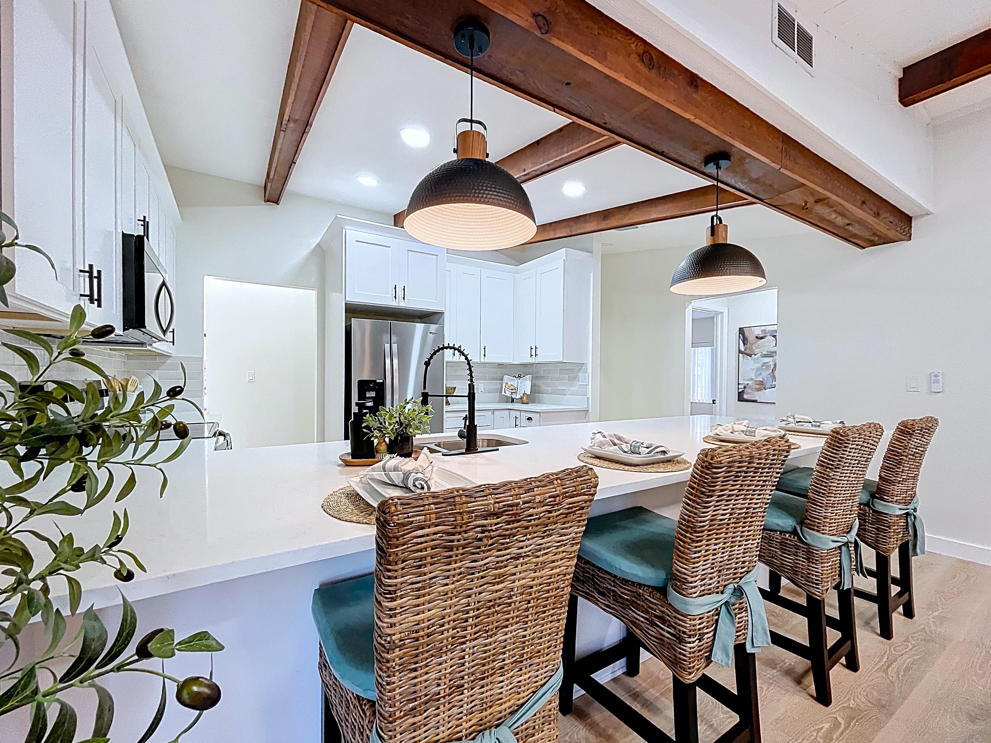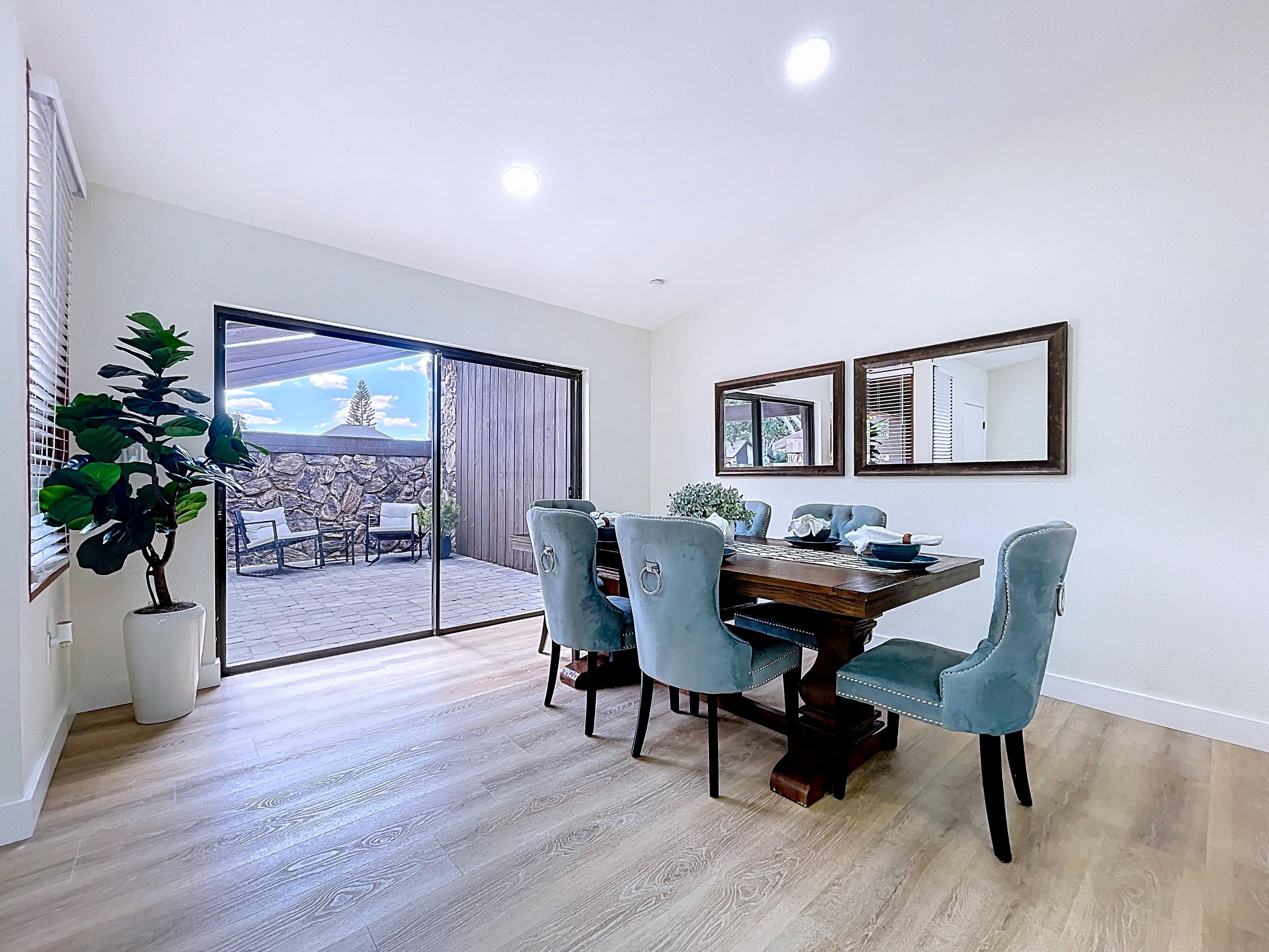 β Spacious open living and dining areas with vaulted ceilings and natural light