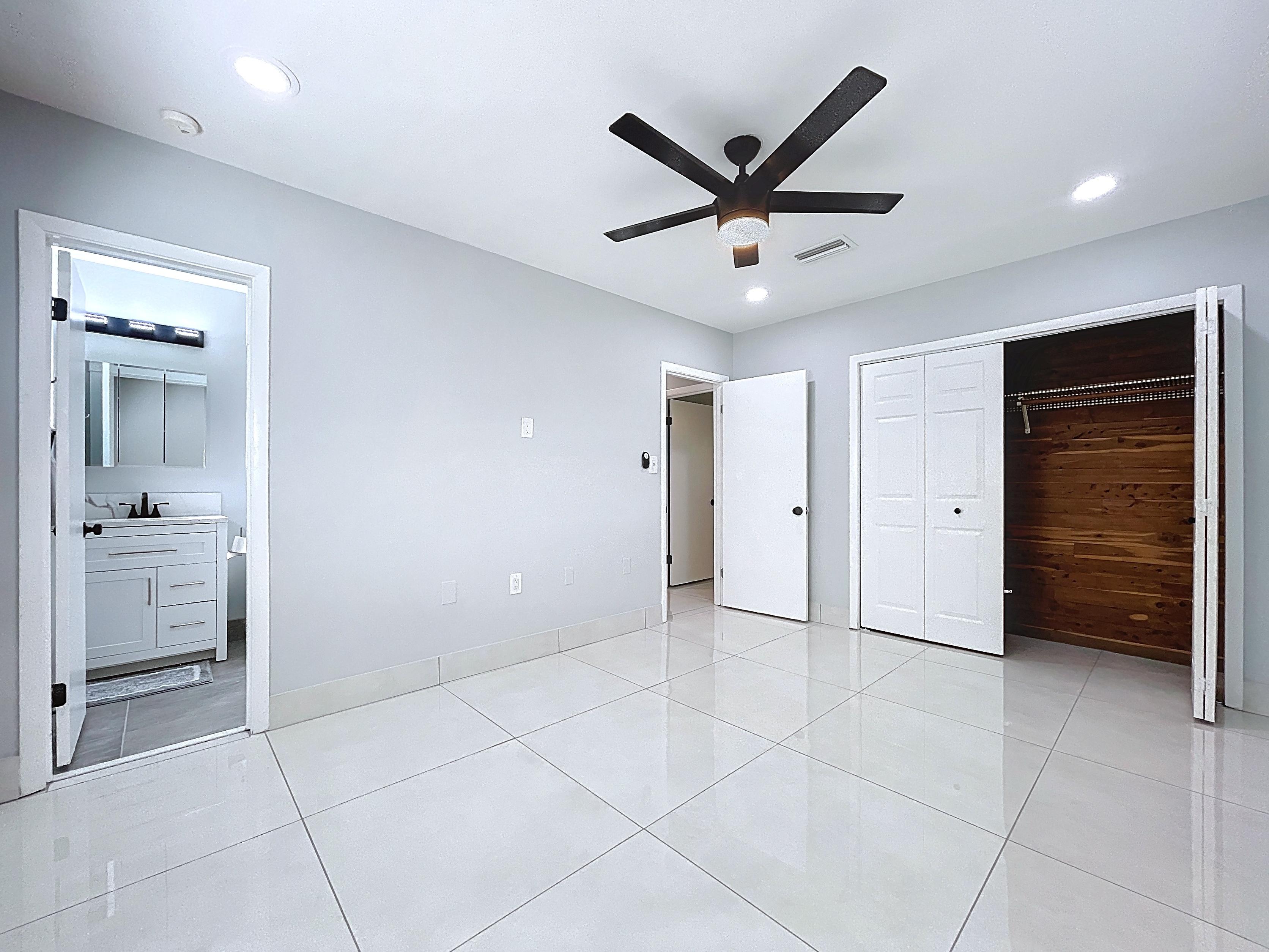 β Spacious master suite with cedar-wood closet, ceiling fan, and en-suite bathroom featuring a large step-in shower with dual heads and a built-in bench
