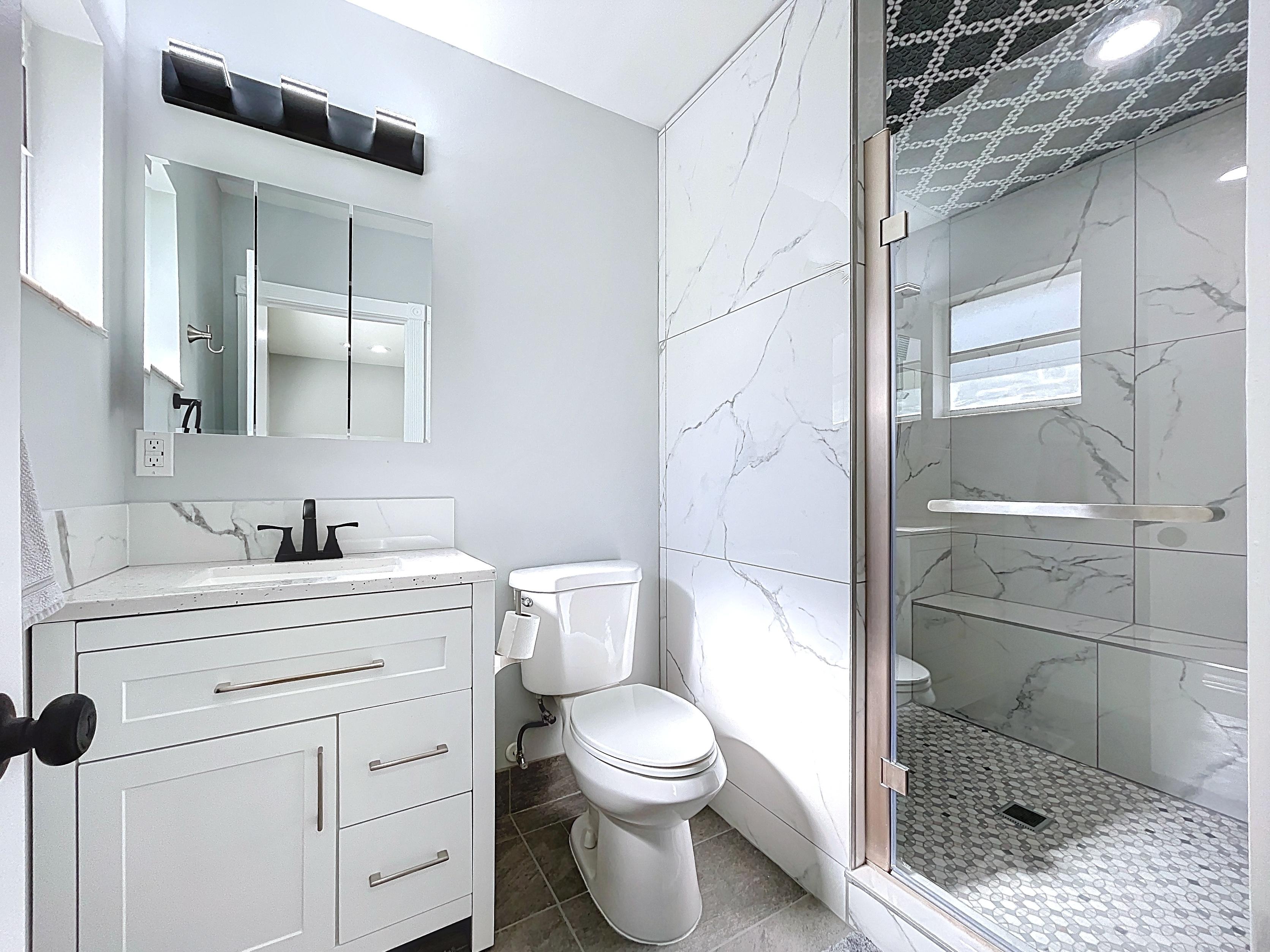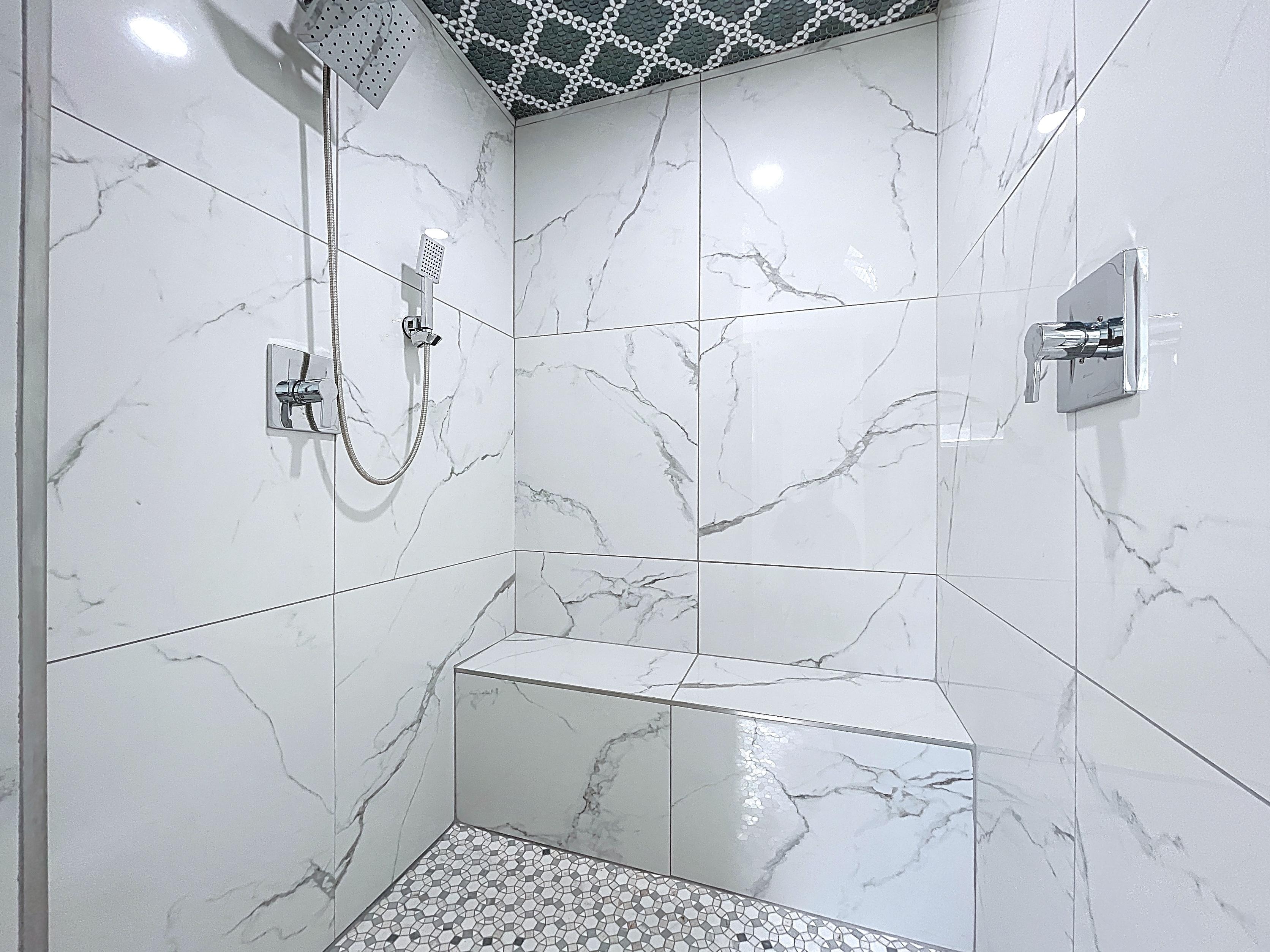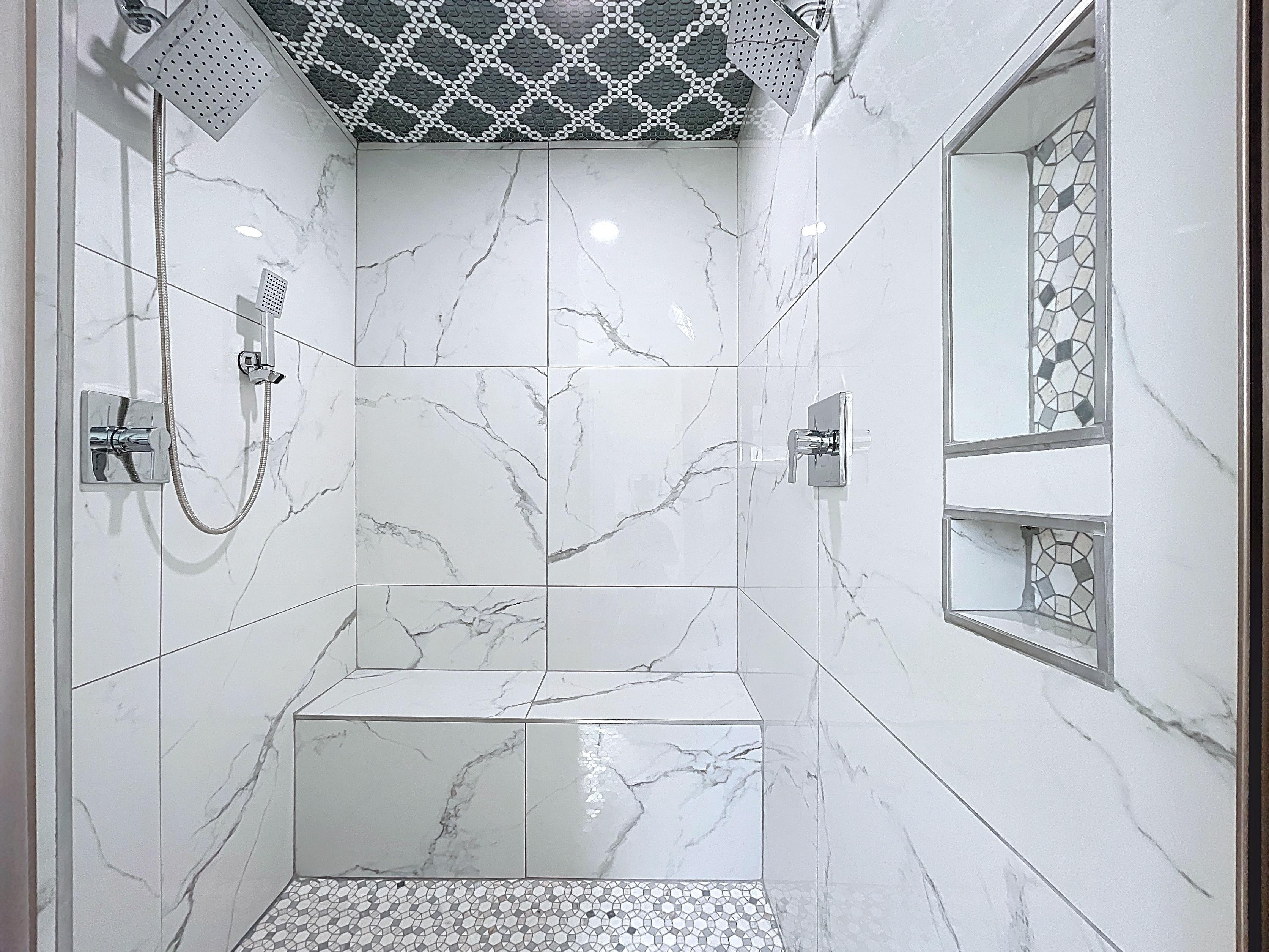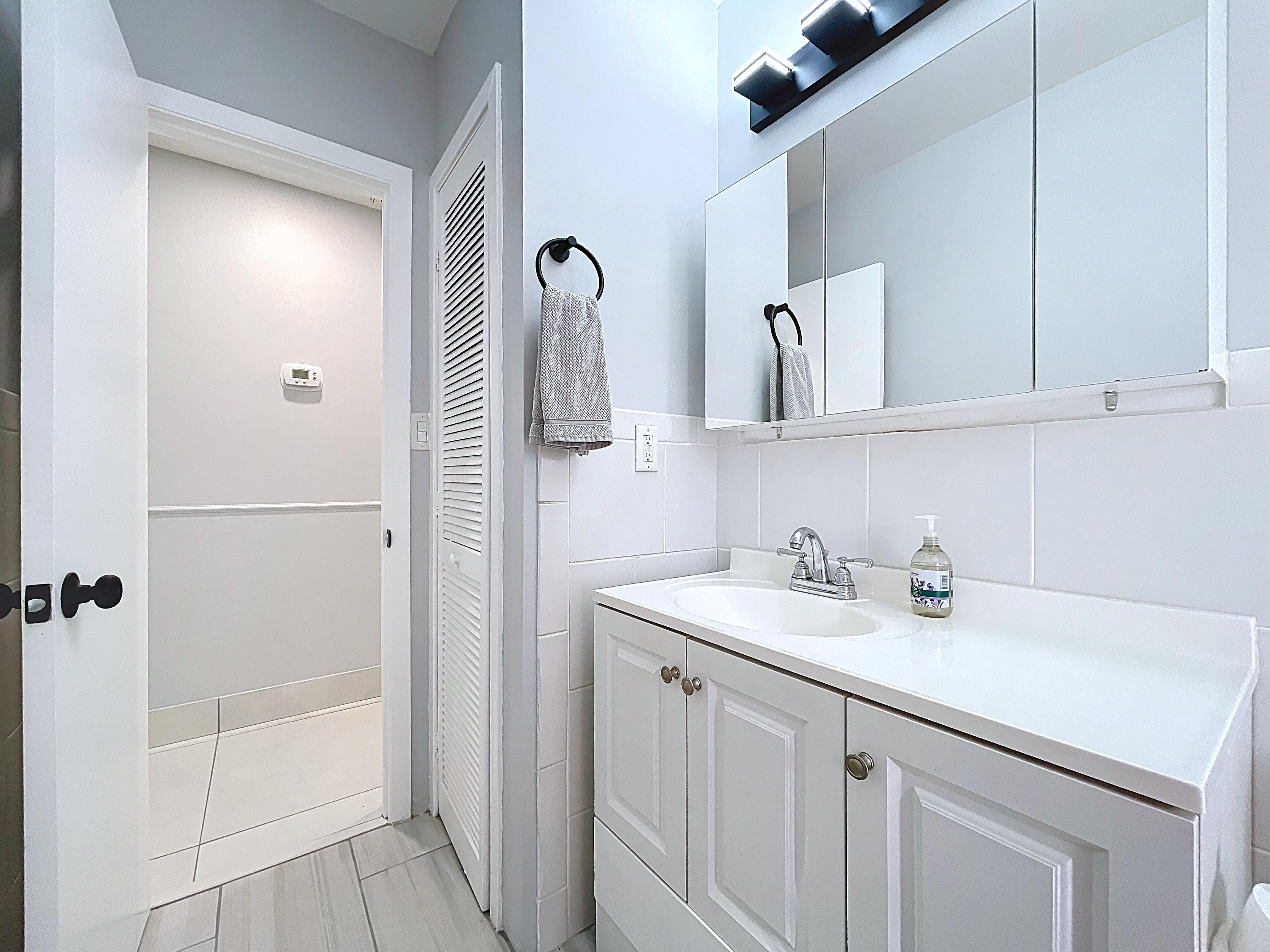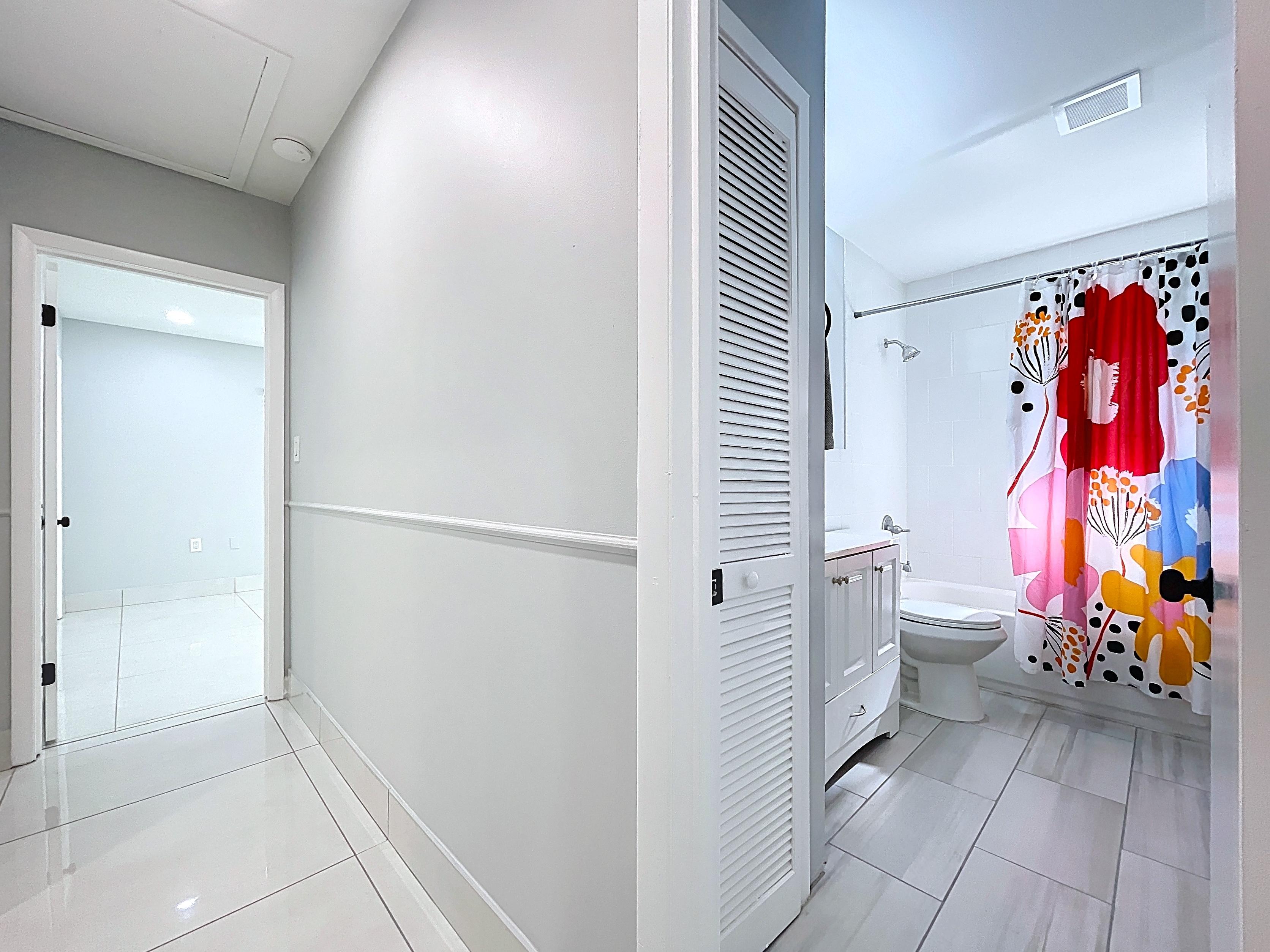 β Hall bathroom remodeled with designer tile, vanity storage, and linen closet