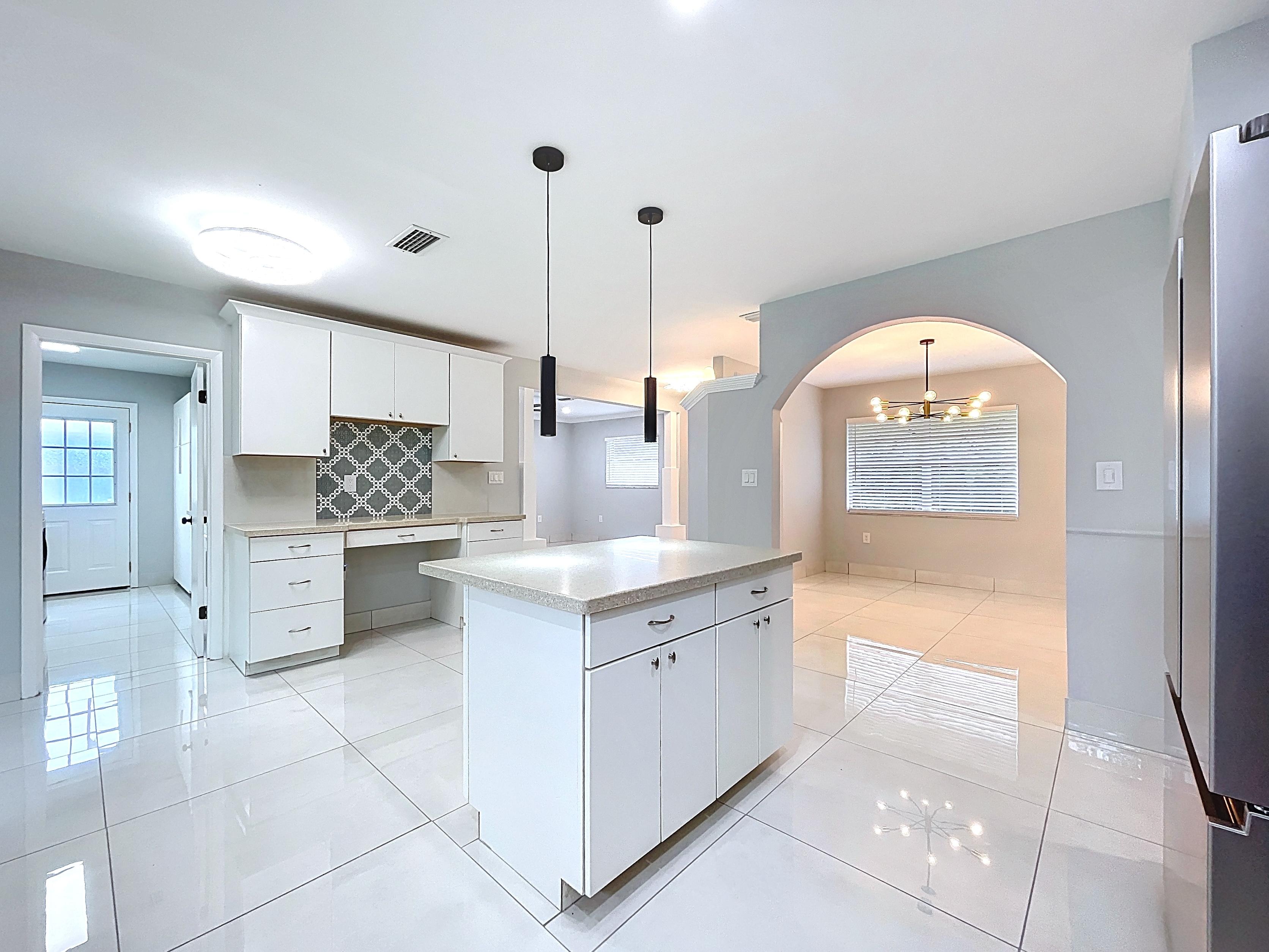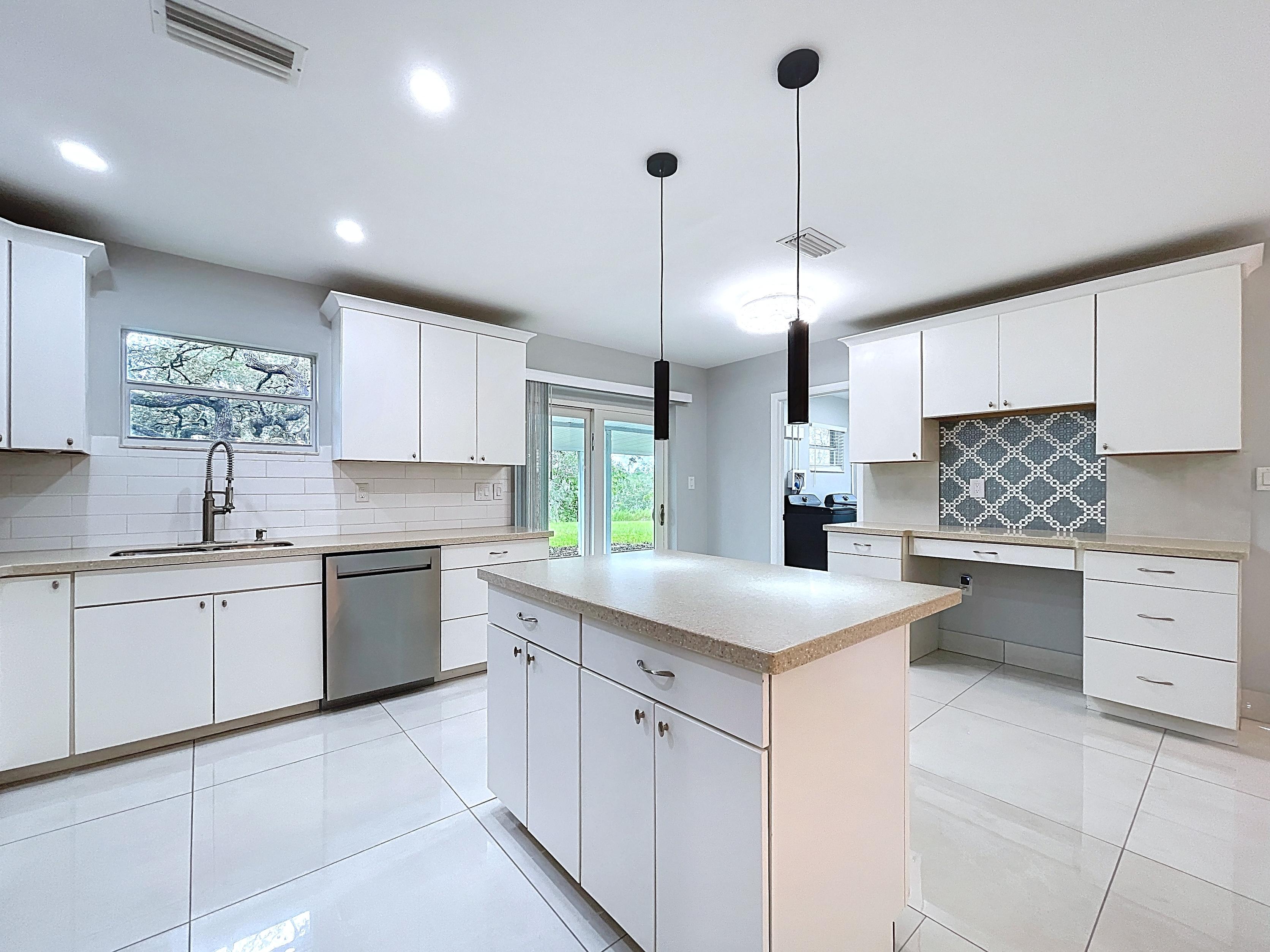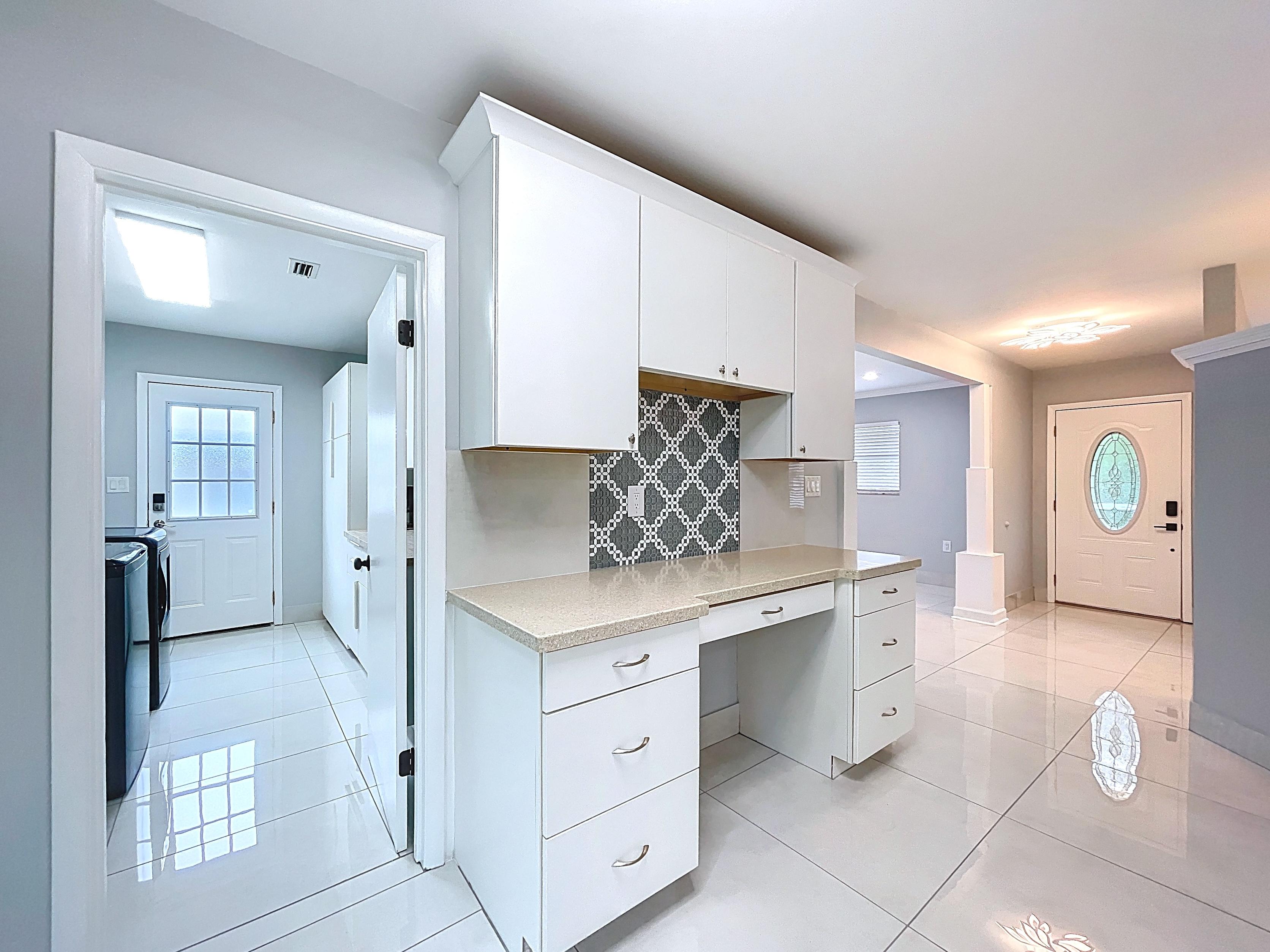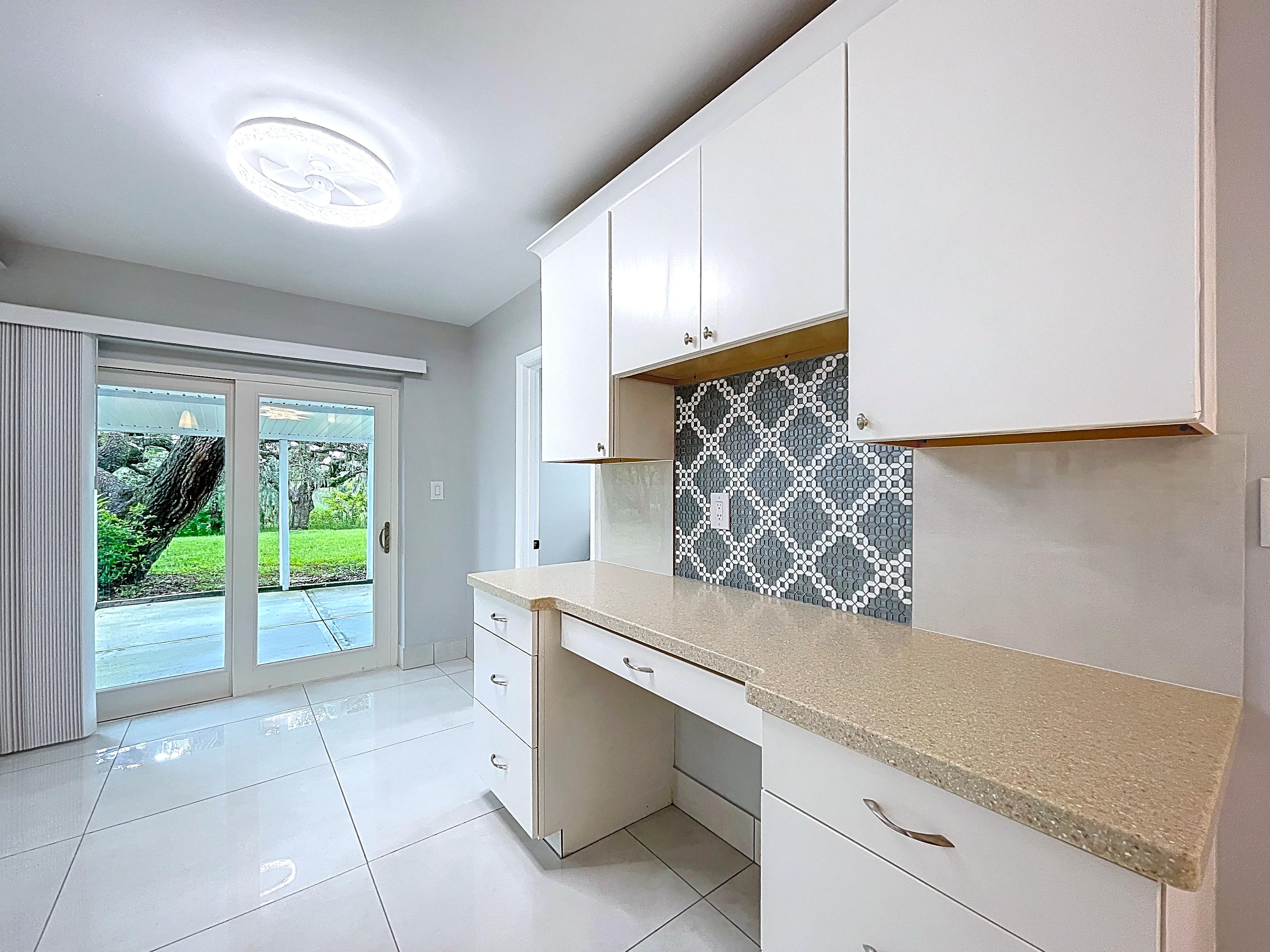 β Updated eat-in kitchen: white cabinetry, center island, stainless steel appliances, subway backsplash, built-in desk, and walk-in pantry