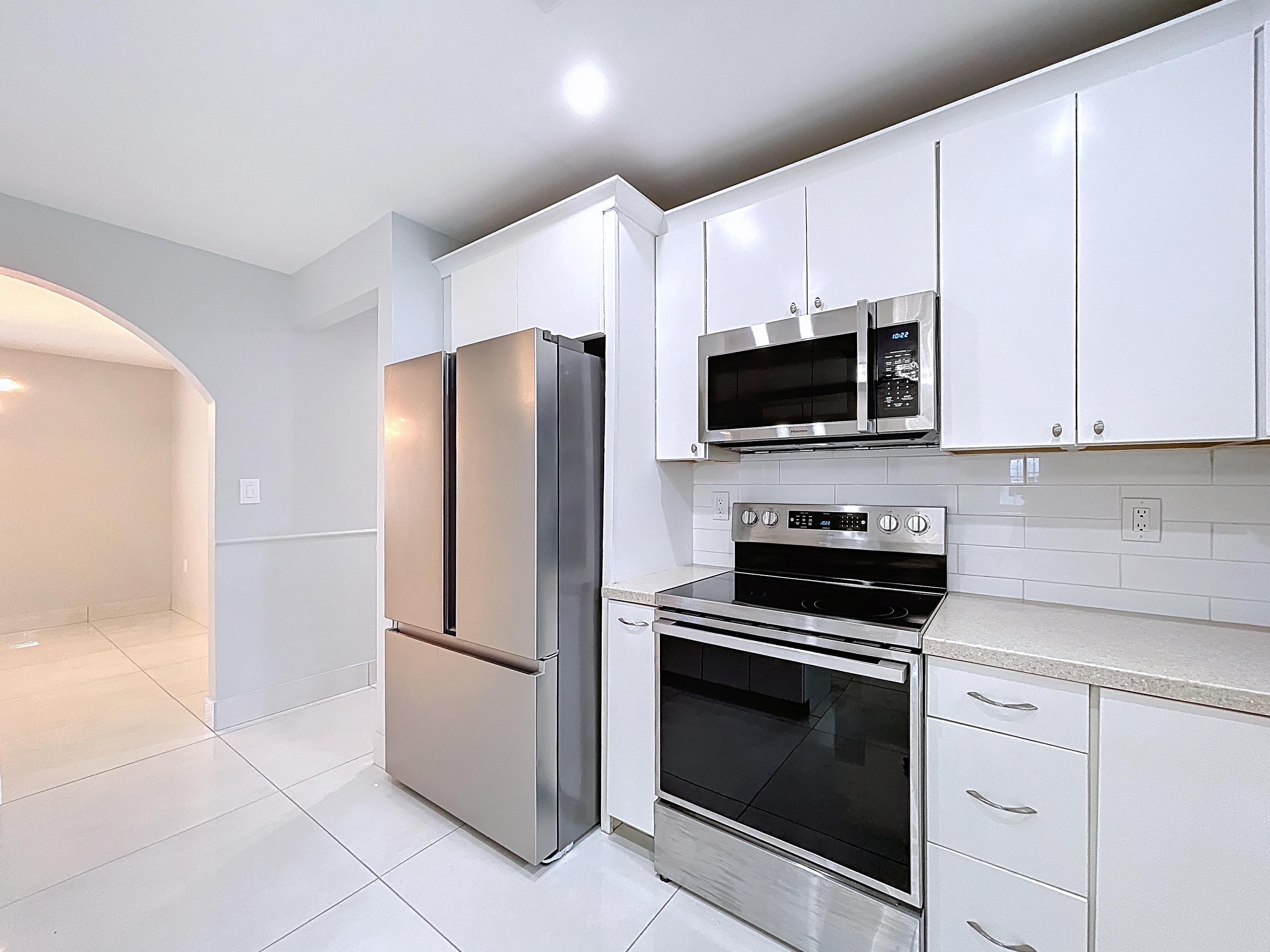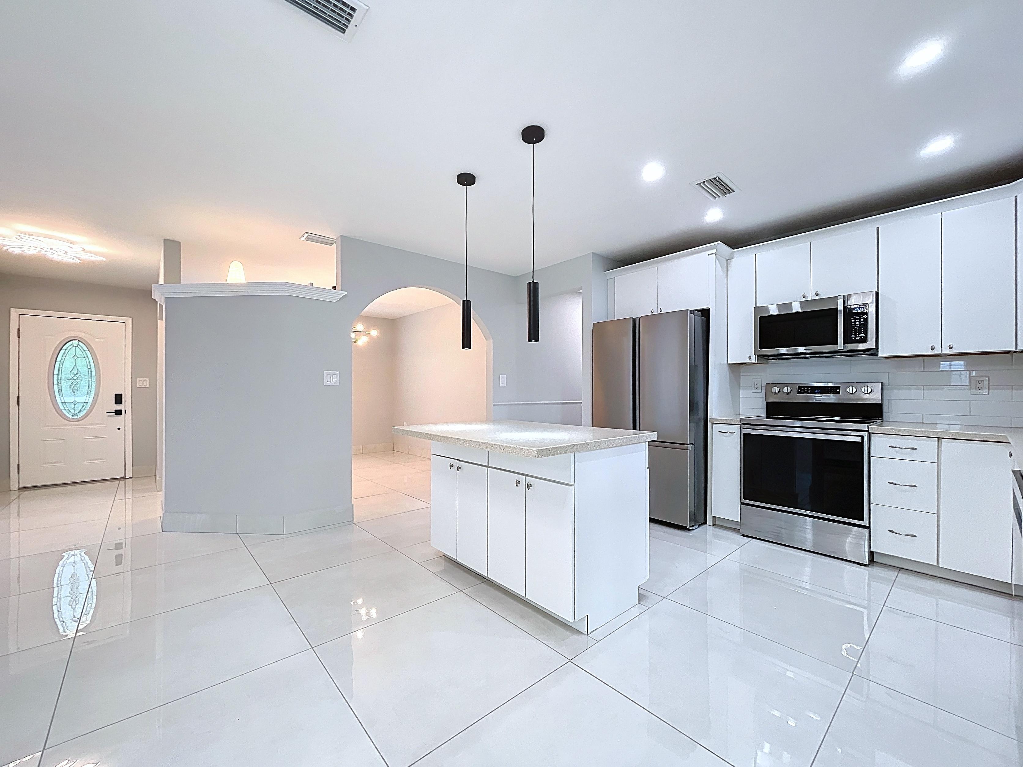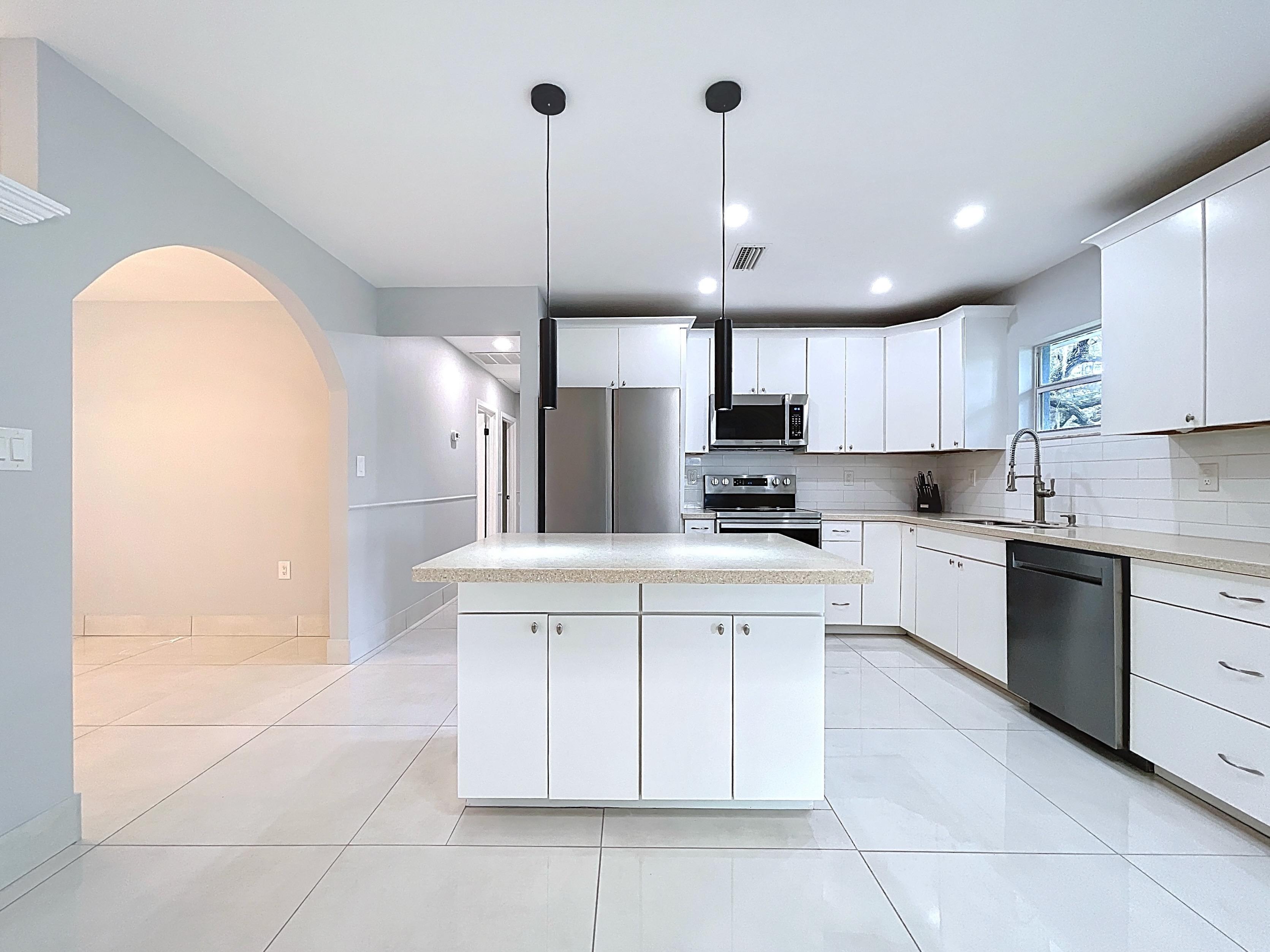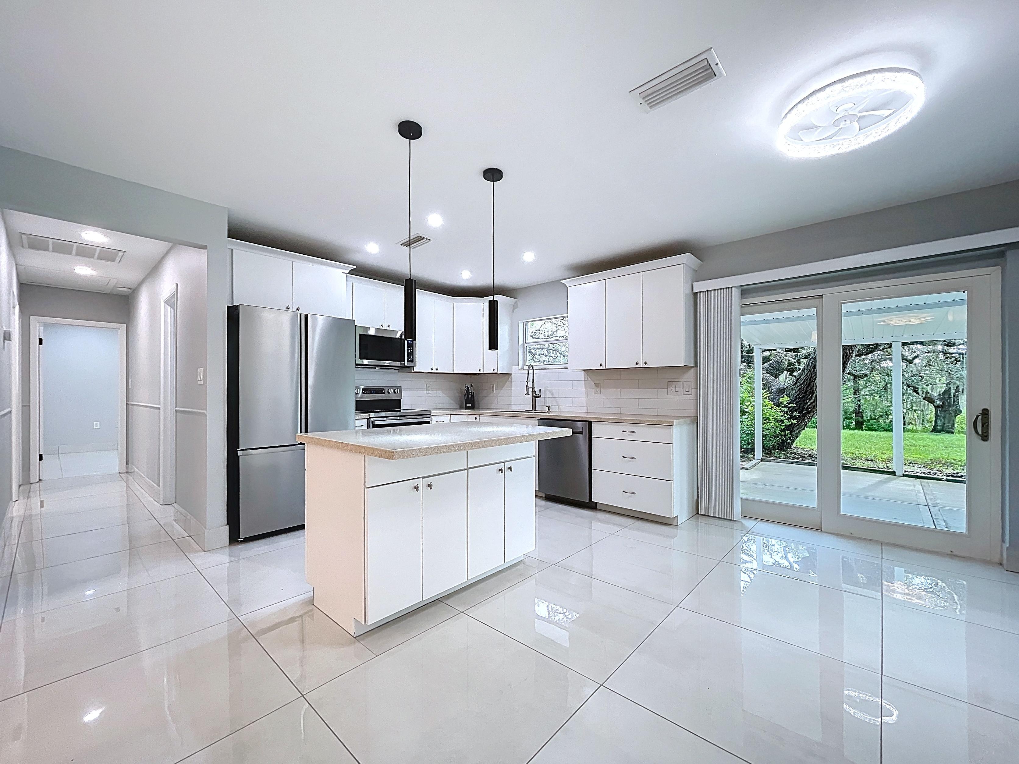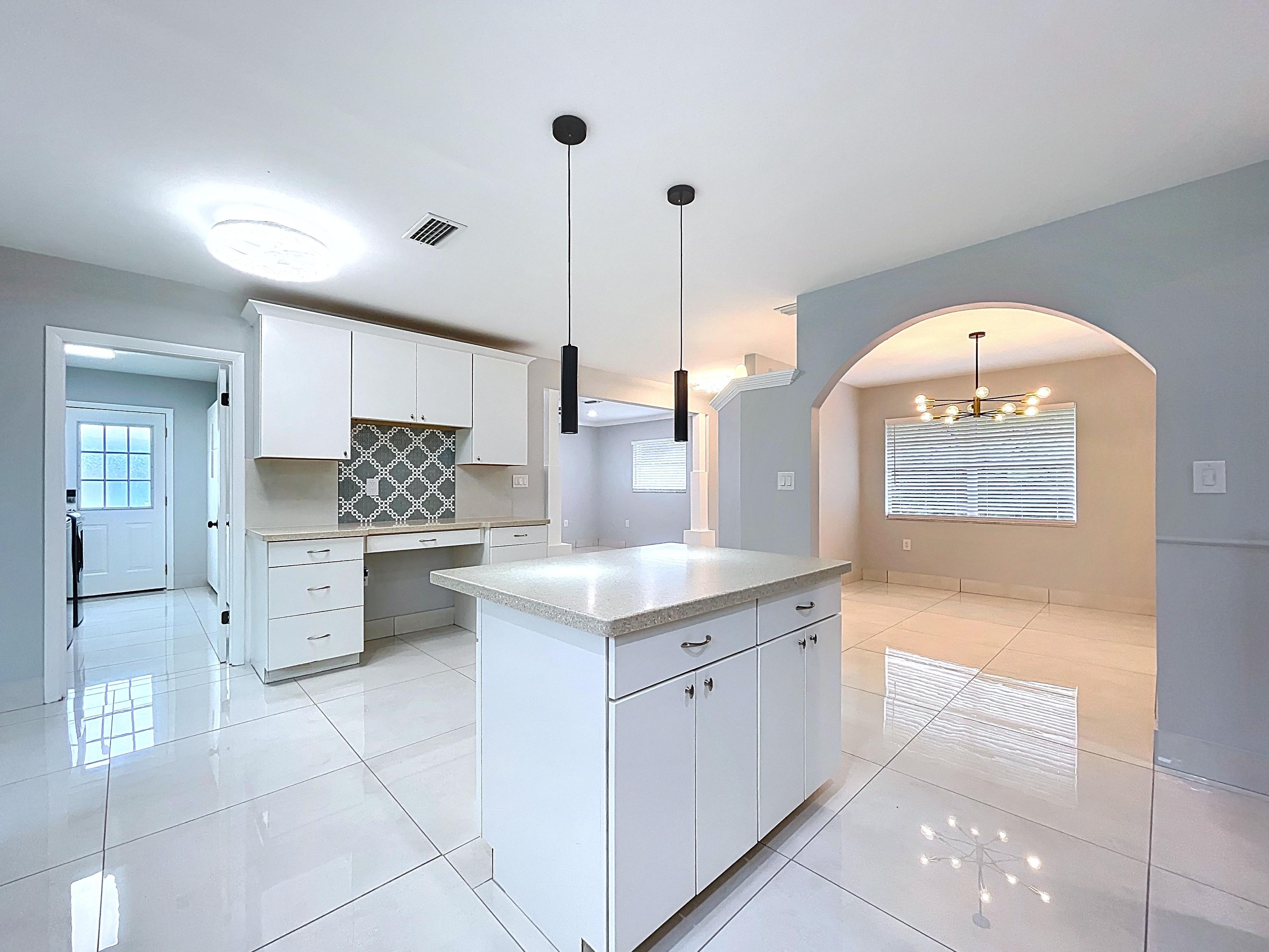 β Updated eat-in kitchen: white cabinetry, center island, stainless steel appliances, subway backsplash, built-in desk, and walk-in pantry