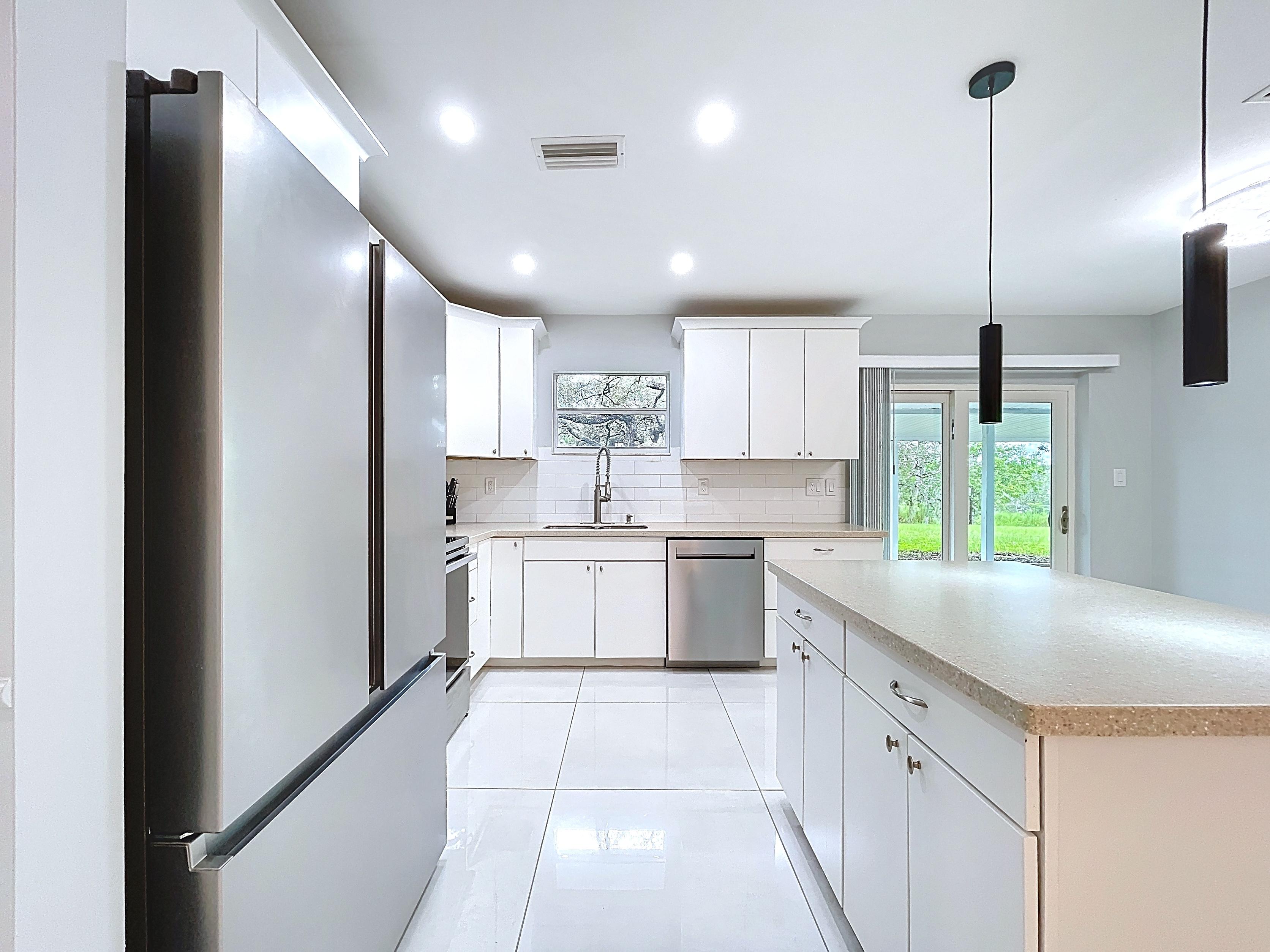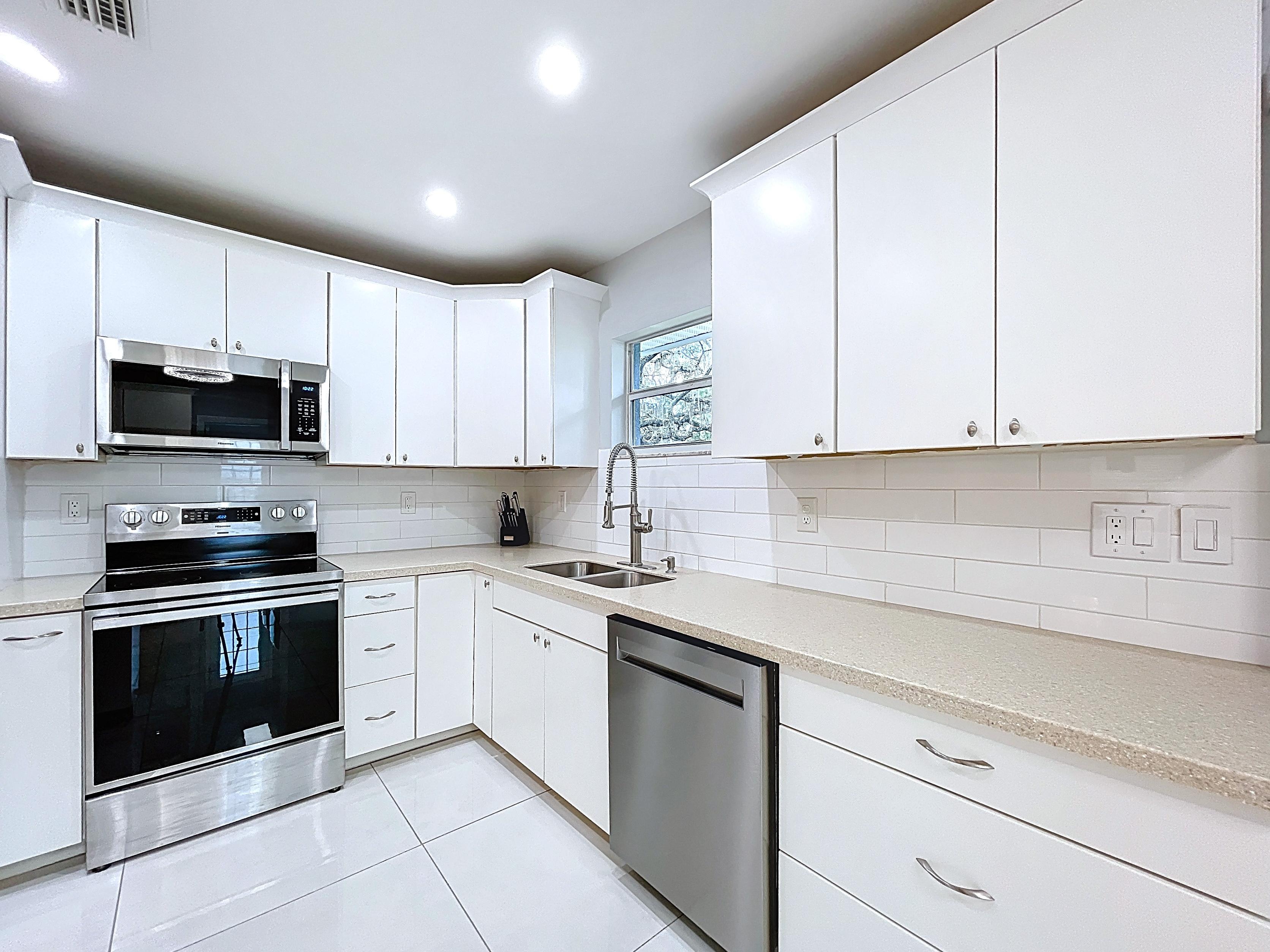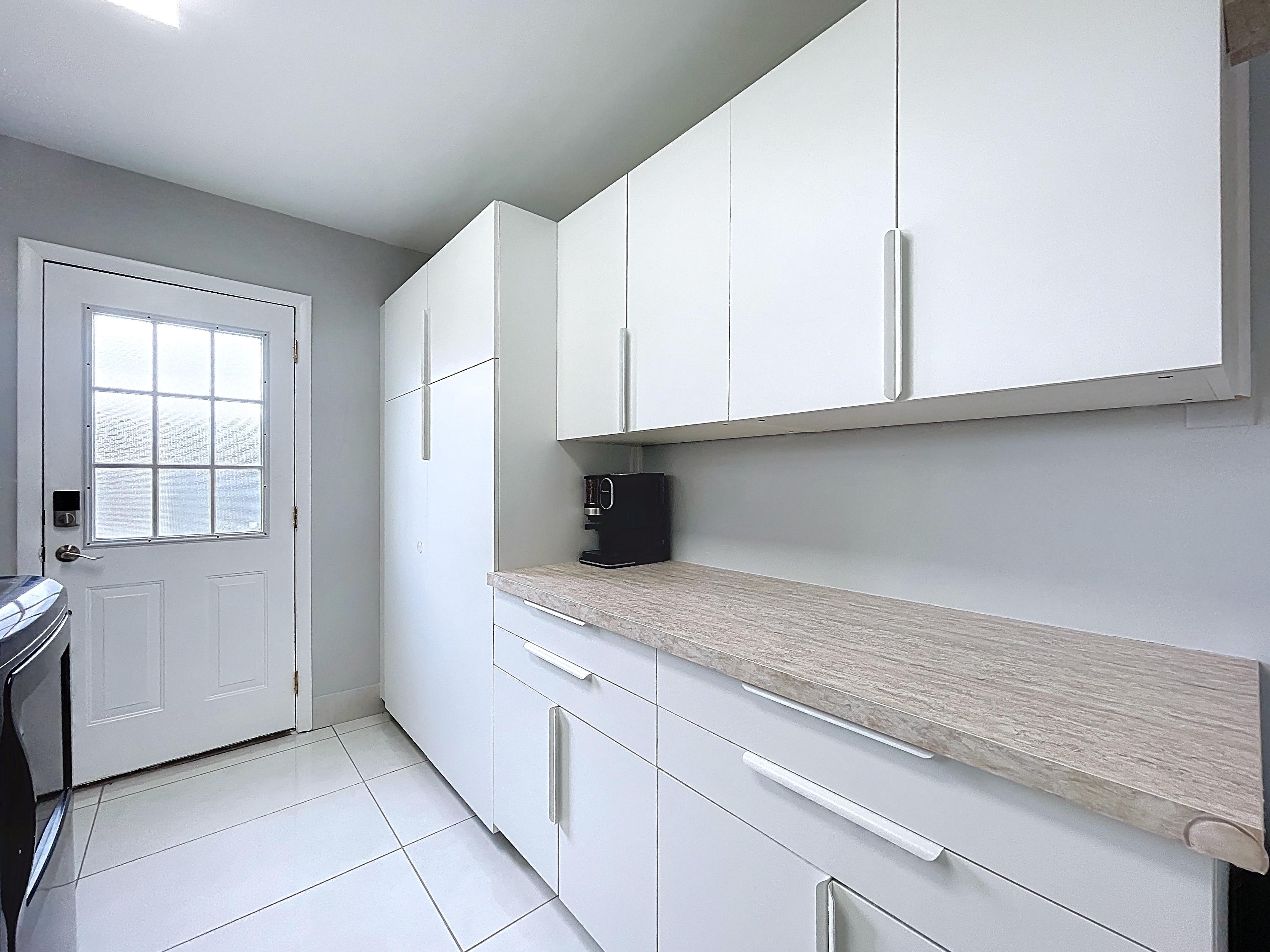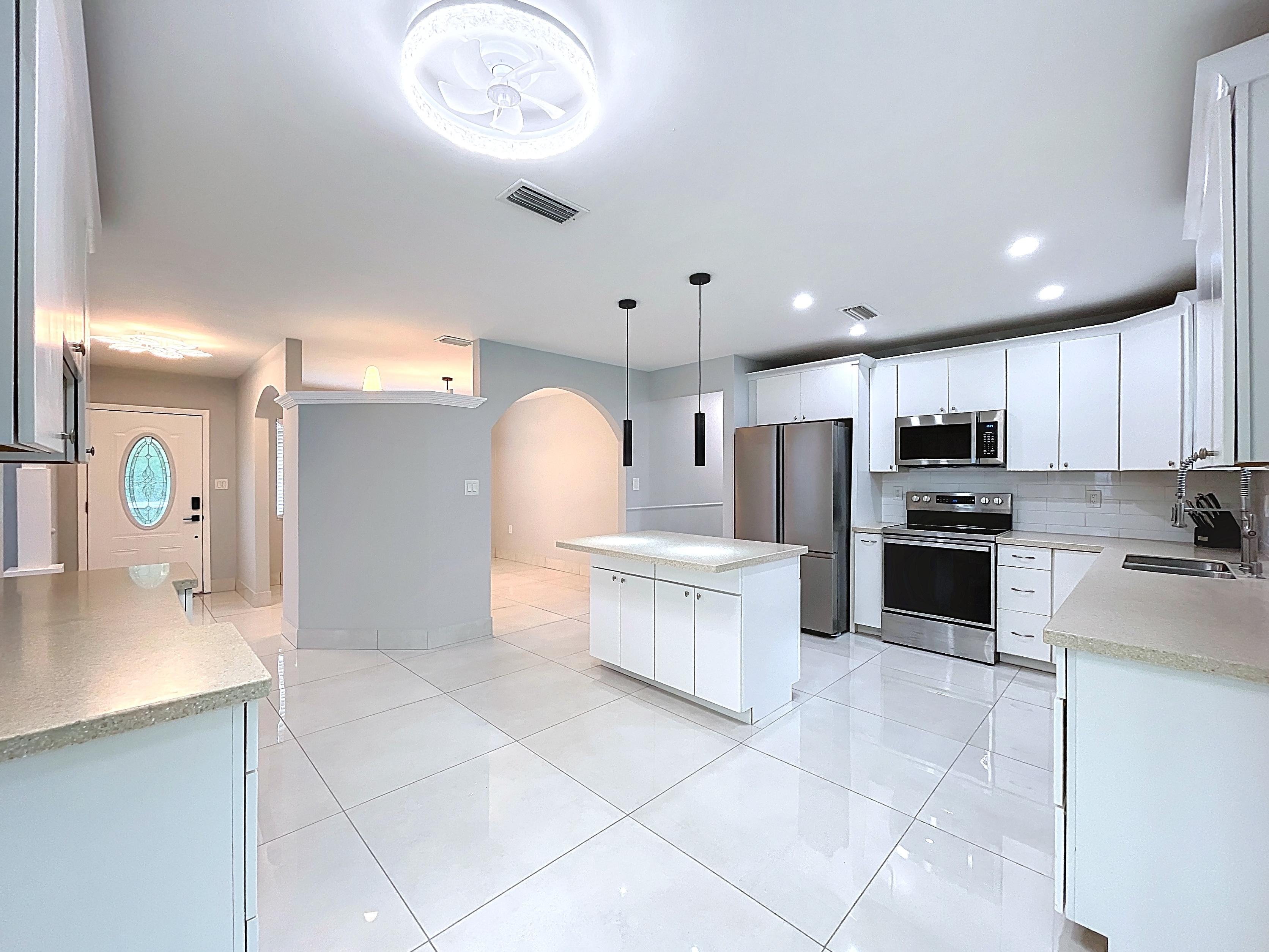 β Updated eat-in kitchen: white cabinetry, center island, stainless steel appliances, subway backsplash, built-in desk, and walk-in pantry