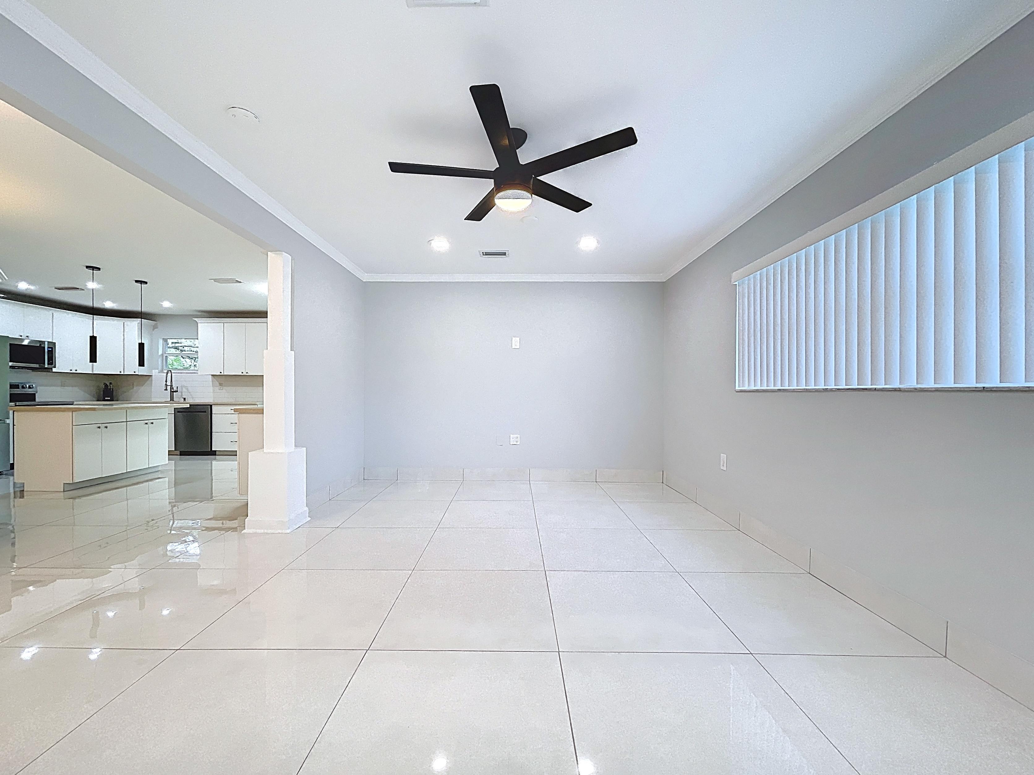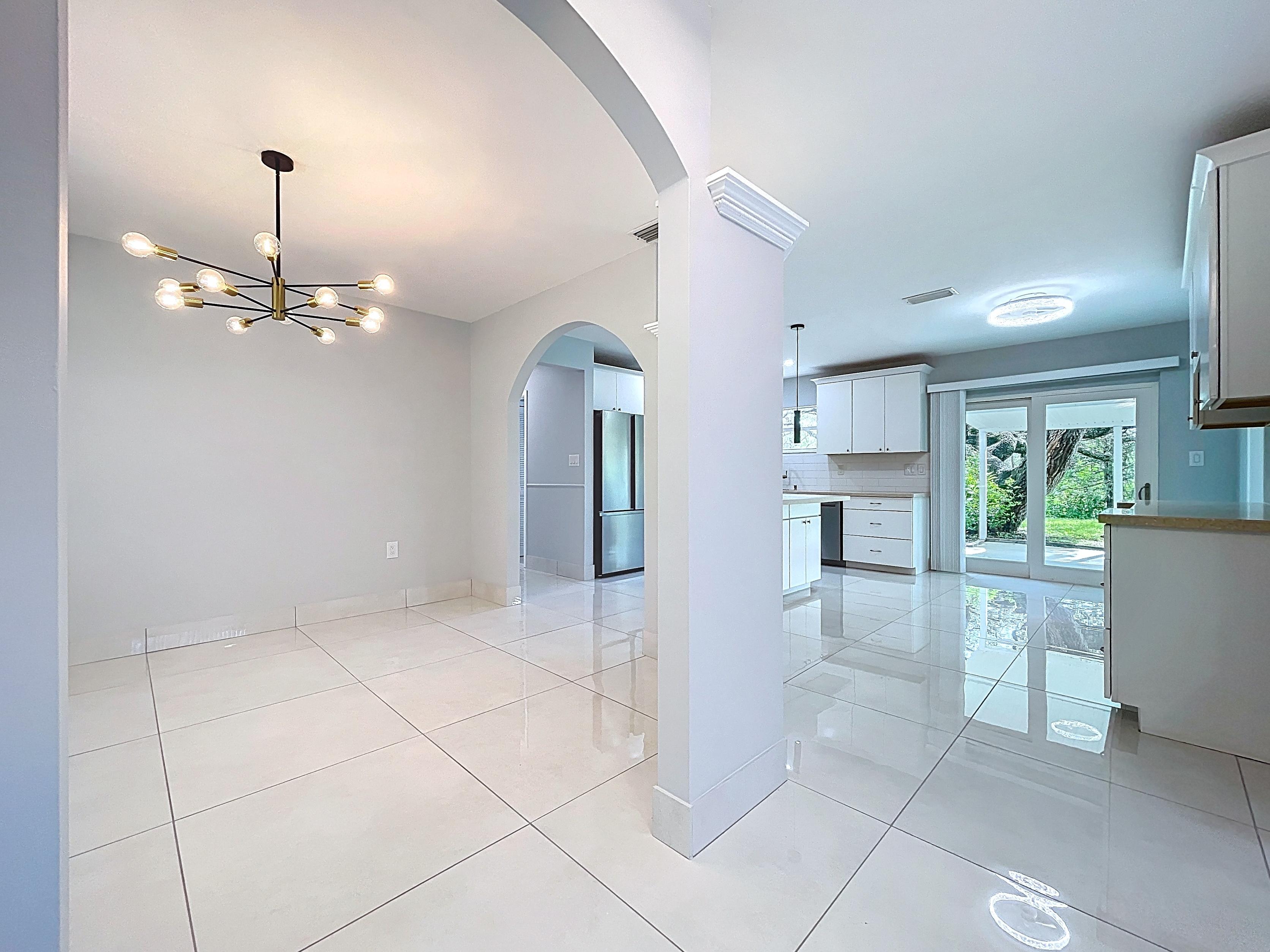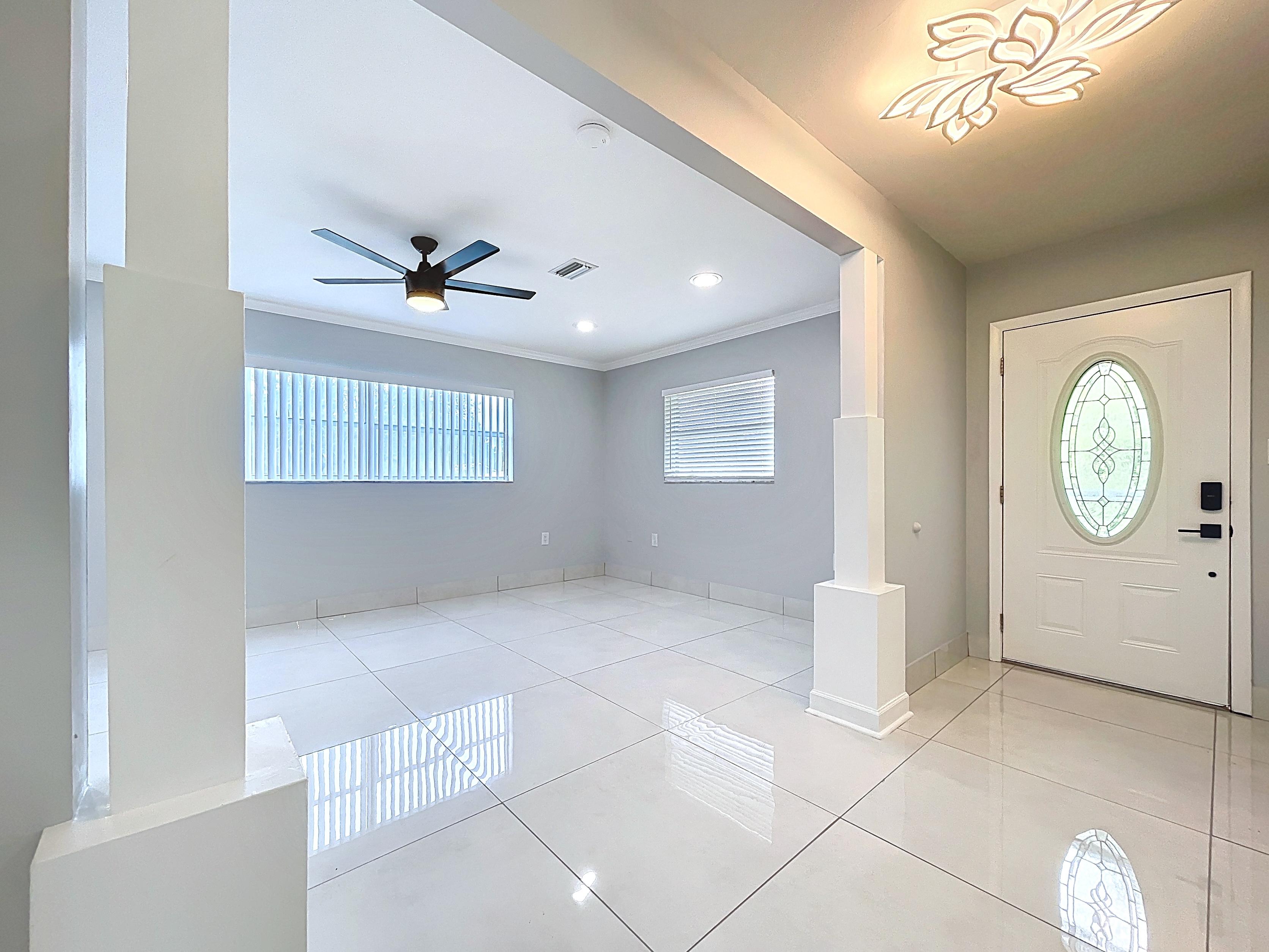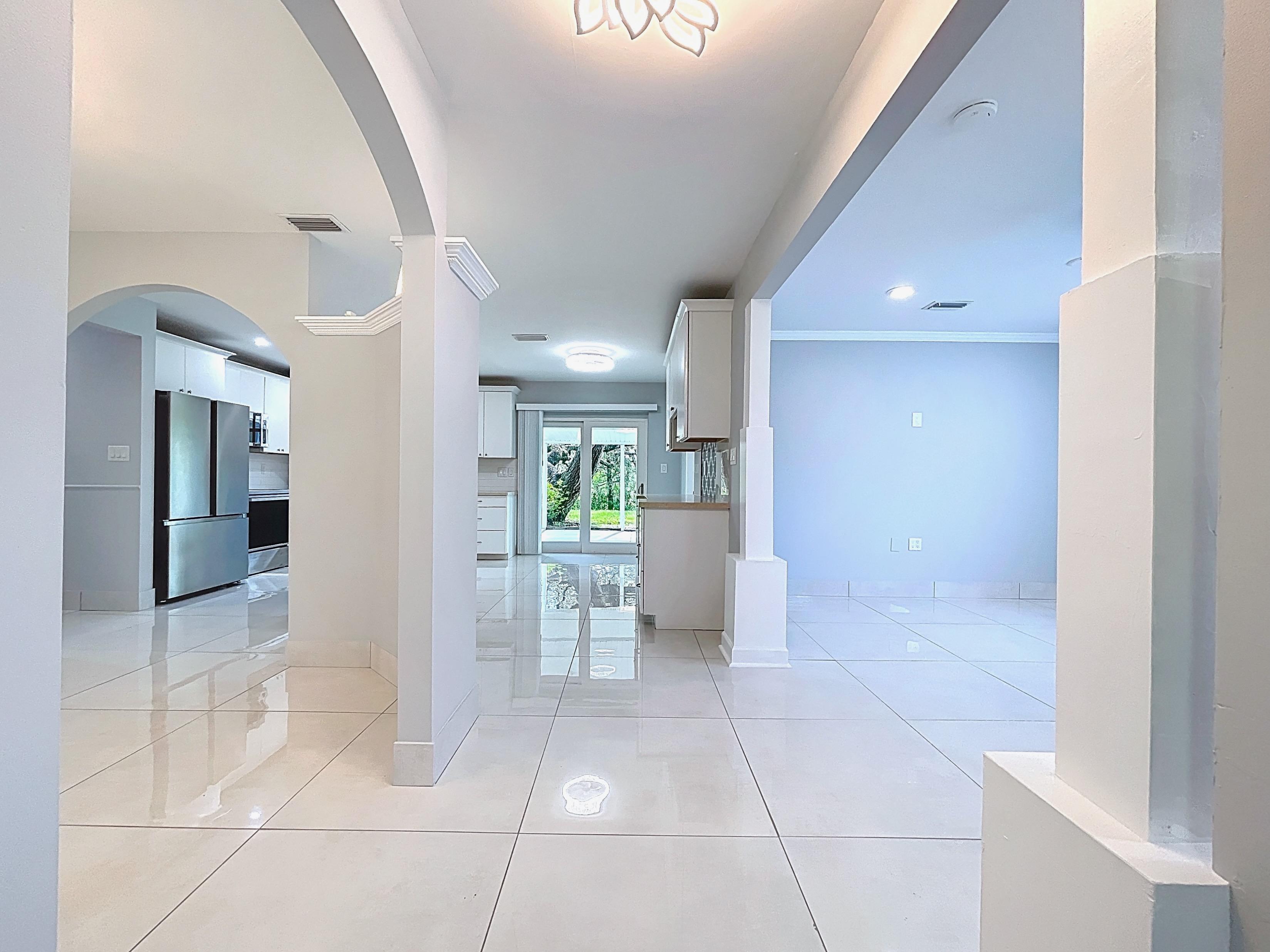 β Open floor plan: foyer, kitchen, dining room, and expansive living room with recessed lighting, crown molding, and decorative columns