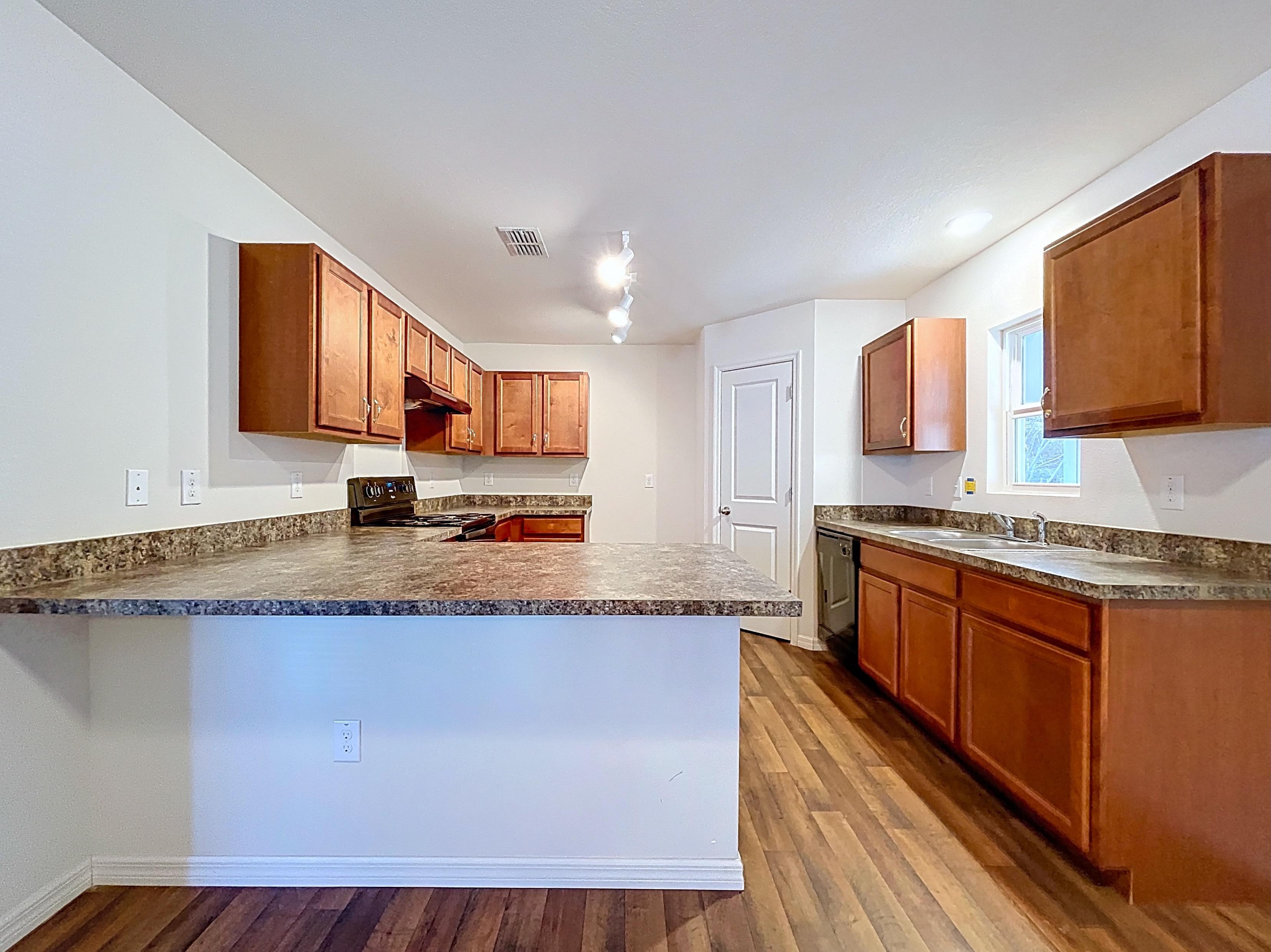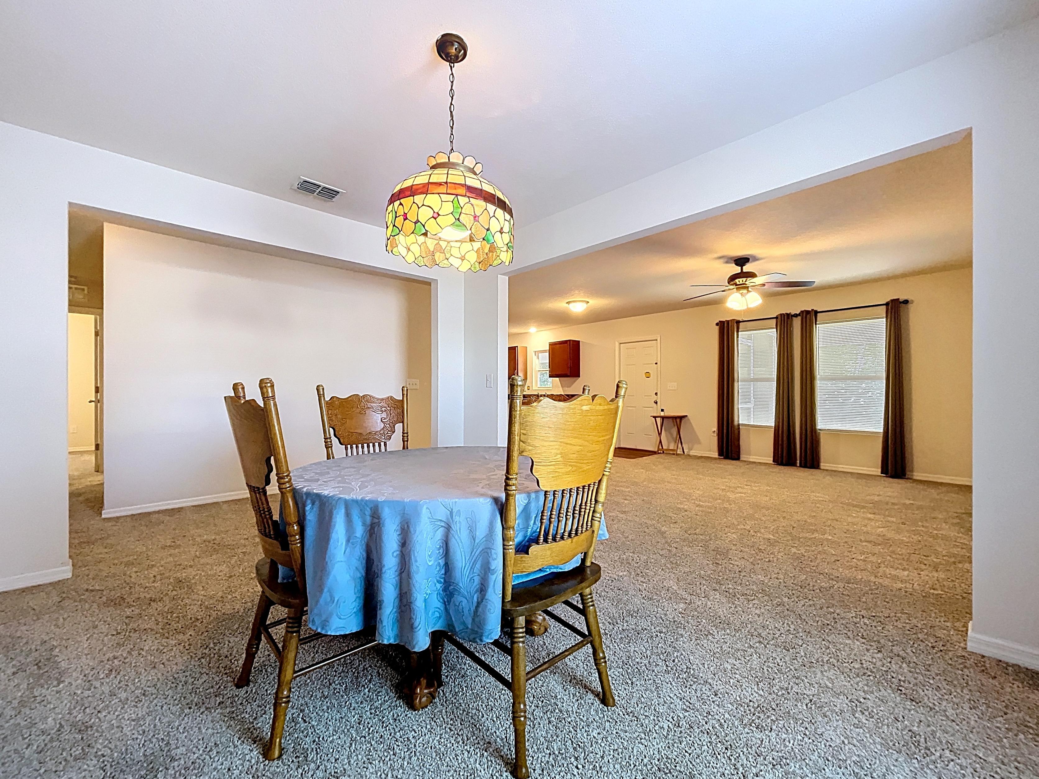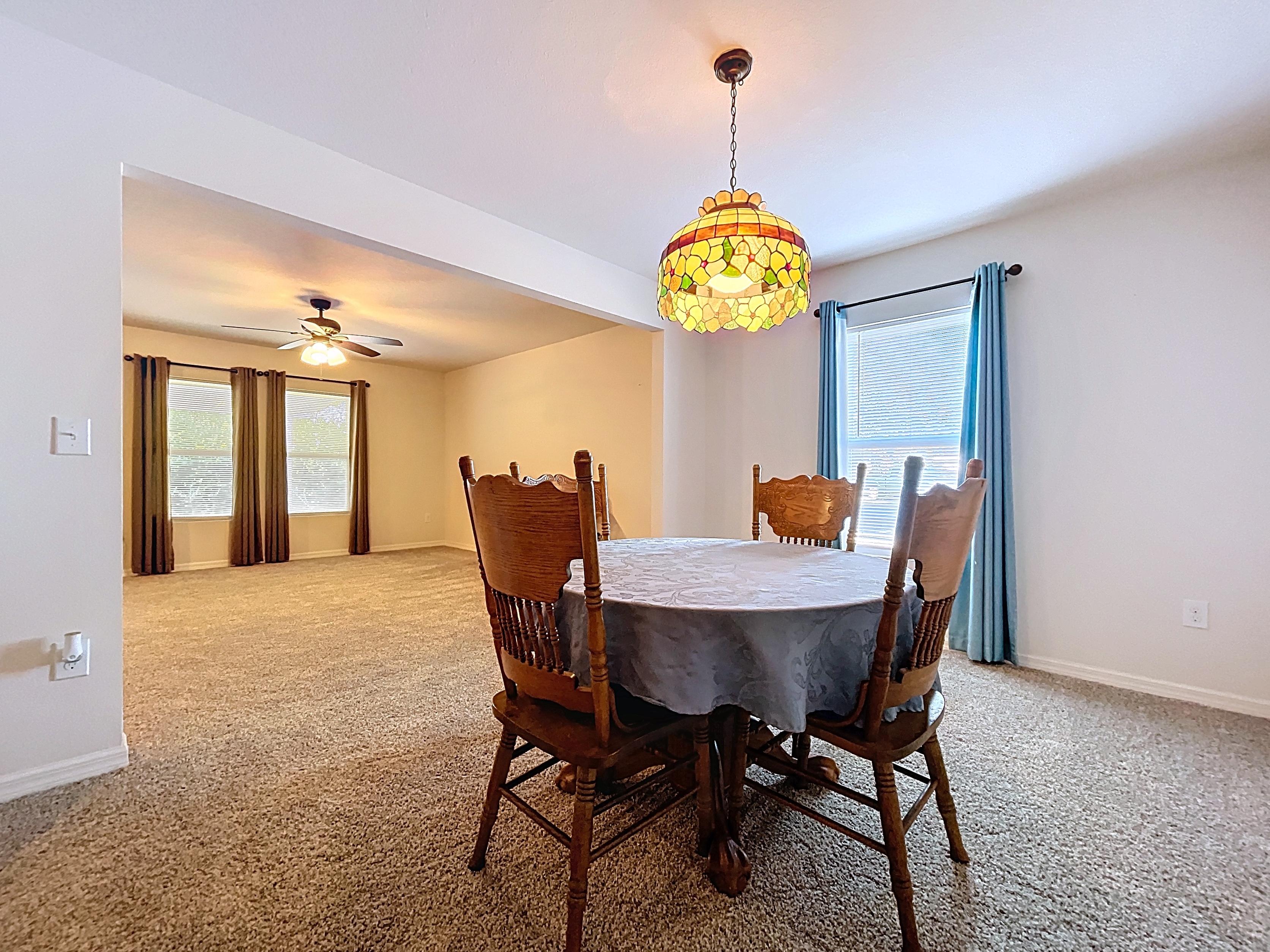 β Kitchen with ample cabinetry, solid-surface counters, pantry space, and adjacent dining area (verify appliances/finishes)