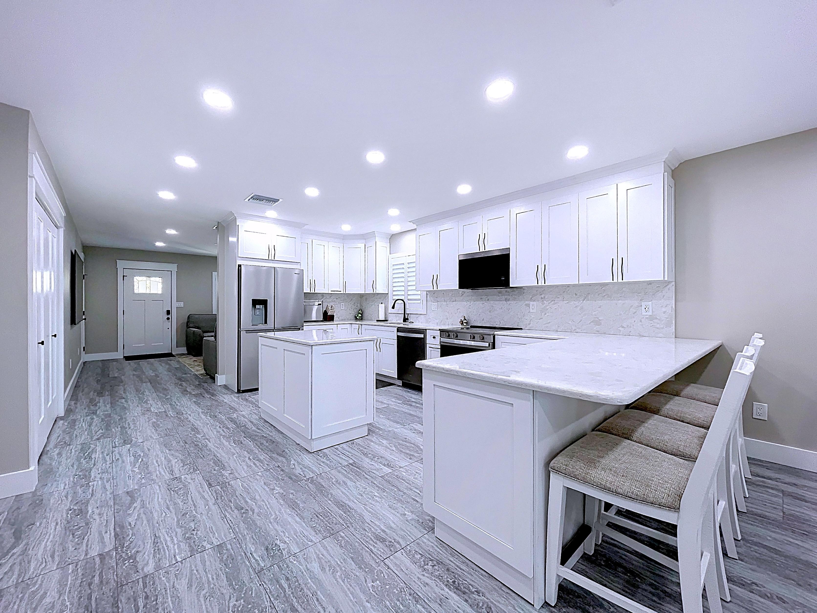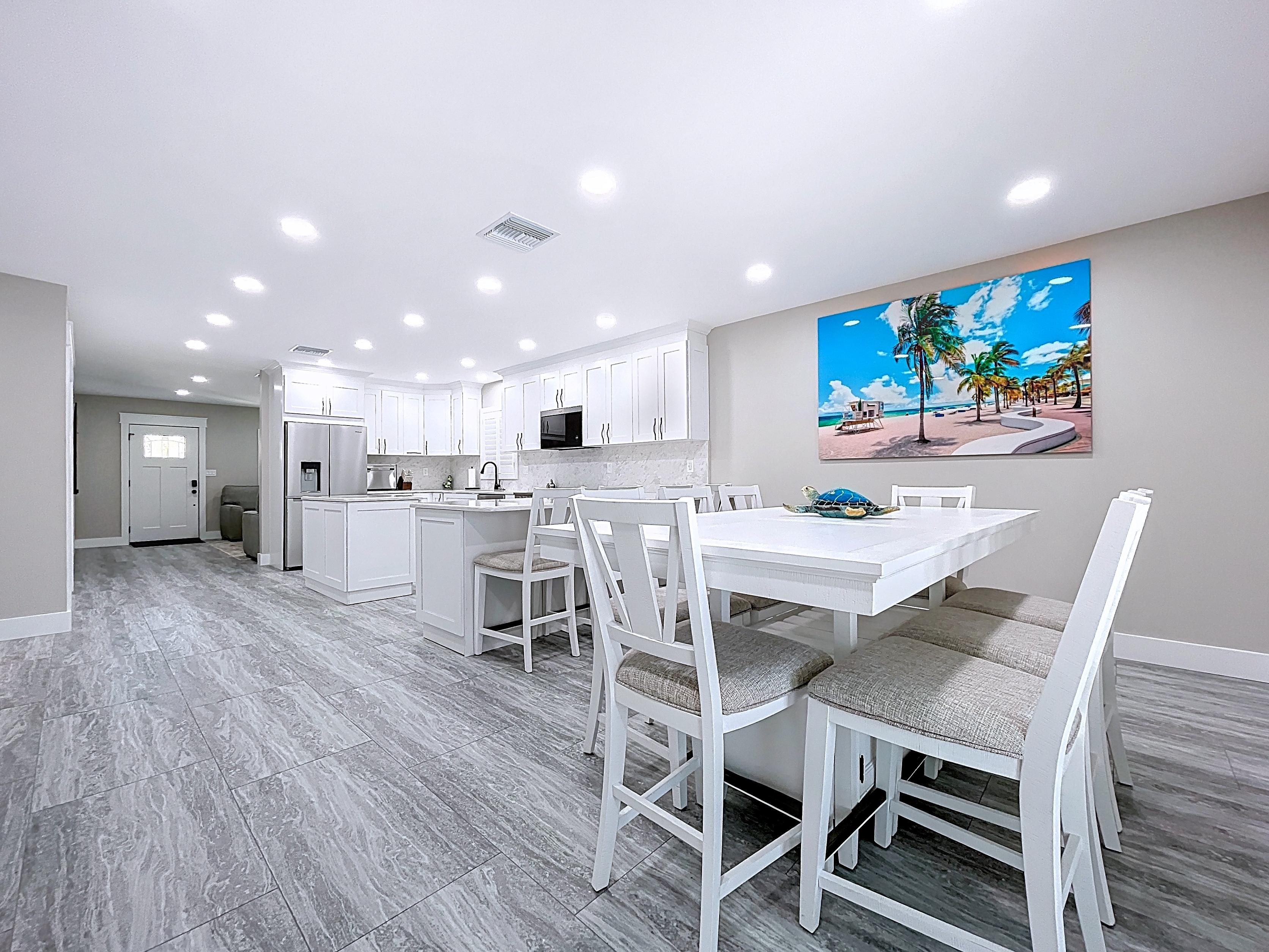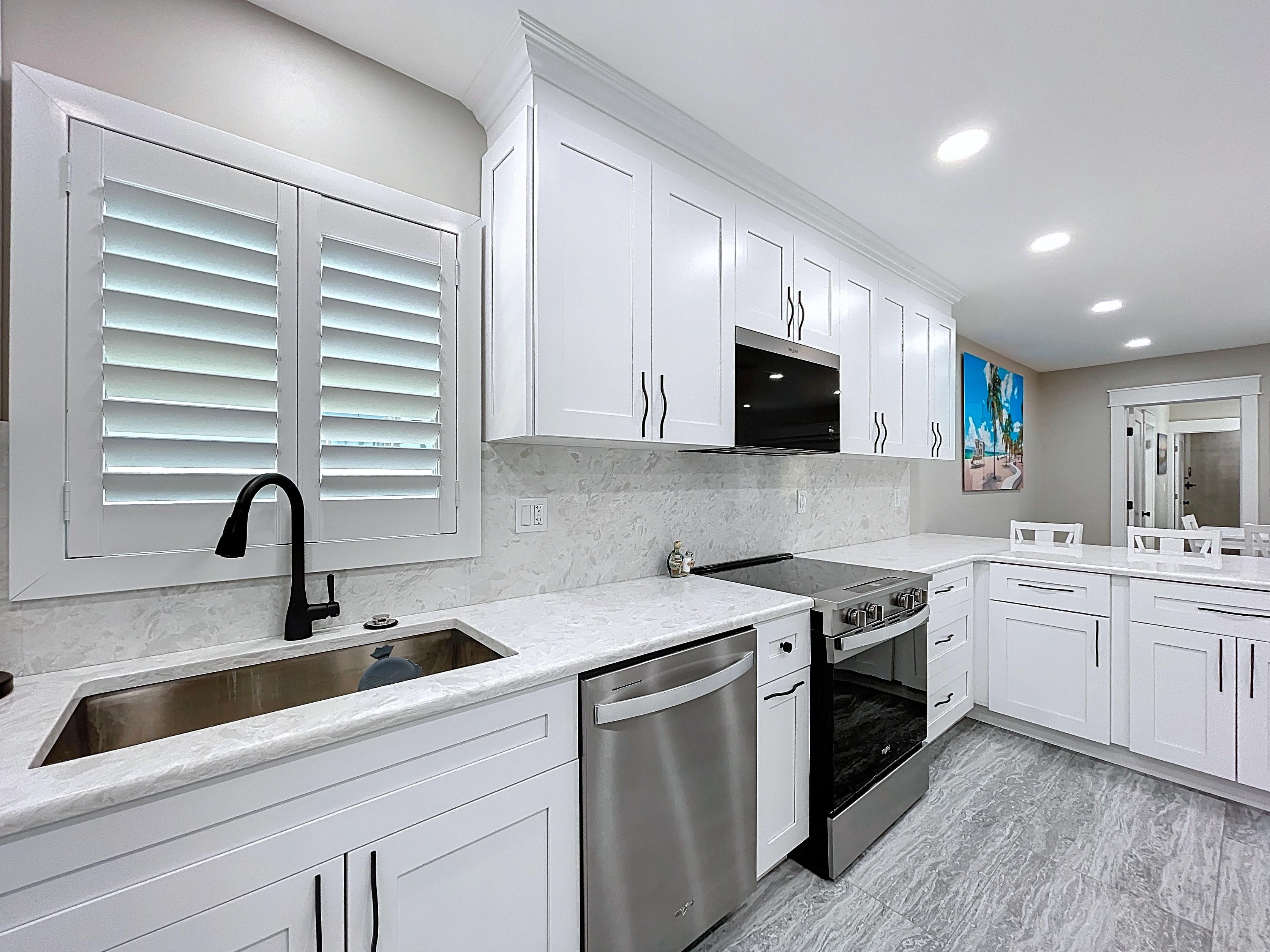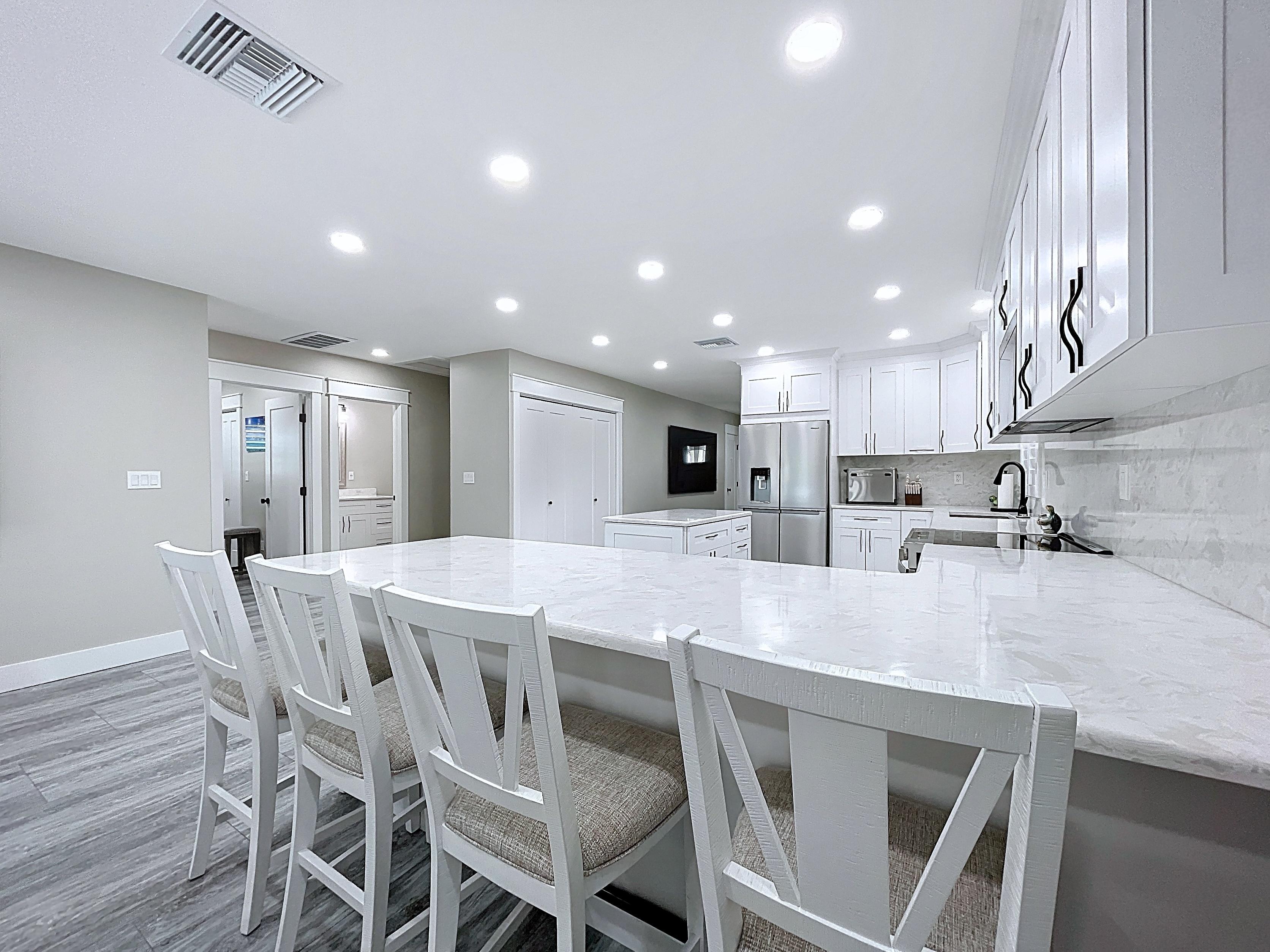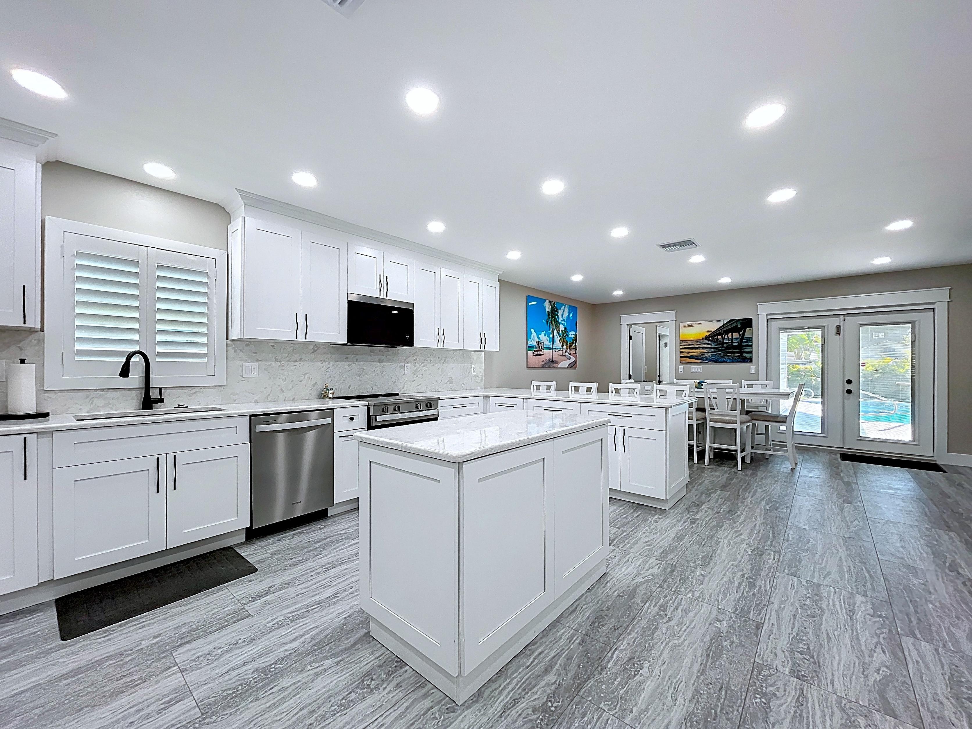 β Updated kitchen with premium cabinetry, stone-surface counters, built-in appliances, and adjacent dining area (verify finishes)