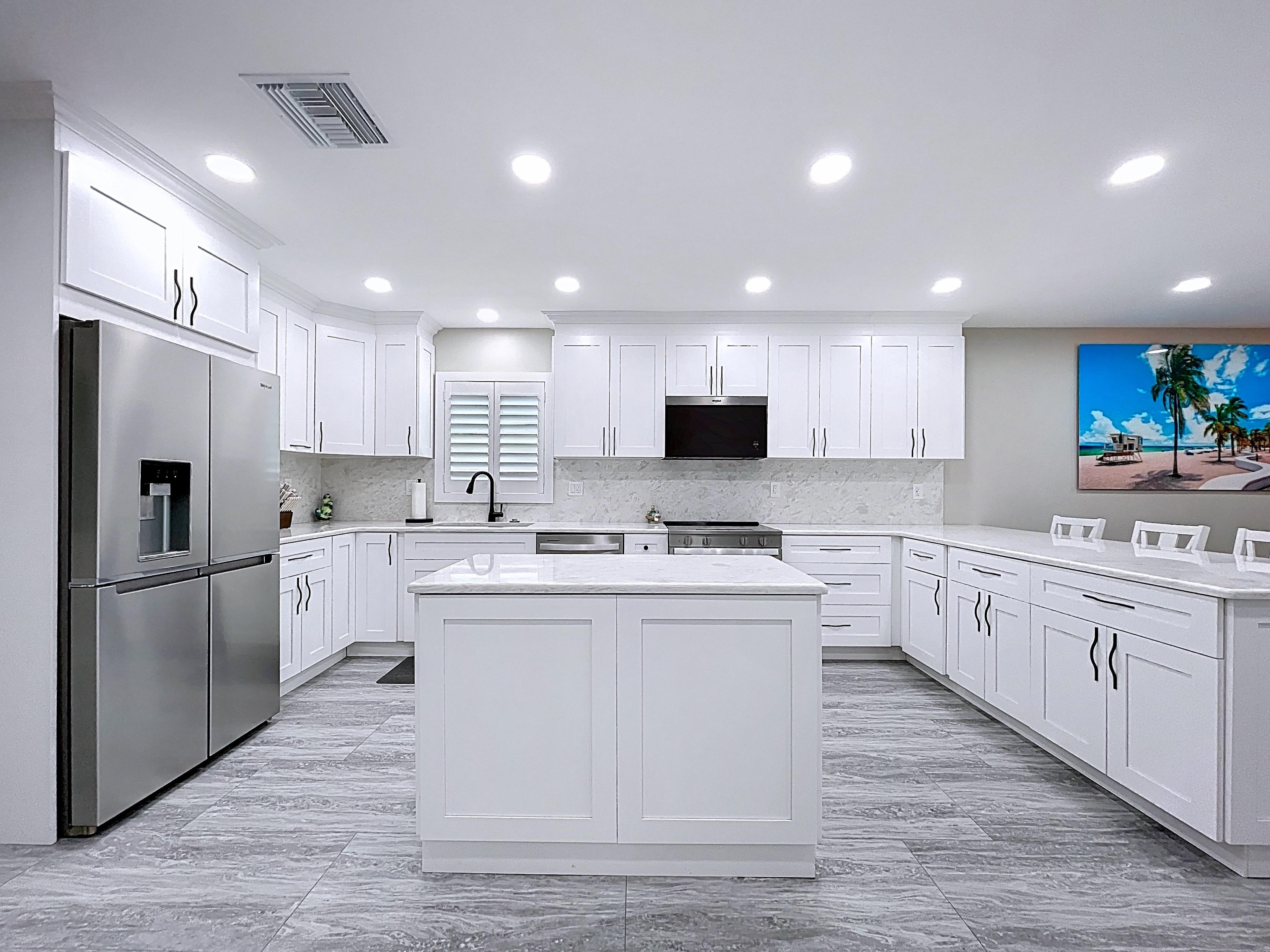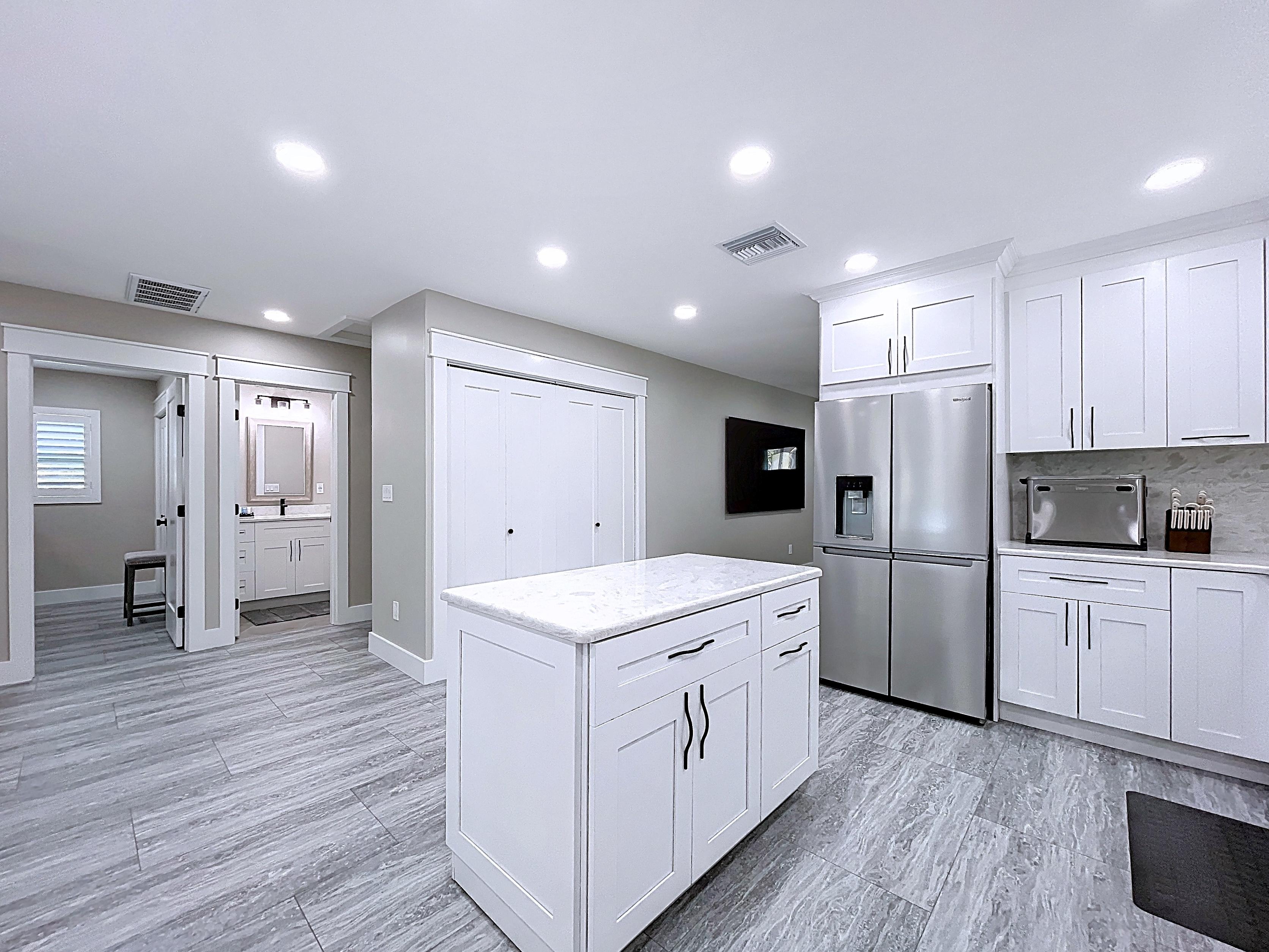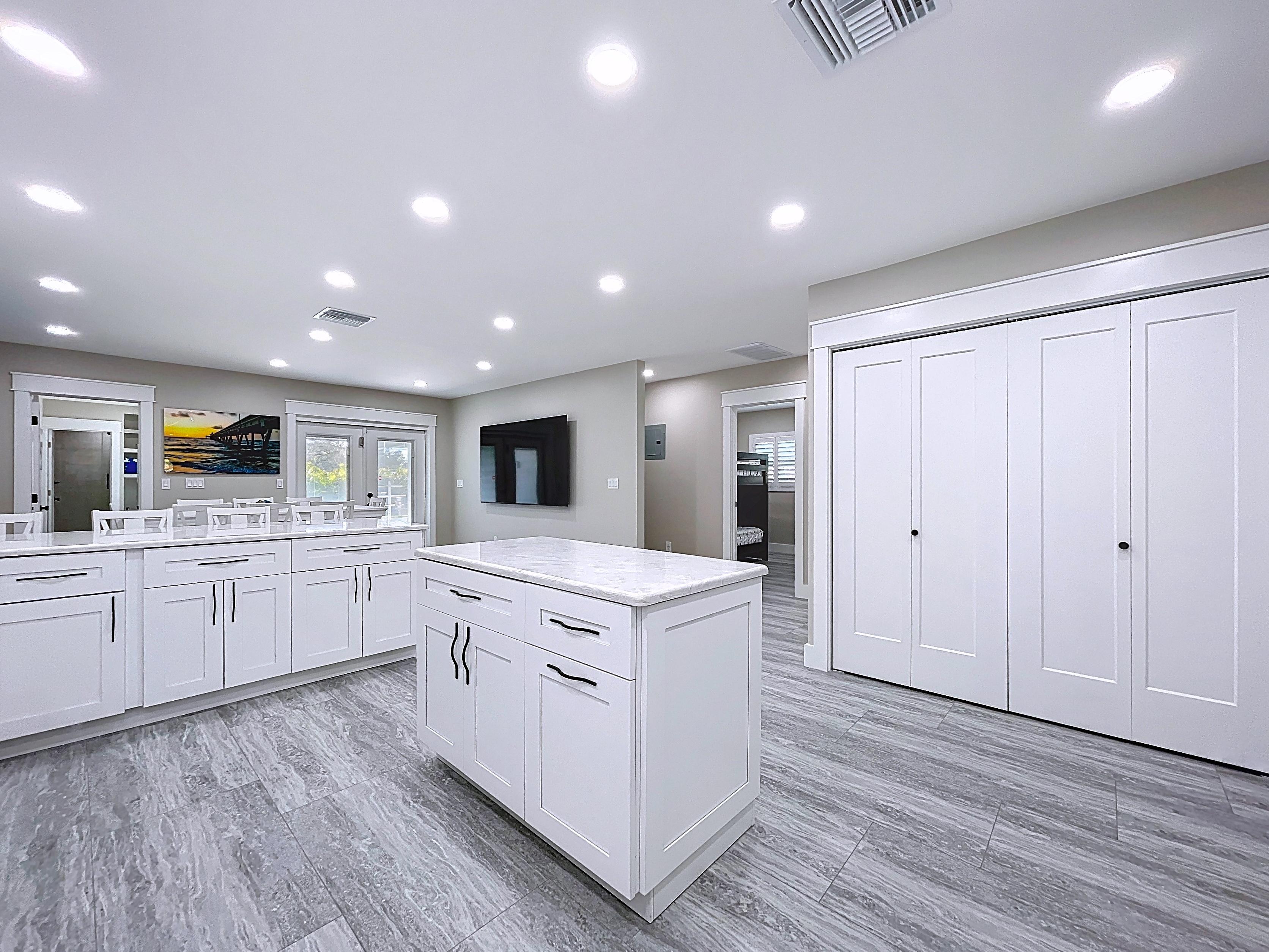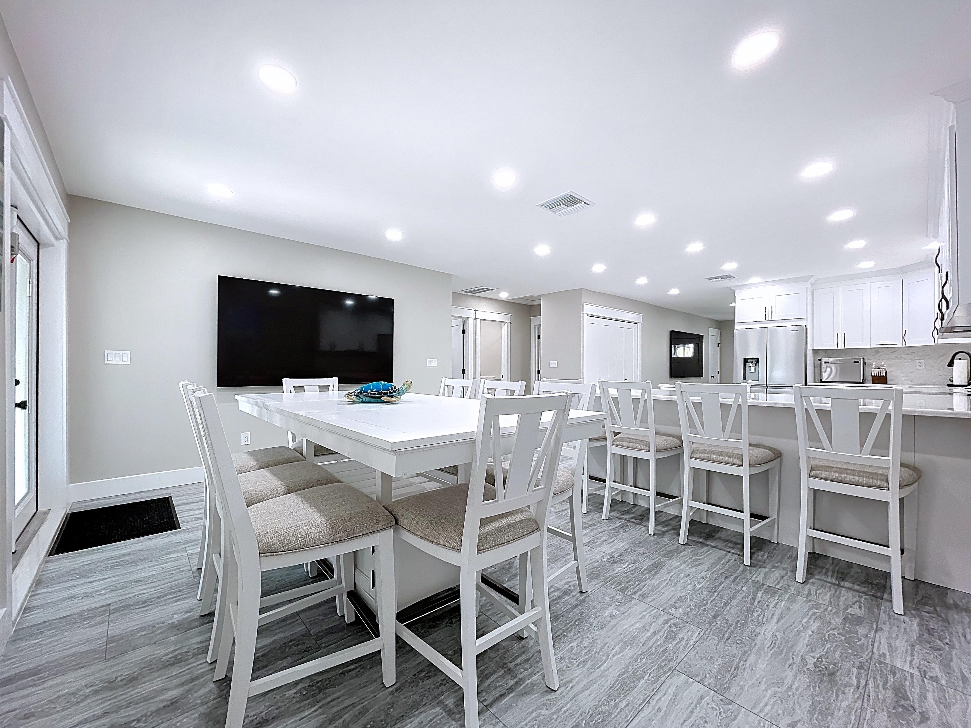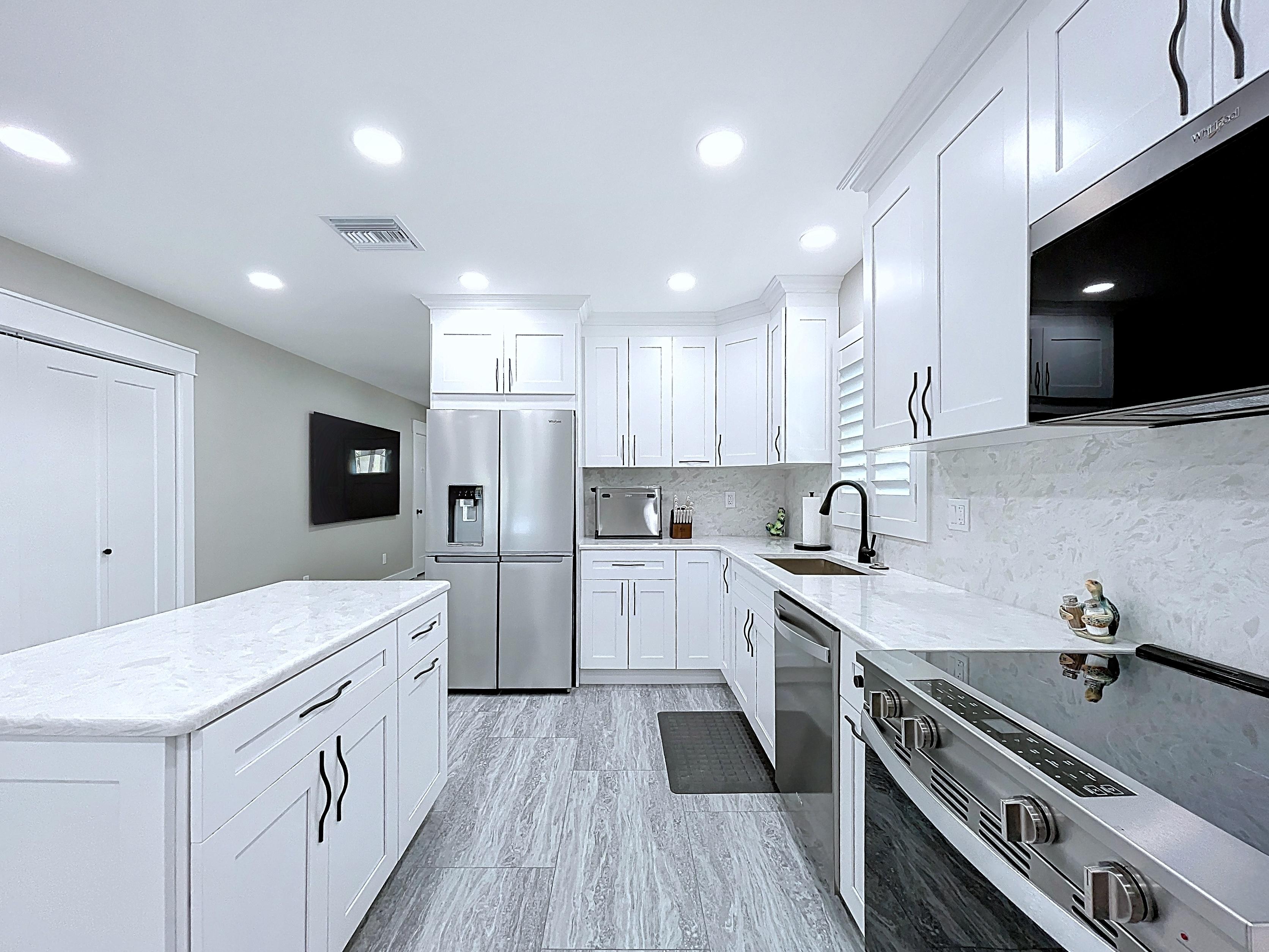 β Updated kitchen with premium cabinetry, stone-surface counters, built-in appliances, and adjacent dining area (verify finishes)