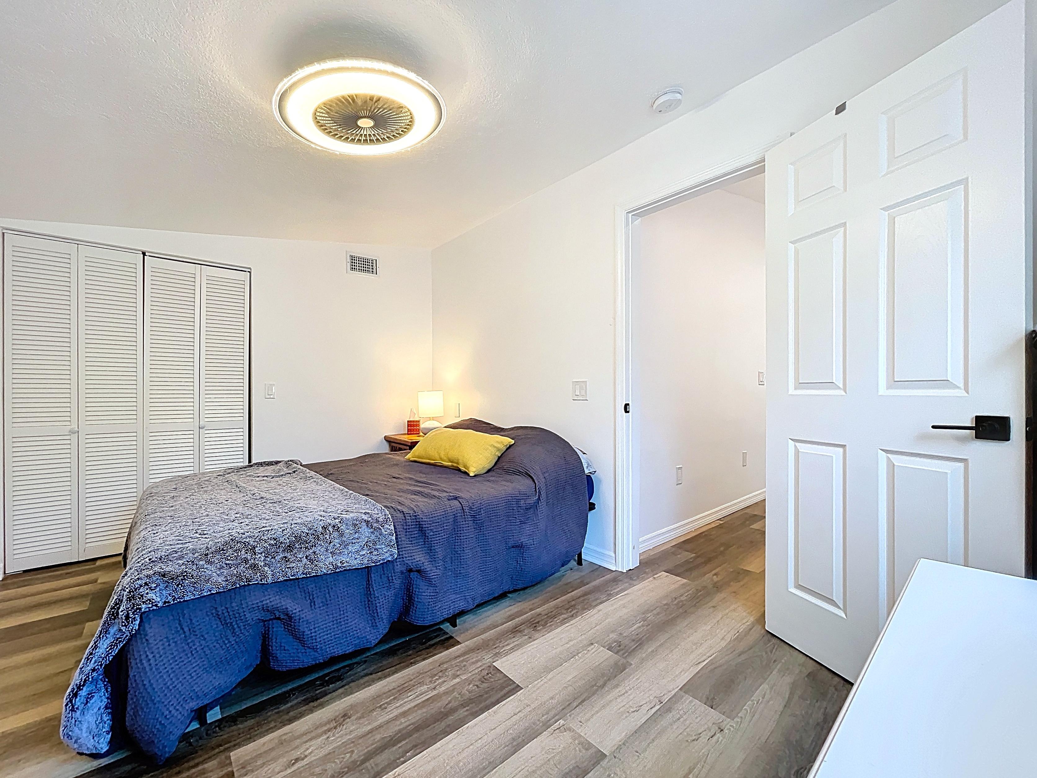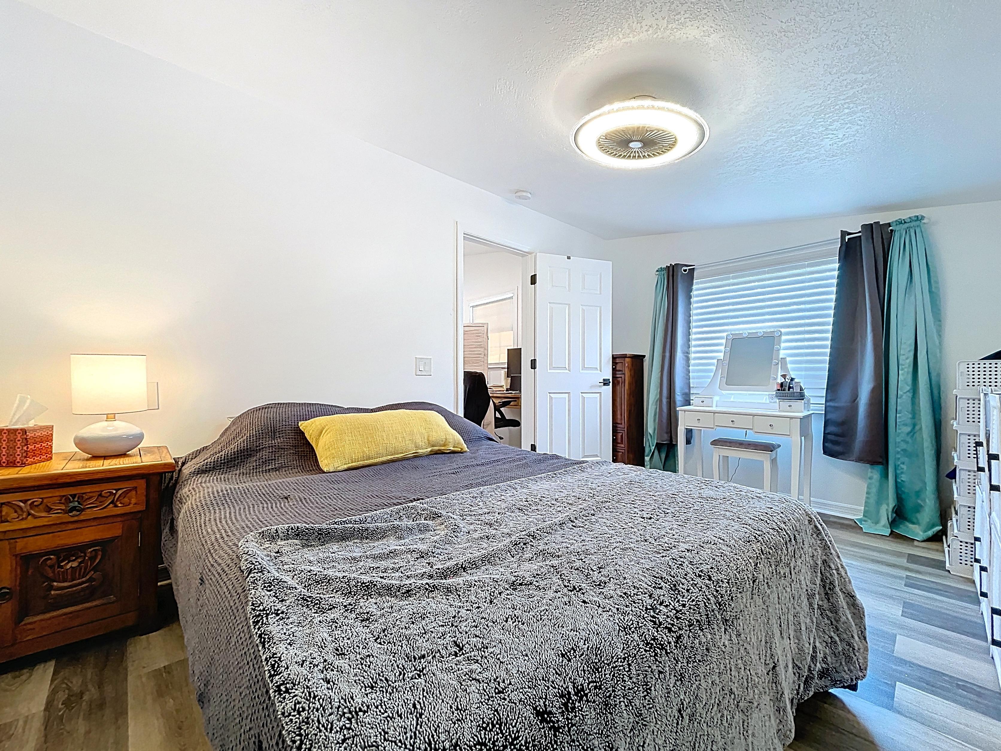 Interior Highlights: Bright open floorplan featuring vaulted ceilings; living/dining combo; updated kitchen with quartz countertops, solid wood cabinets, and stainless steel appliances; newer flooring; spacious bedrooms and a tiled bathroom with separate tub and shower