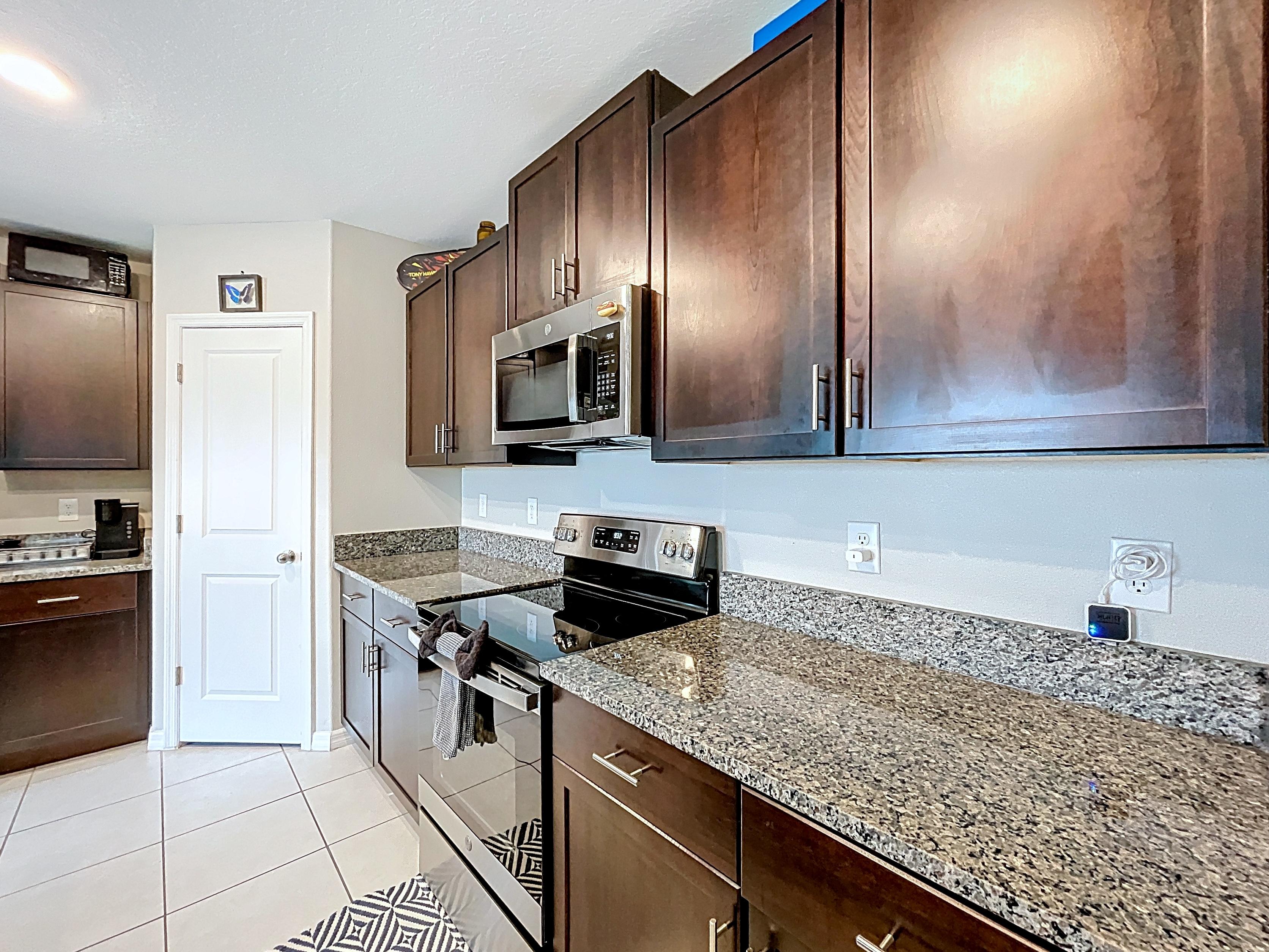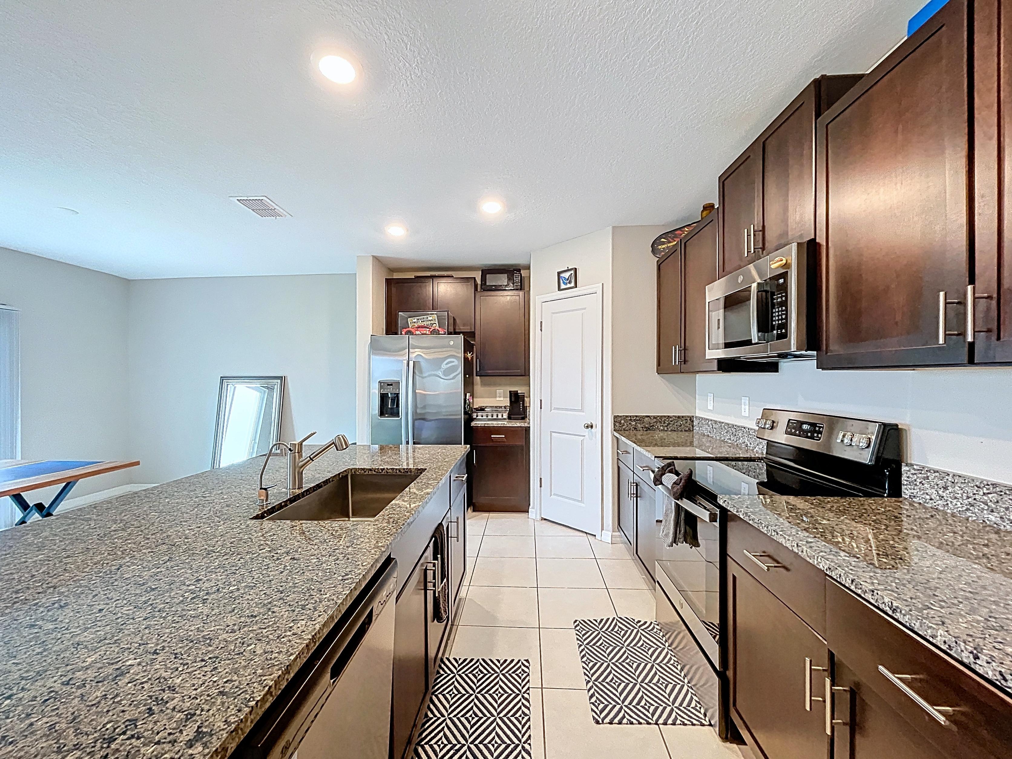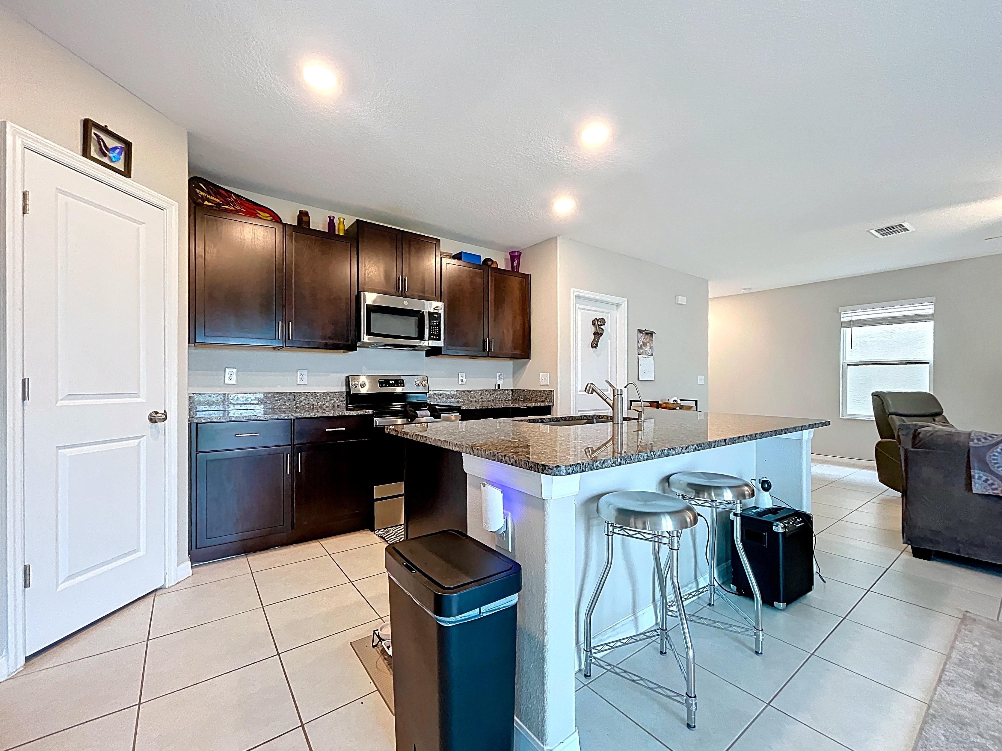 โ Contemporary kitchen with shaker cabinetry, solid-surface counters, pantry, and center island (verify finishes/appliances)
