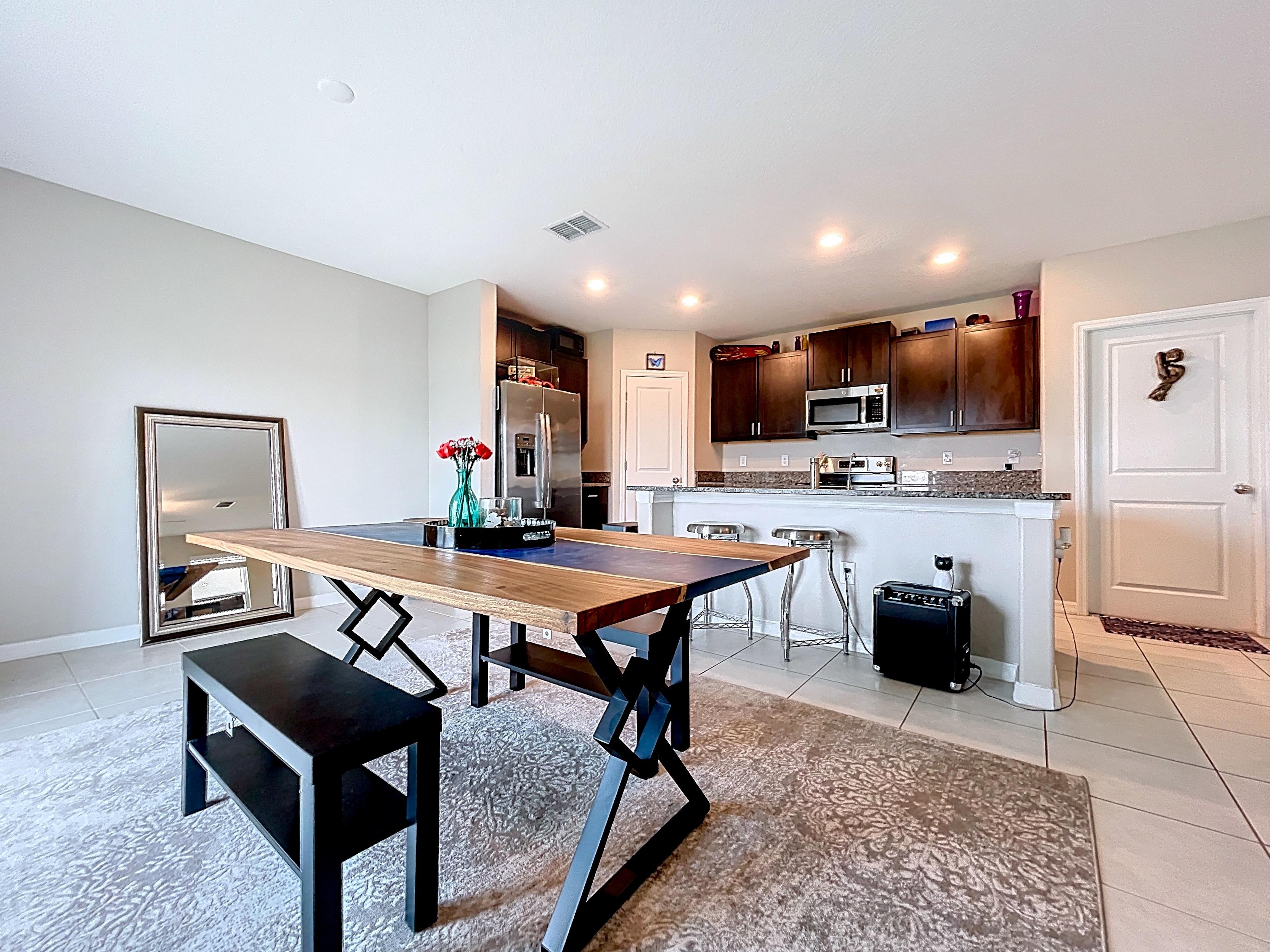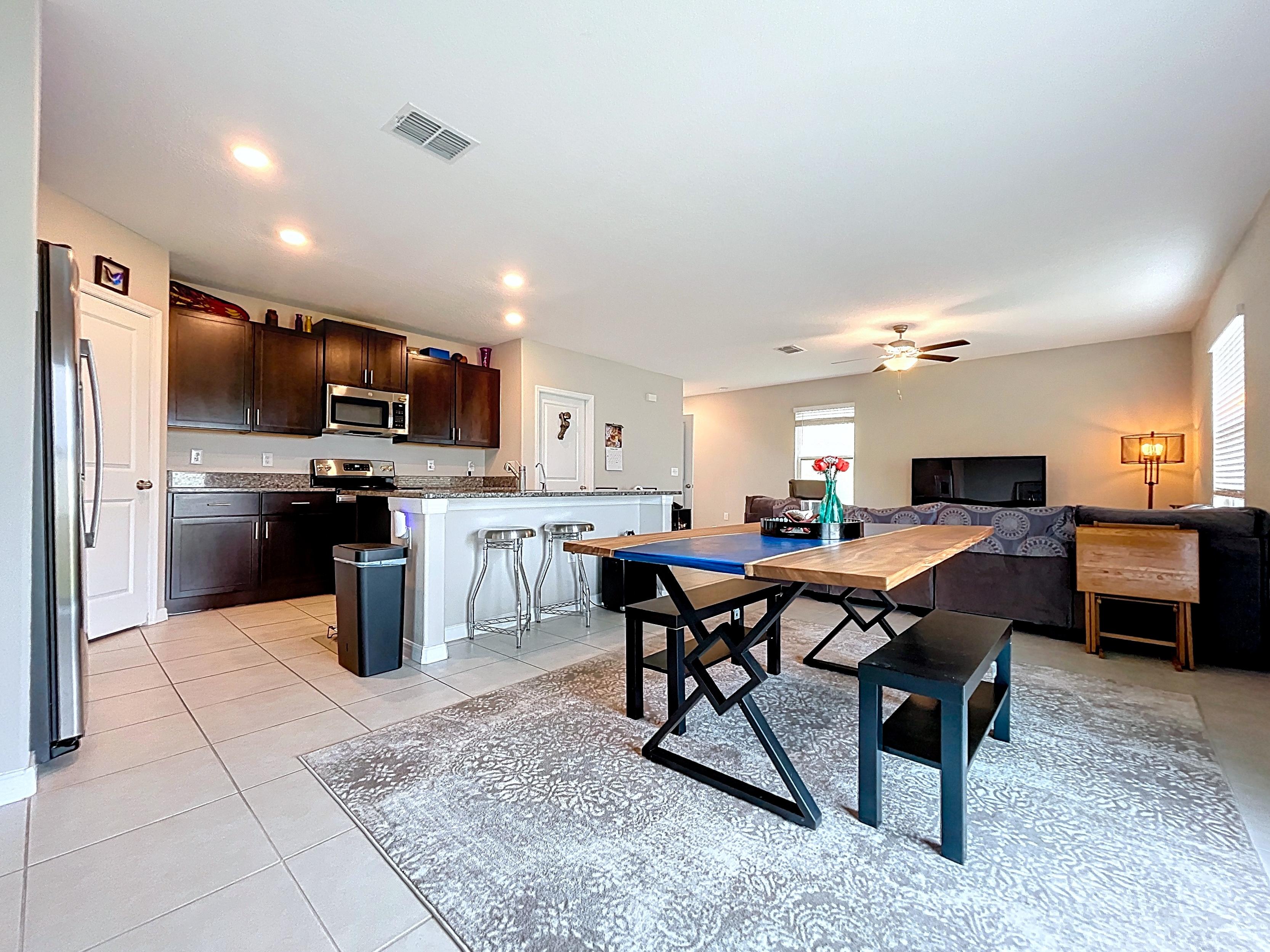 โ Open-concept living and dining area with natural light