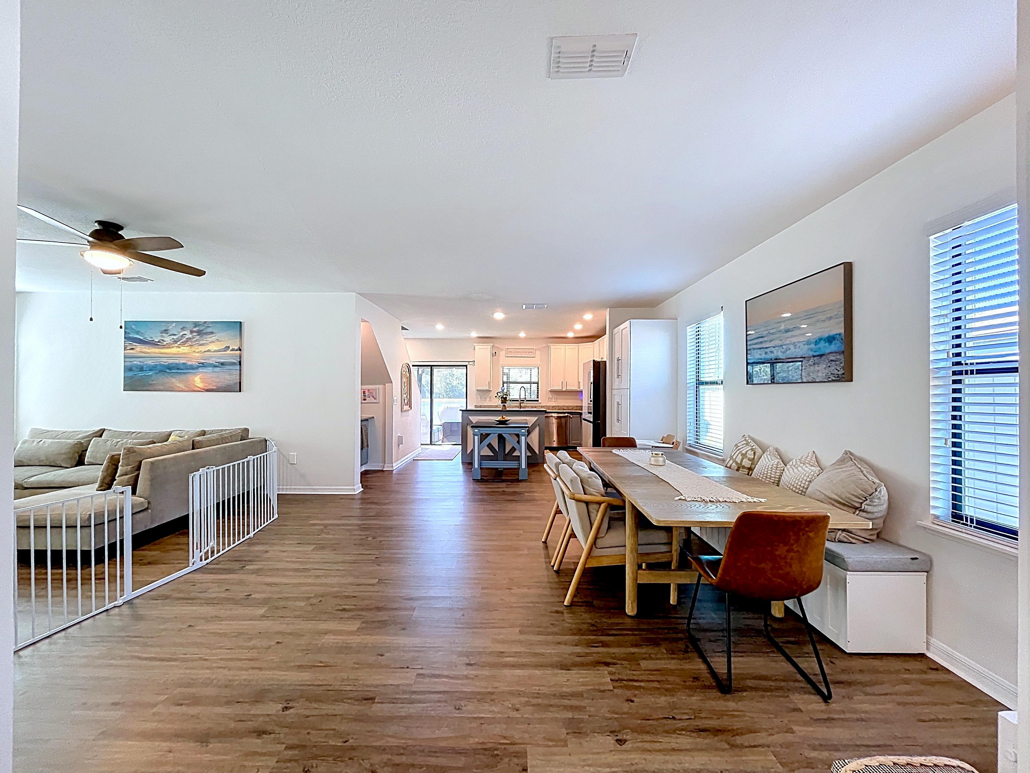 β Open-concept living, dining, and kitchen layout with neutral finishes