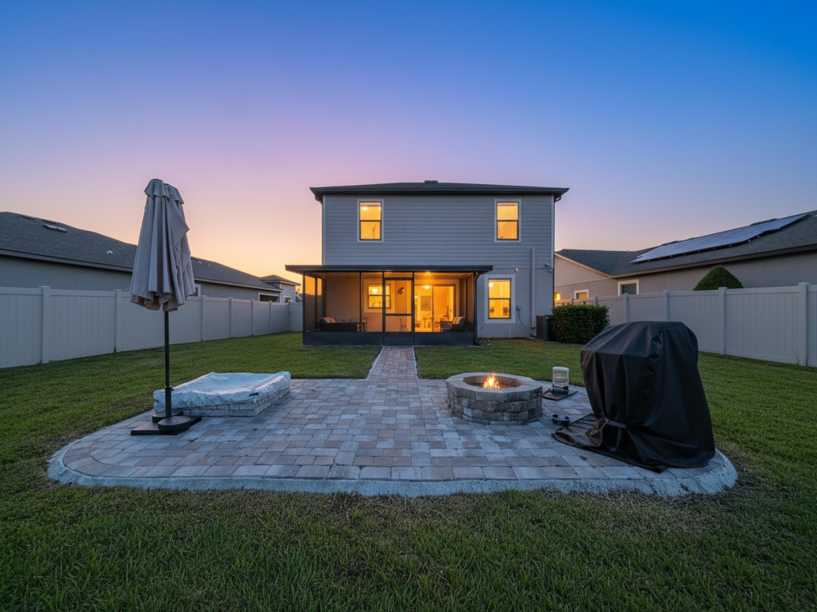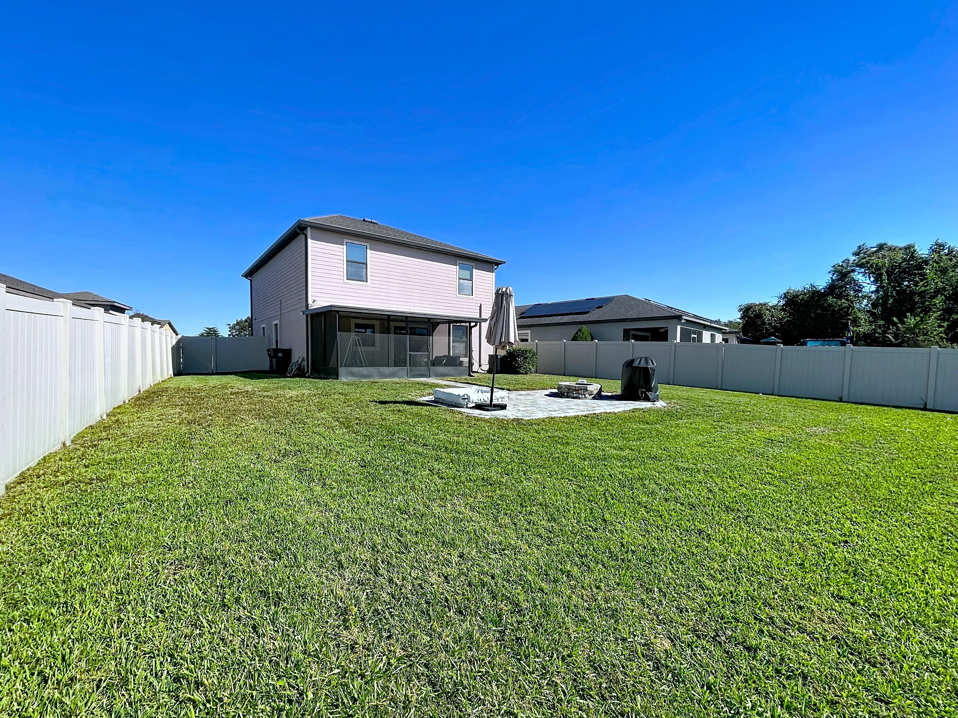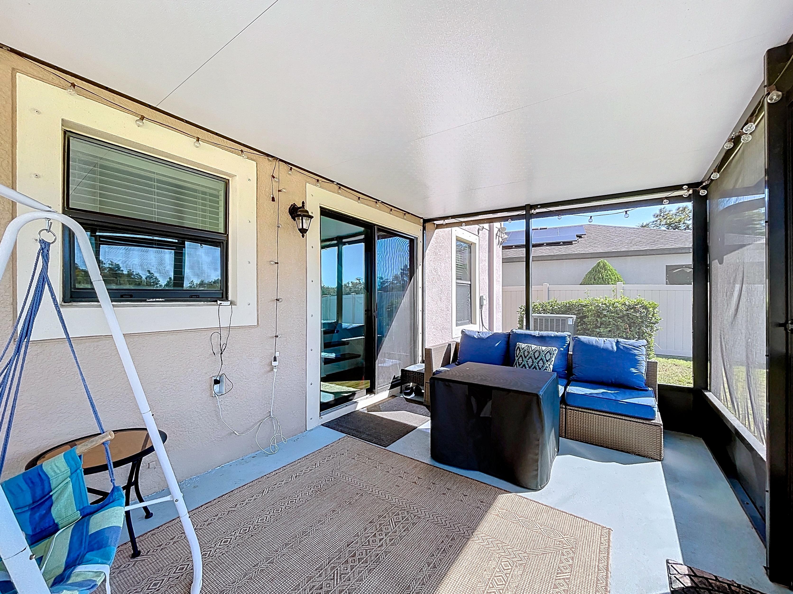 β Covered lanai overlooking fenced backyard with space for grilling or play area